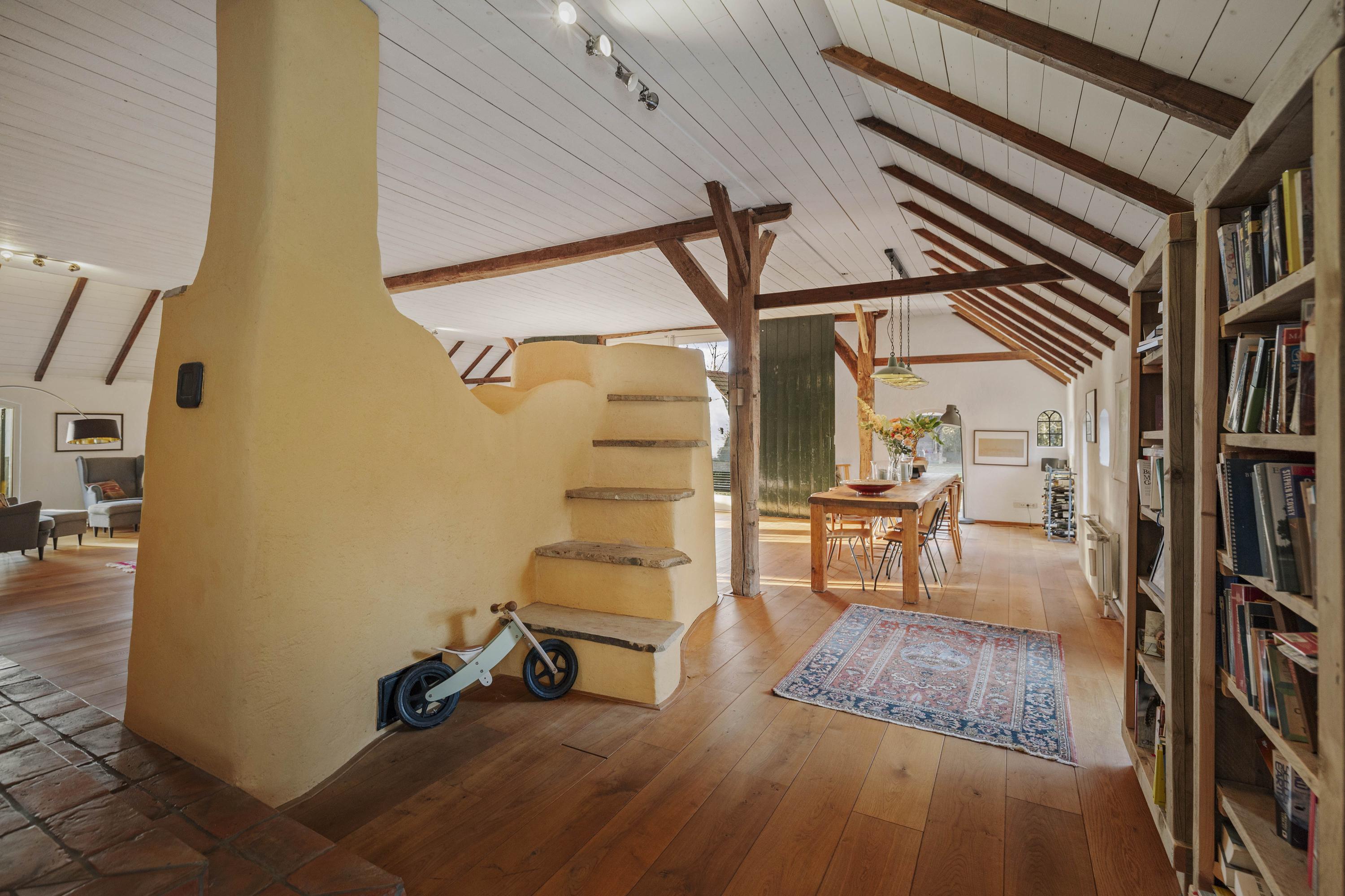 Nach fachgerechter Restaurierung begeistert das Haus mit einem markanten T-förmigen Grundriss, einem 2021 erneuerten Reetdach sowie Terrakotta- oder Eichenholzböden. Die traditionelle Scheune—zu über 150 m² Wohnfläche umgebaut—bewahrt die originalen Dachstühle und verfügt über einen hocheffizienten Lehmofen für Wärme und Warmwasser. Die moderne Küche, perfekt für ambitioniertes Kochen, punktet mit satinierten Blaustein-Arbeitsflächen, hochwertigen Geräten und großzügigem Stauraum und vereint gekonnt nostalgischen Charme mit zeitgemäßem Komfort.