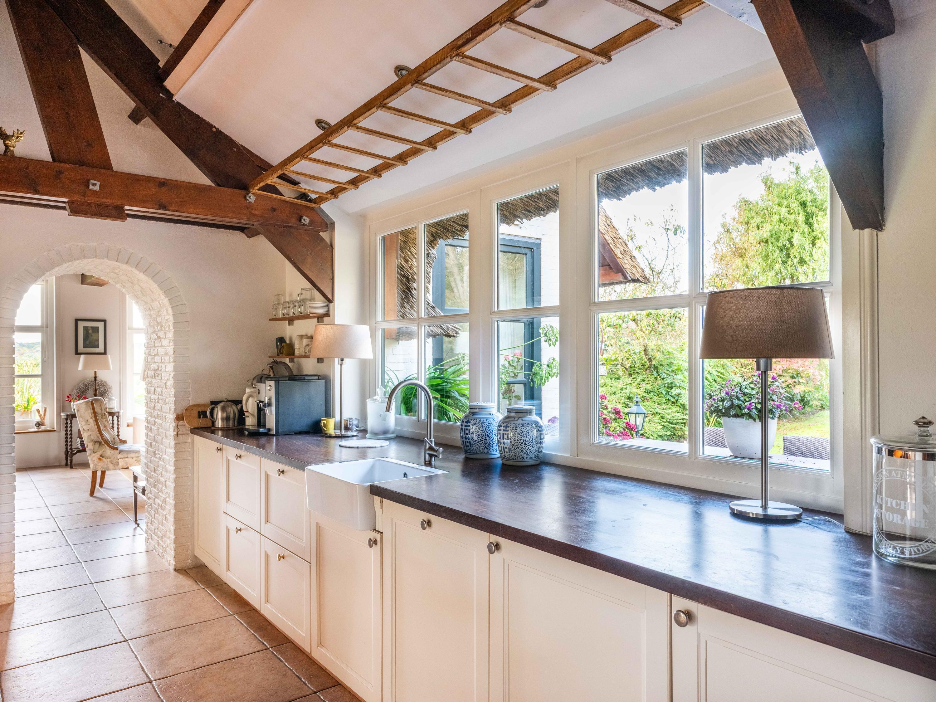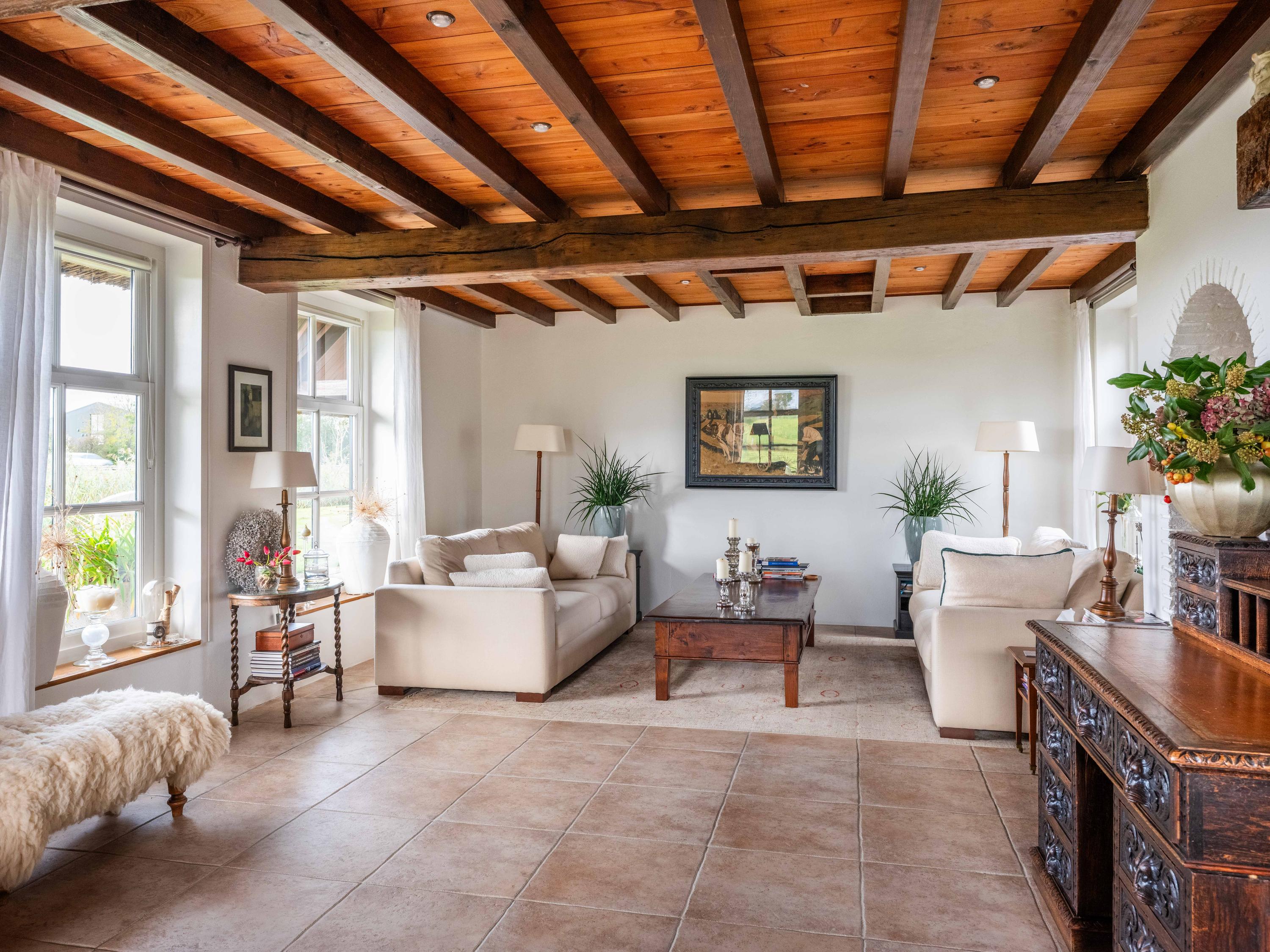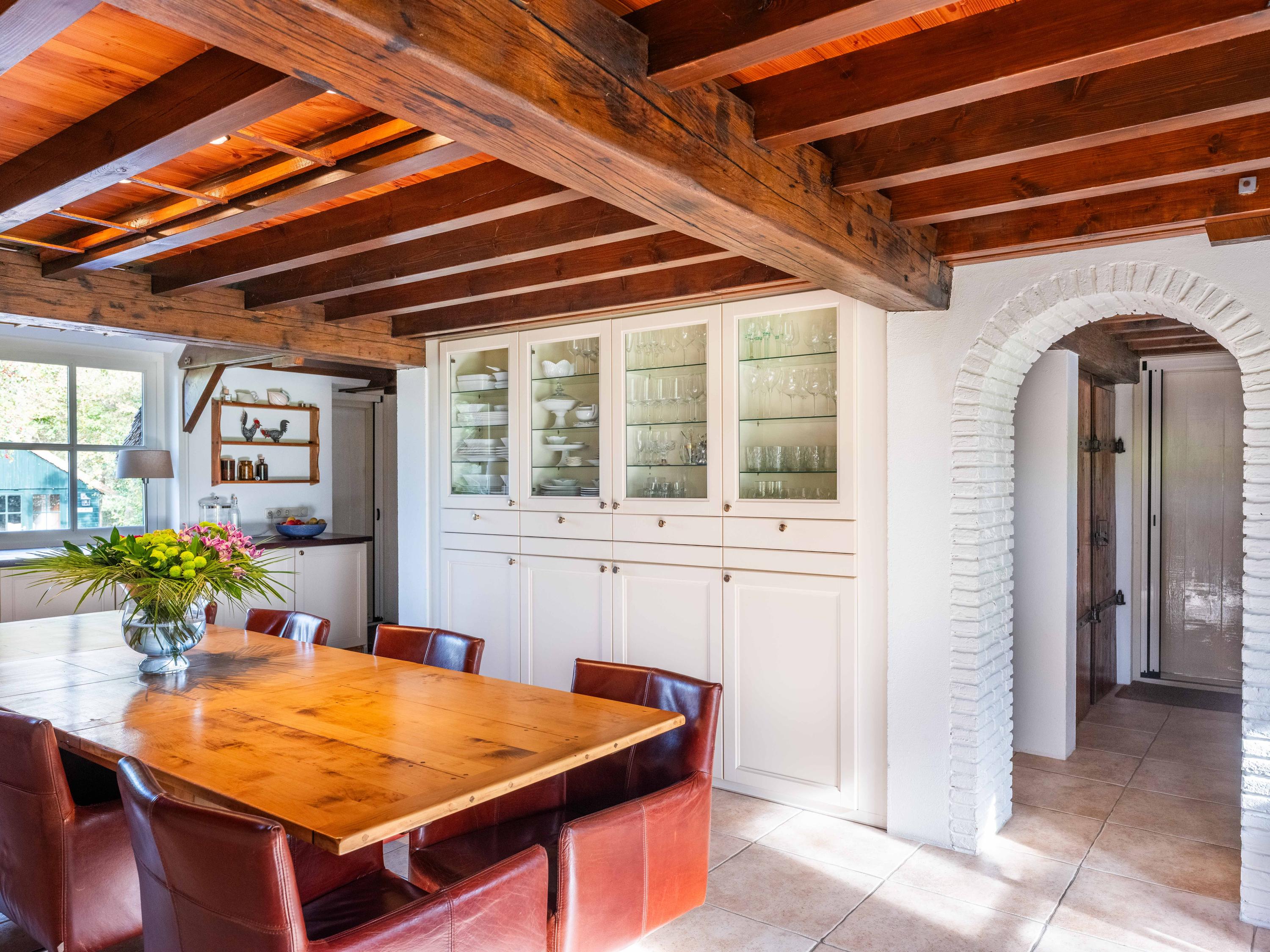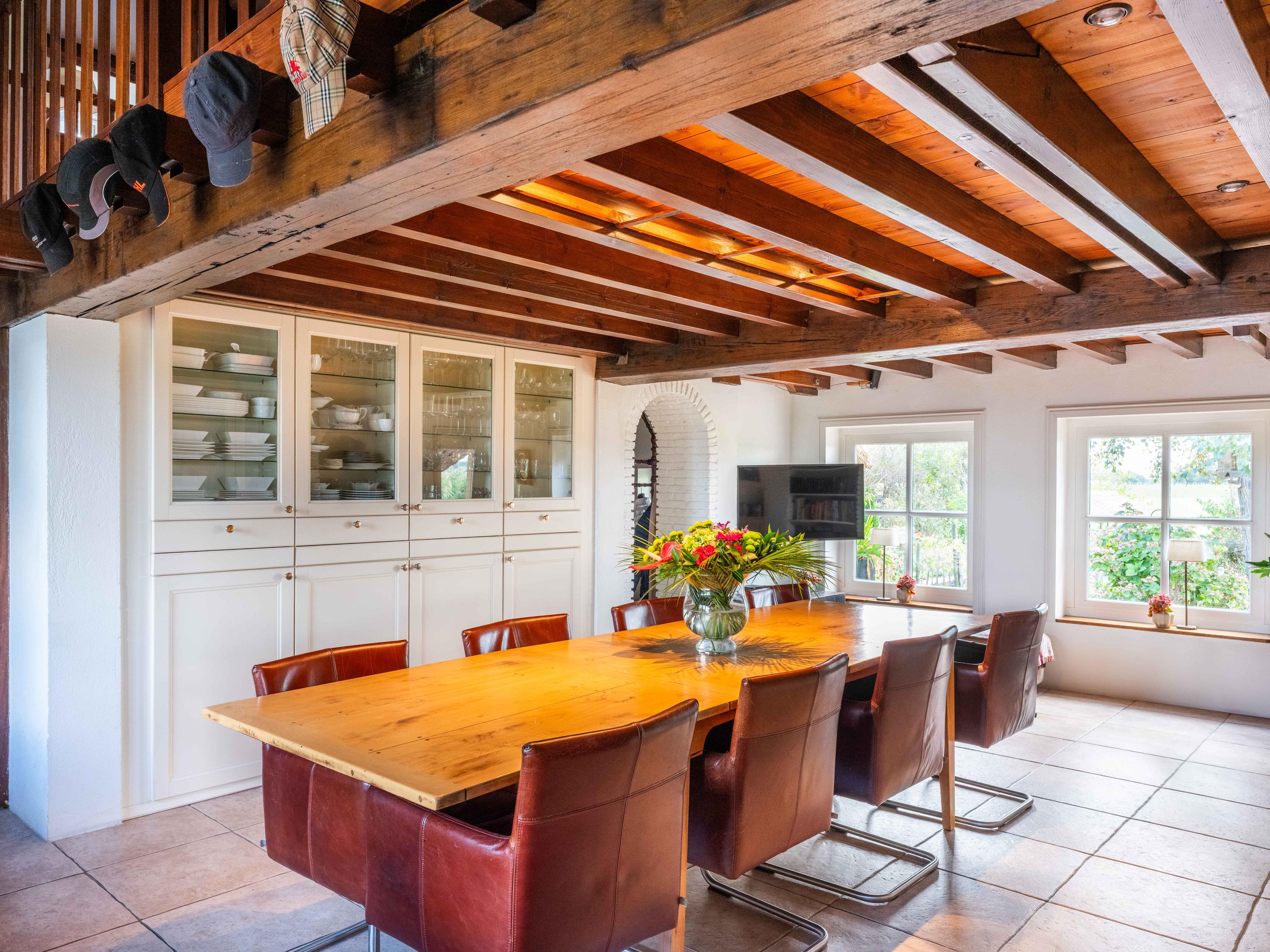 Das 224 m² große Wohnhaus vereint Landhausstil mit modernem Komfort. Vollständige Isolierung, Energieklasse A, Fußbodenheizung und ein synthetisch gedecktes Reetdach bieten das ganze Jahr über höchste Wohnqualität. Die Eingangshalle mit Garderobe und Abstellraum führt in einen lichtdurchfluteten Essbereich und eine offene Küche. Authentische Materialien—Balkendecken, Einbauschränke und ein englischer Herd—prägen die großzügige, einladende und funktionale Küche, die fließend in das weitläufige Wohnzimmer übergeht. Hier tanzt das Tageslicht über Wasser und Garten, ein Holzofen sorgt für behagliche Atmosphäre.