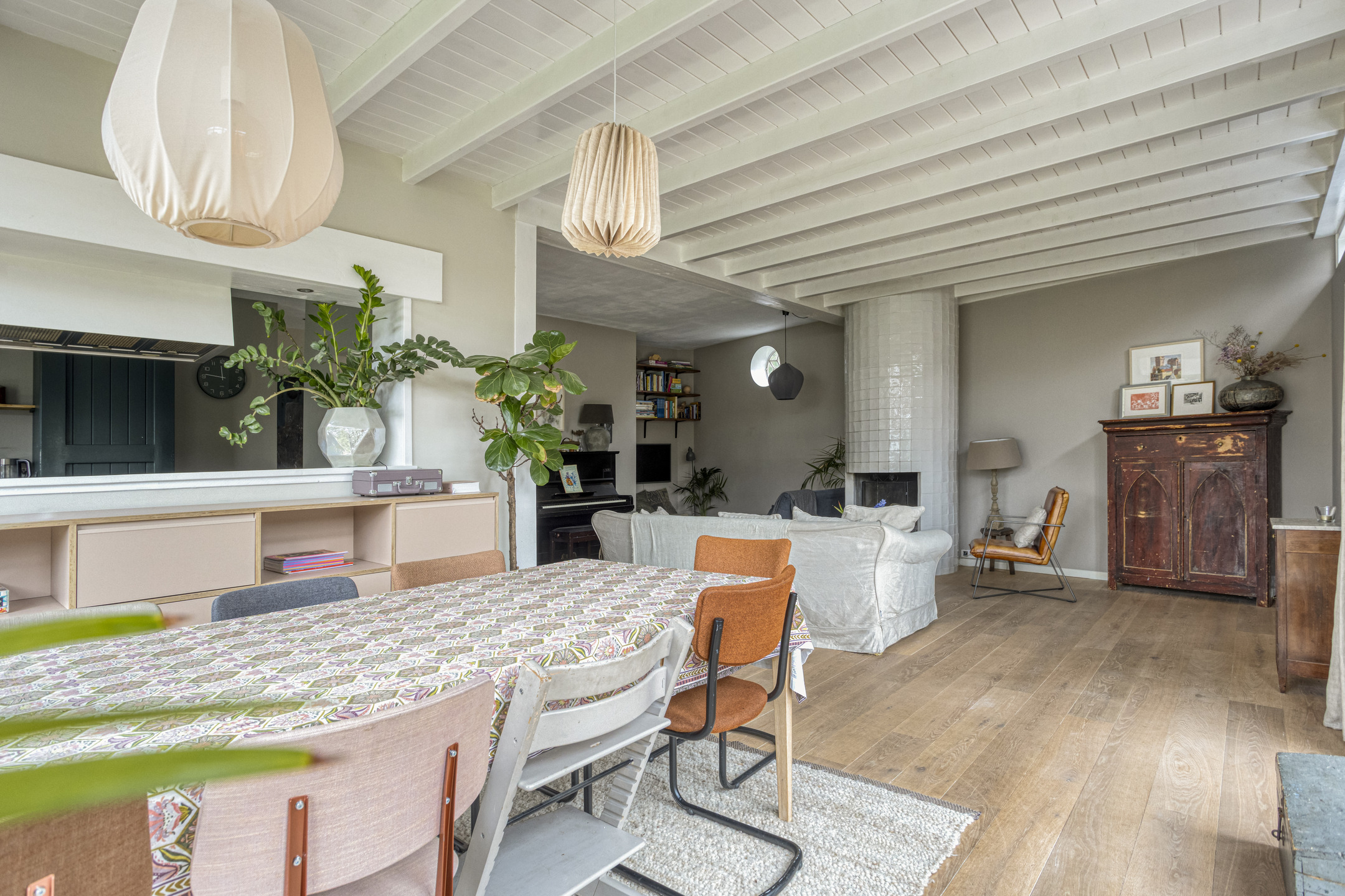 Ground floor: Entrance with hall, wardrobe and separate toilet. Side room, now used as a bedroom. Front room, now used as a bedroom / guest room. Open living room with central fireplace and adjacent to the garden a dining area for 12 people with patio doors to the garden. Semi-open kitchen with breakfast corner. Passage from the living room to the annex.
