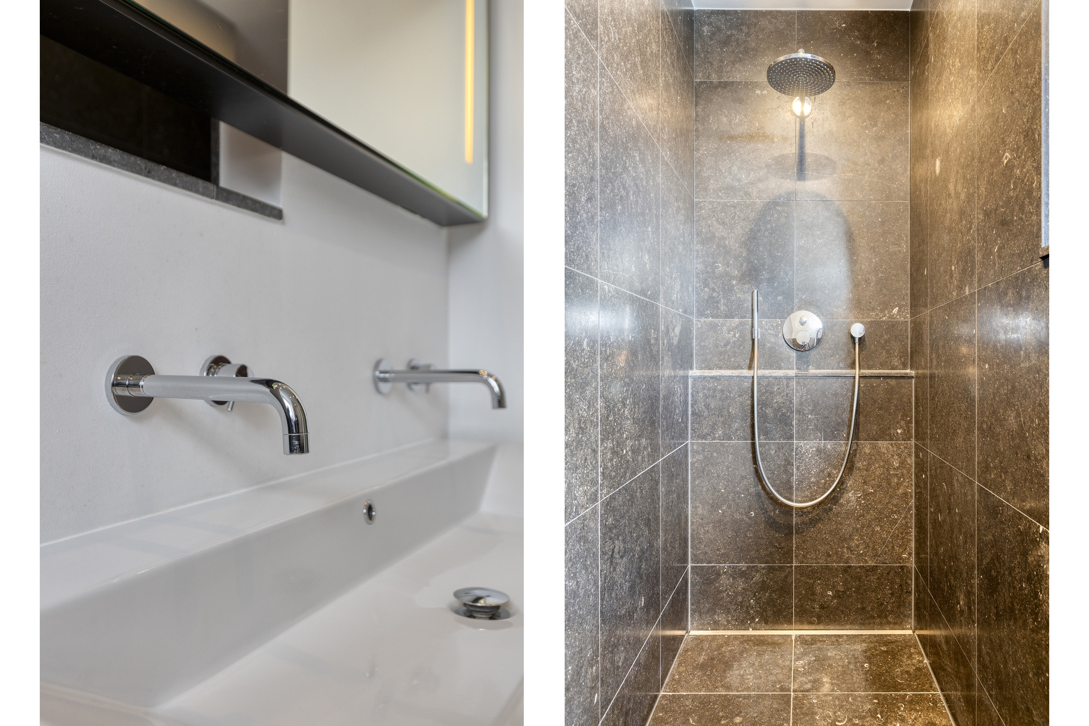 Second luxurious bathroom (for children or guests): finished in natural stone; with dormer window; large walk-in shower and double wash basin.