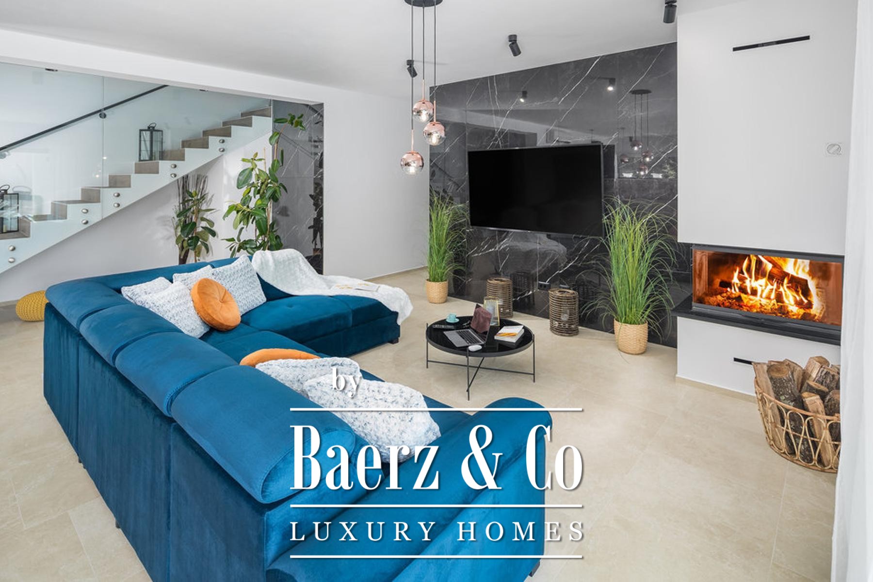 bathroom, and each room has direct access to its own terrace with a beautiful view of nature.On the plot there is a sunbathing area, a heated pool with a heat pump with a total size of 38.50 m2, and a covered area with a barbecue and a place to dine with your loved ones.The best materials and equipment were used for this property, high quality construction, aluminum joinery, underfloor heating system through a heat pump. All rooms are air-conditioned. First-class parquet and ceramics, all furniture is designer and of well-known brands.A first-class property that deserves attention.For more information or to arrange a viewing, please feel free to contact us.