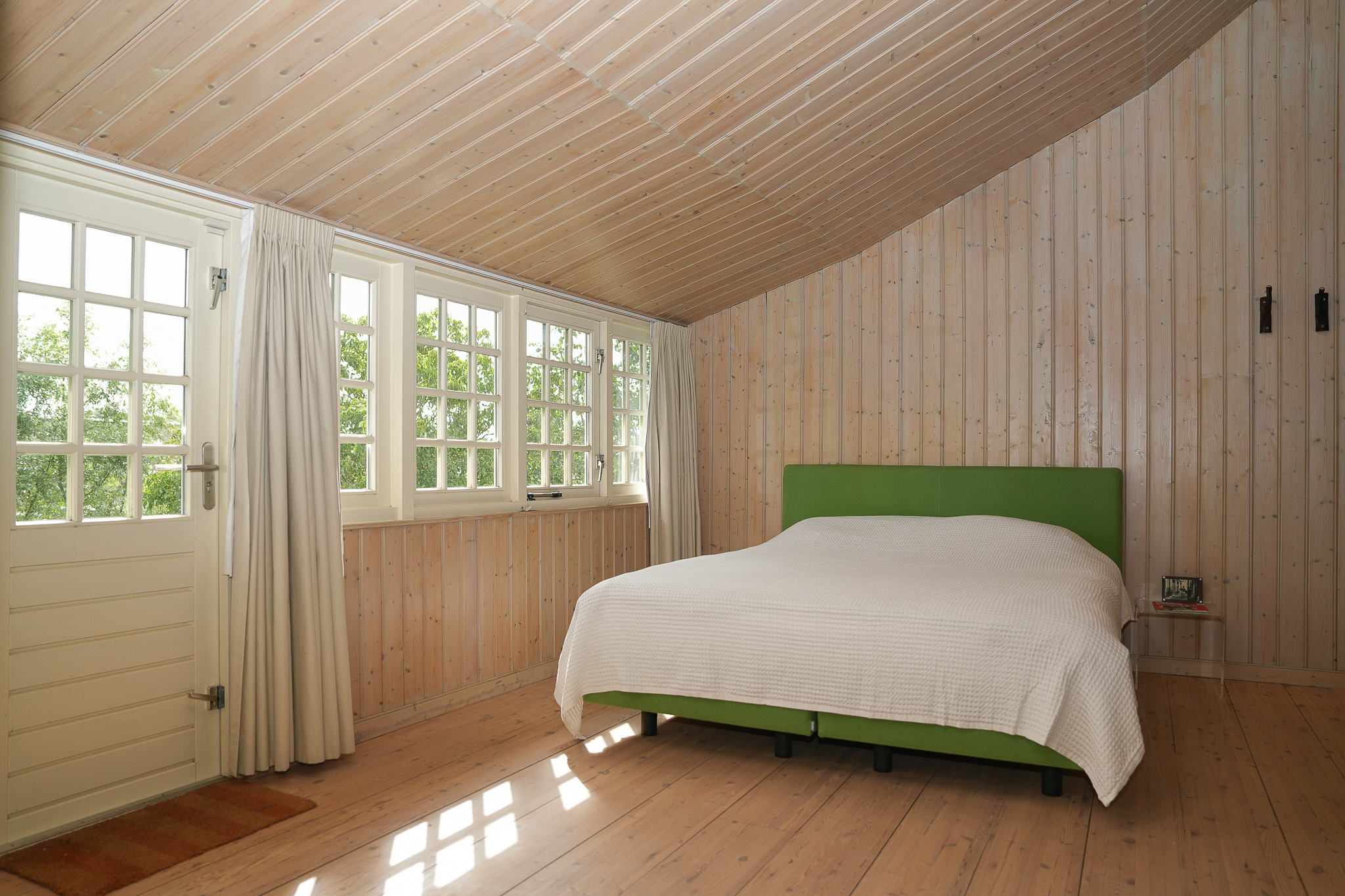 The entrance is located at the rear, by the elevated hardwood terrace. Through wide French doors with mullioned windows, you enter the impressive living space, where broad floorboards, a wood-fired stove, and large windows create a warm atmosphere.