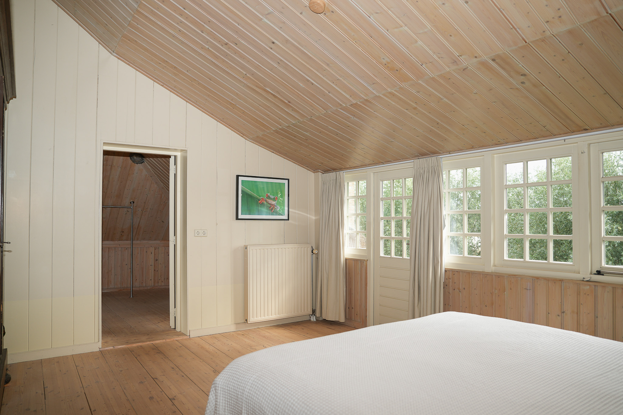 The east-facing bedroom spans the full depth of the house and is fitted with built-in wardrobes under the eaves. The master bedroom opens onto a wide balcony and an adjoining dressing room, currently in use as such but equally suited as an additional study or bathroom.