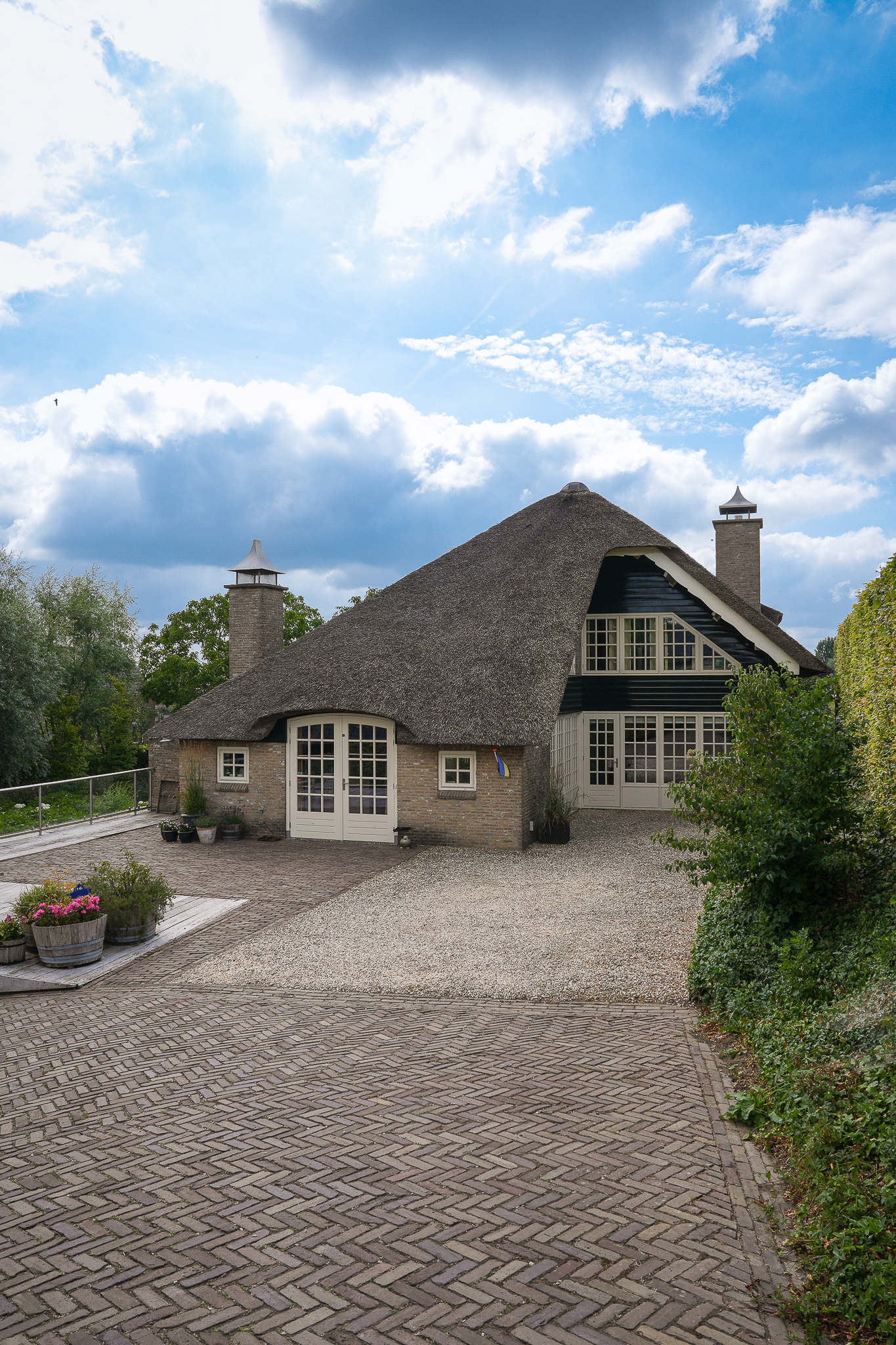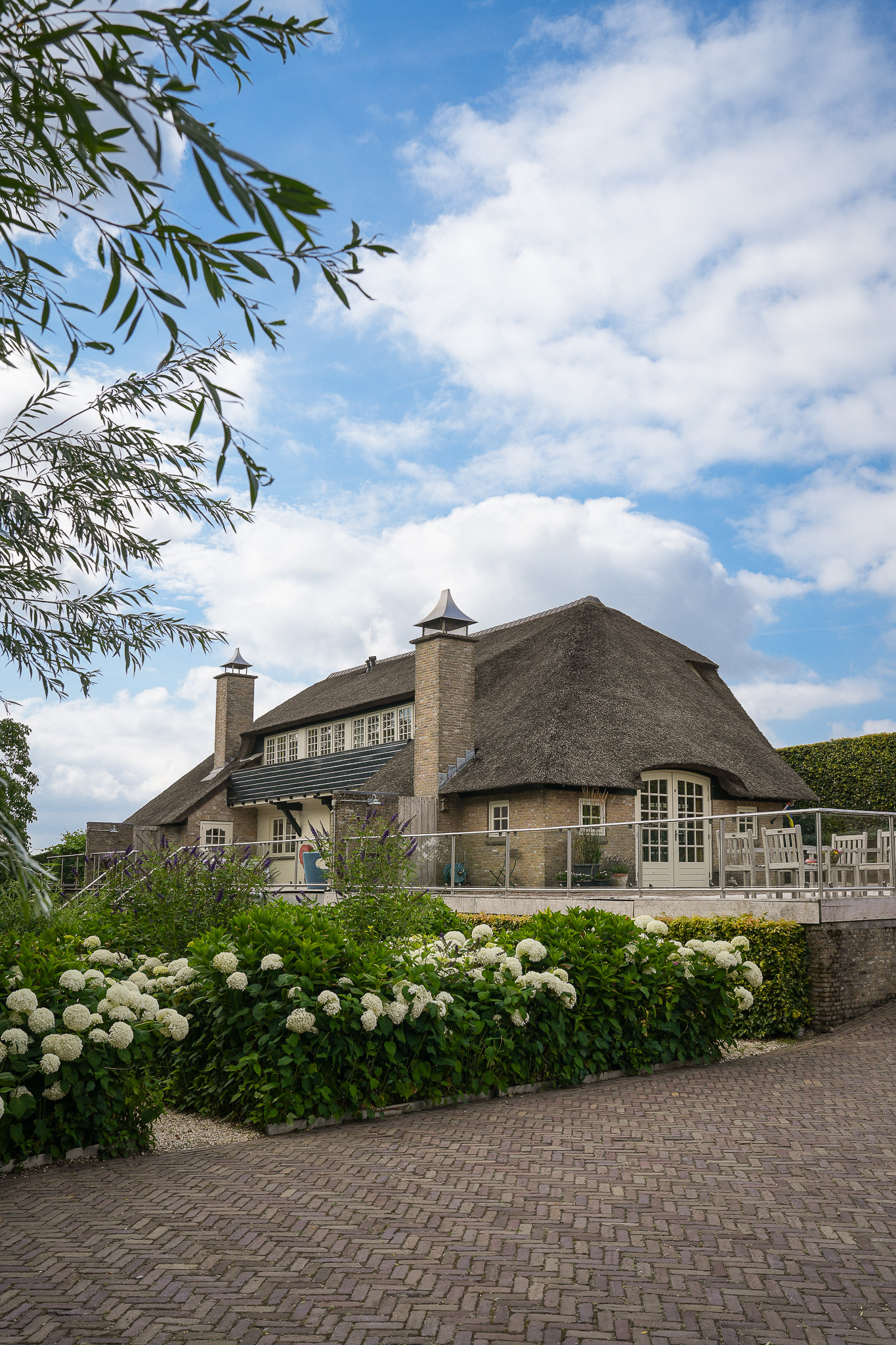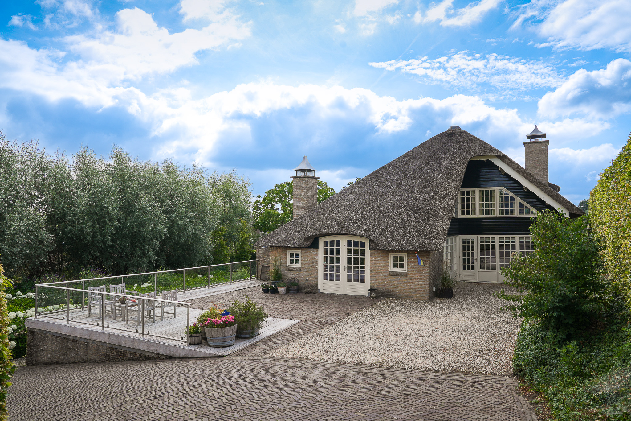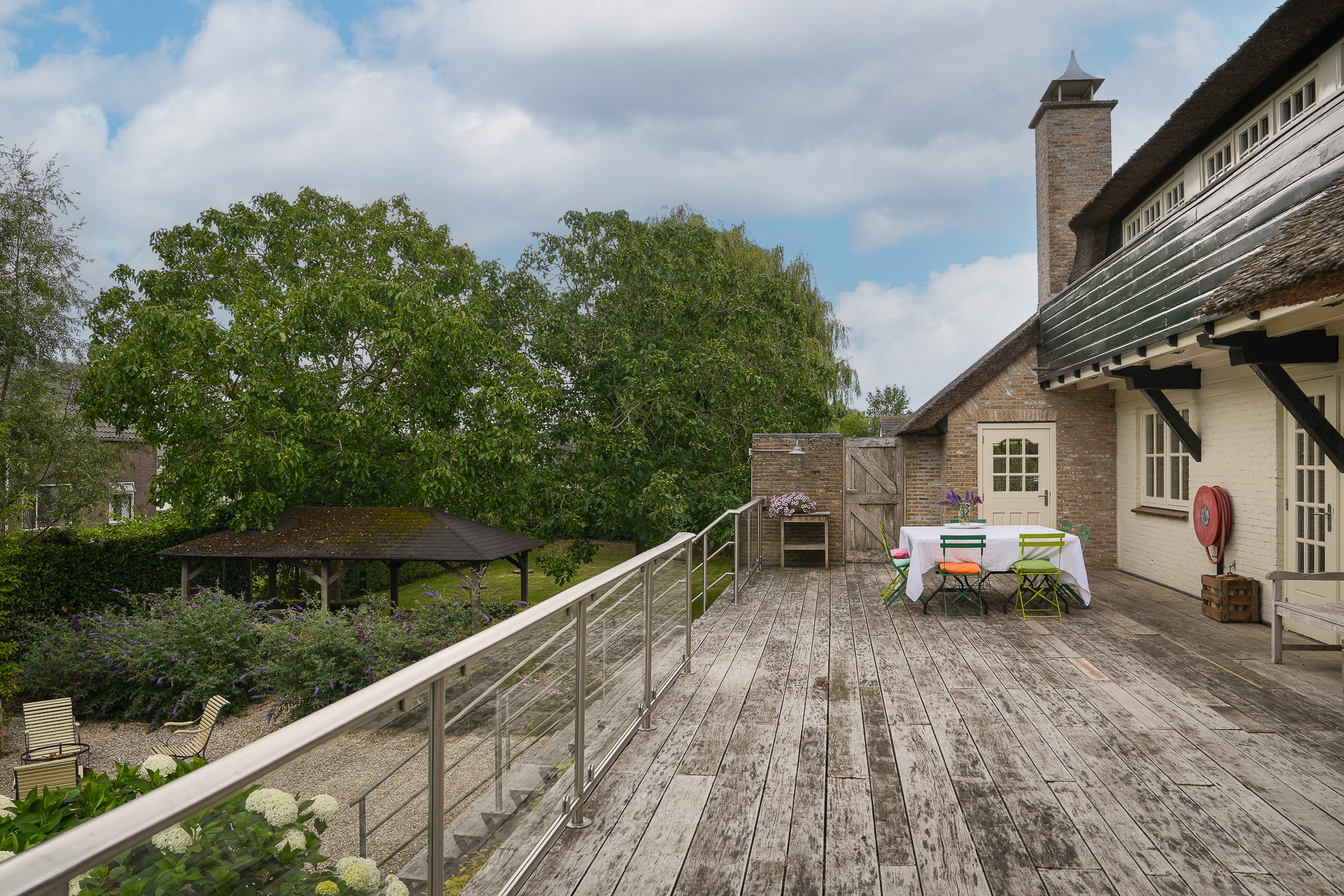 To the left of the driveway stands a solid outbuilding with a tiled roof, including a double carport, garage, and storage for motorcycles and bicycles. The garden has been landscaped for easy maintenance, with large hardwood terraces, transparent stainless-steel balustrades, decorative hydrangea borders, and a lawn with mature planting. The sloping bank along the dike is planted with, among others, periwinkle and barren strawberry.