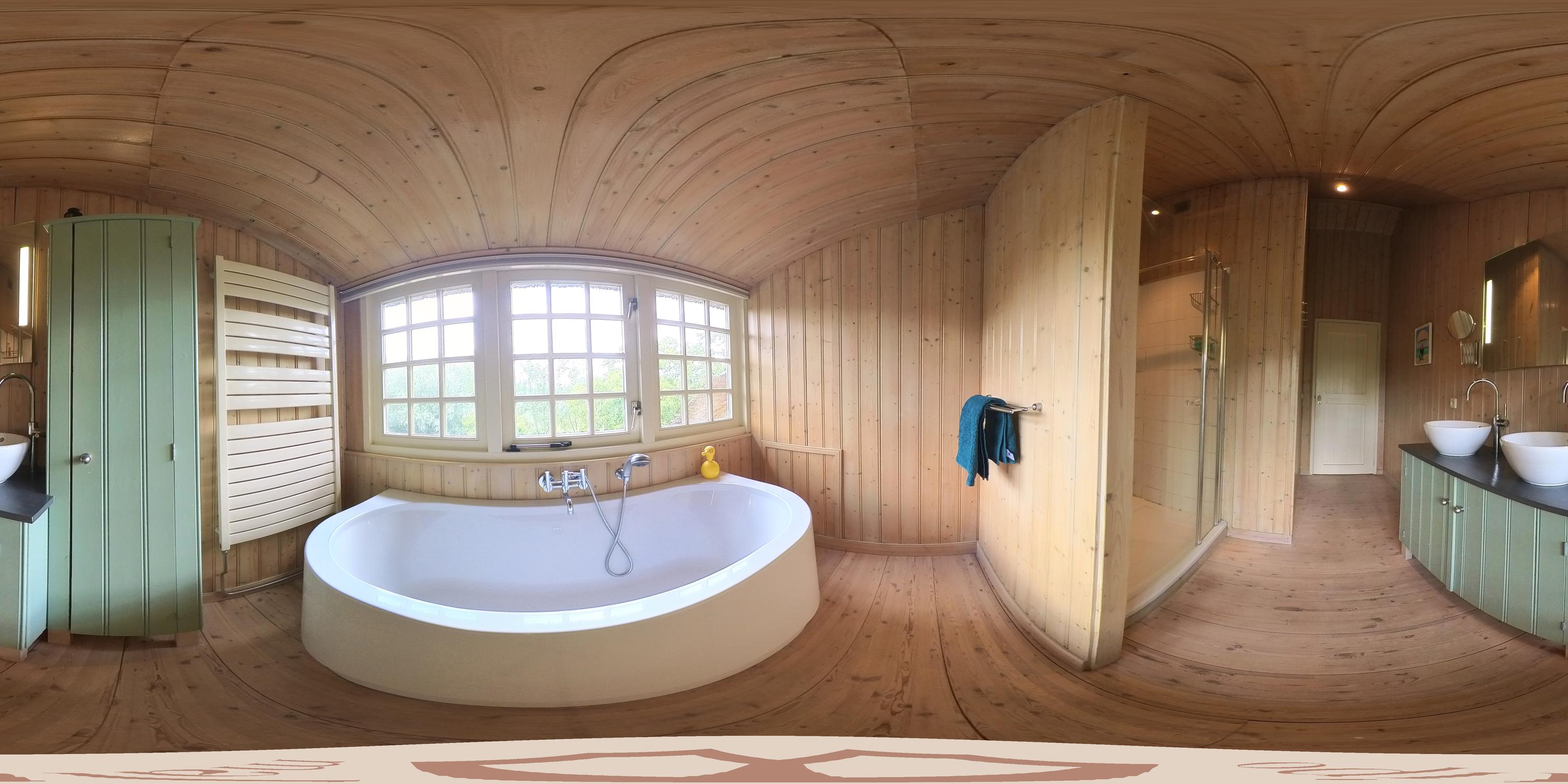 The two remaining bedrooms are playfully designed, with exposed roof beams and mullioned windows offering fine views of the surroundings. The bathroom, styled in line with the bedrooms, is fitted with a bathtub, shower cabin, and double washbasin.