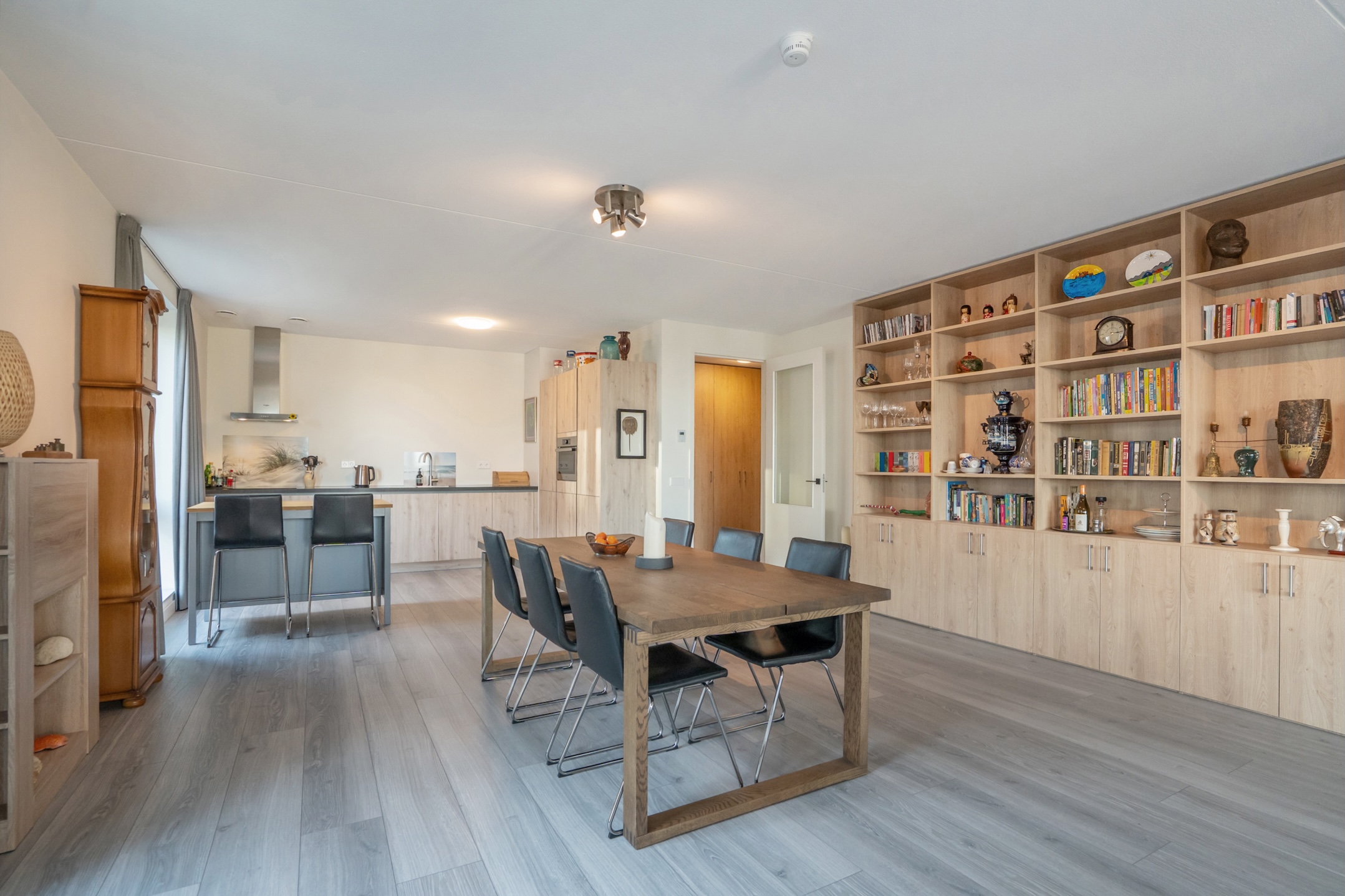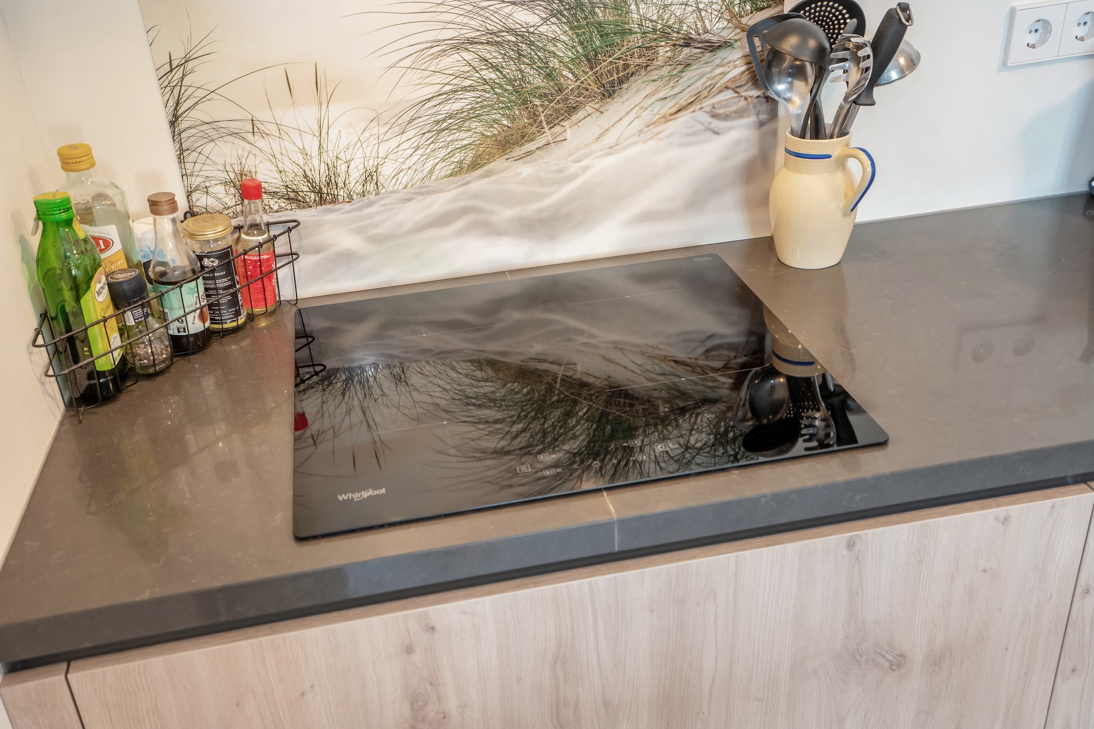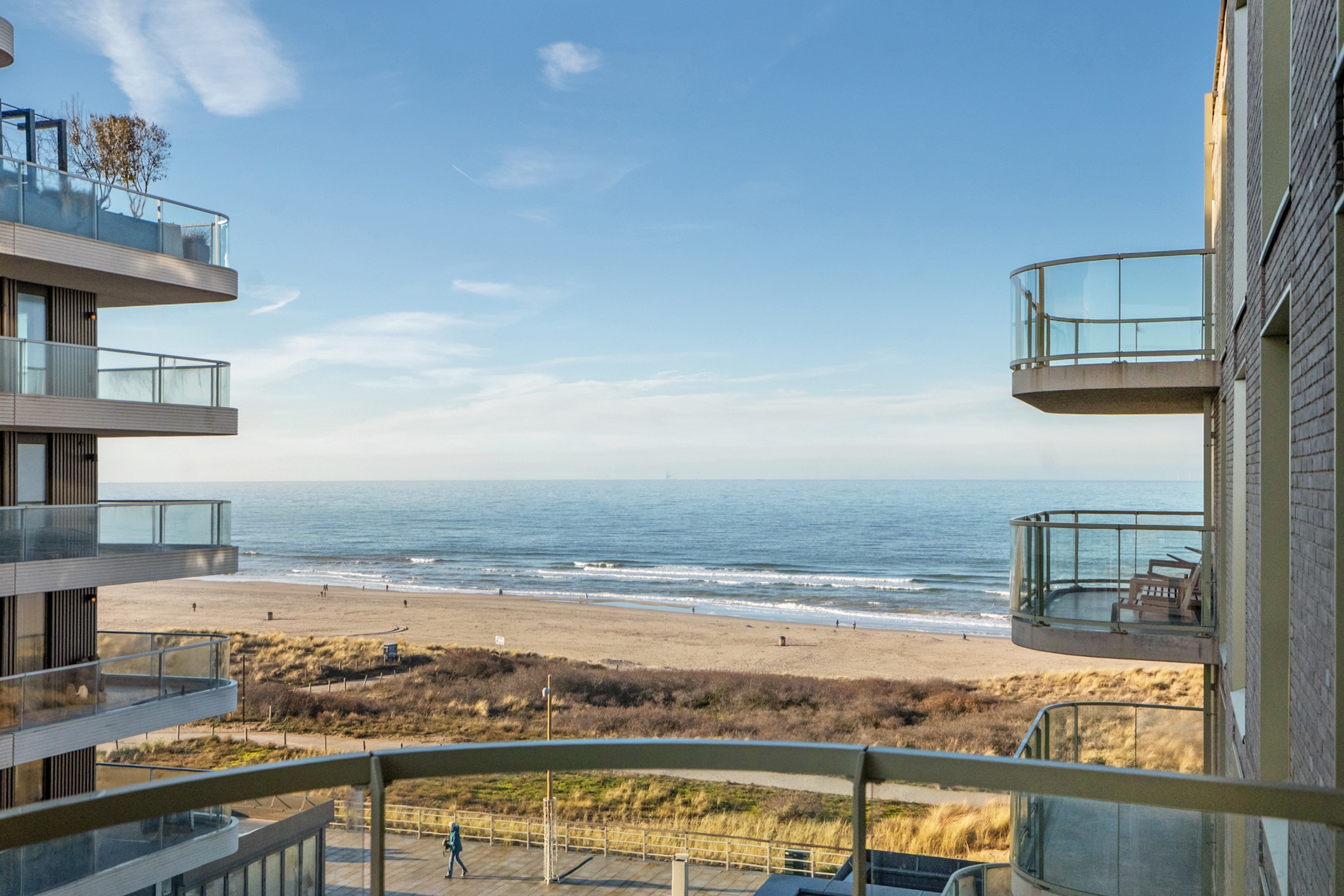 Behind the front door, you enter a spacious entrance hall with a wide closet wall for coats and shoes. There is also access to a separate deep toilet. Through a closed door, you enter the impressive living room with large floor-to-ceiling windows and the open kitchen, together creating a pleasant living space. A neat kitchen arranged along the width, equipped with all necessary built-in appliances such as a refrigerator, freezer, induction cooktop, combination microwave, and dishwasher. From the living room and kitchen, you always have a diagonal view of the sea.