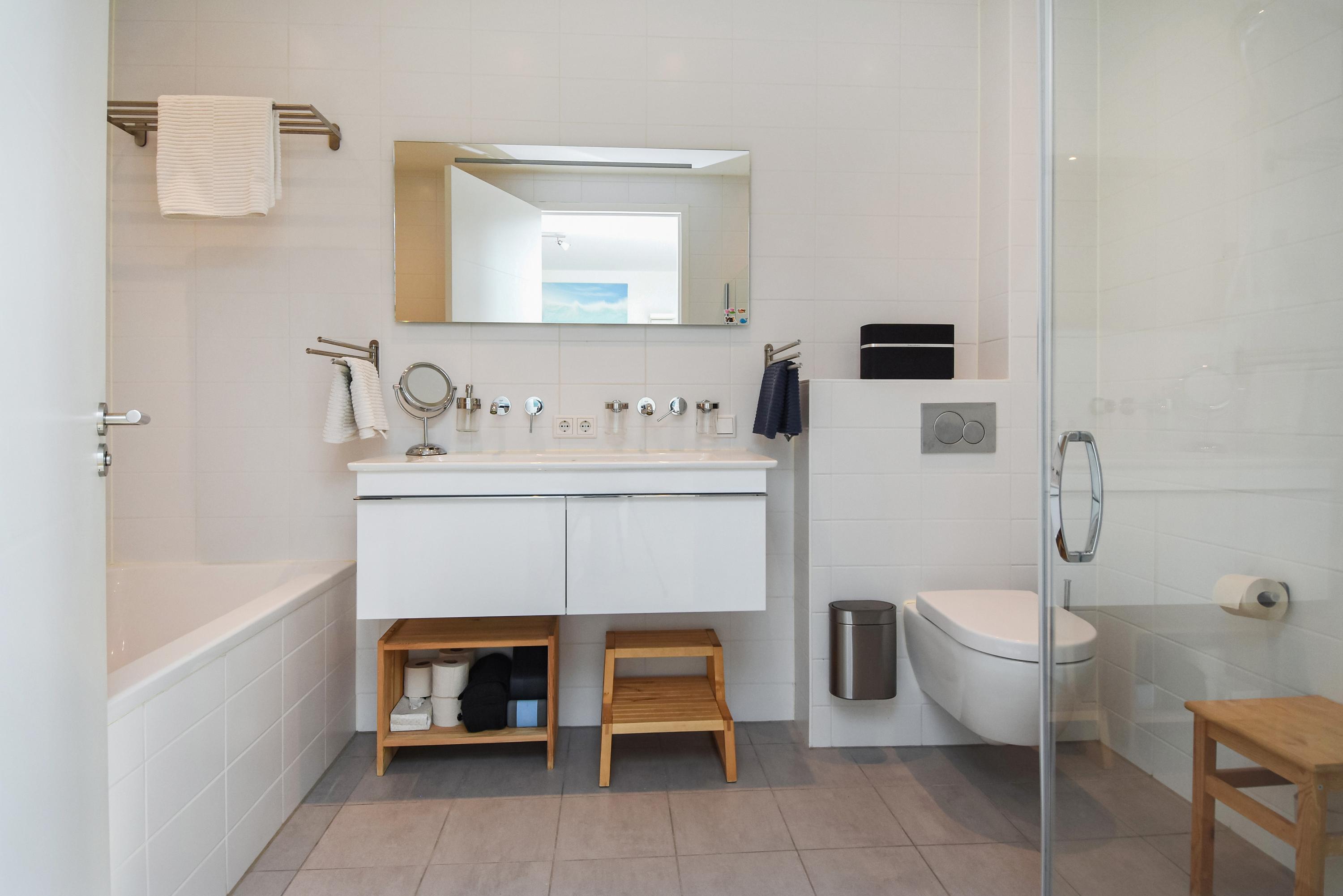 Floor-to-ceiling windows and high ceilings create luminous interiors, while solid oak floors and underfloor heating offer tactile comfort. Double doors open from the main living area to a southeast-facing garden of approximately 58 m², directly adjoining the private park reserved for residents. The ground and upper levels, connected by a fixed staircase, provide expansive spaces for family life or privacy.
