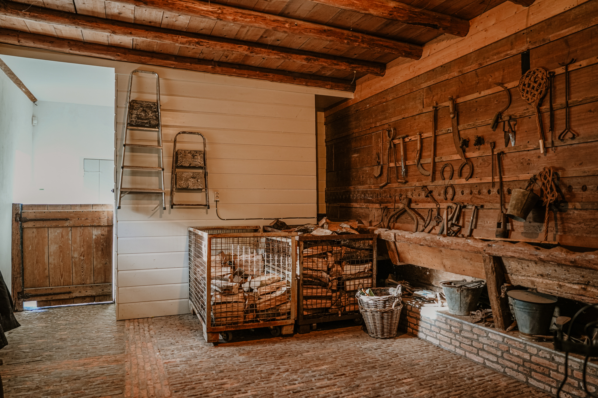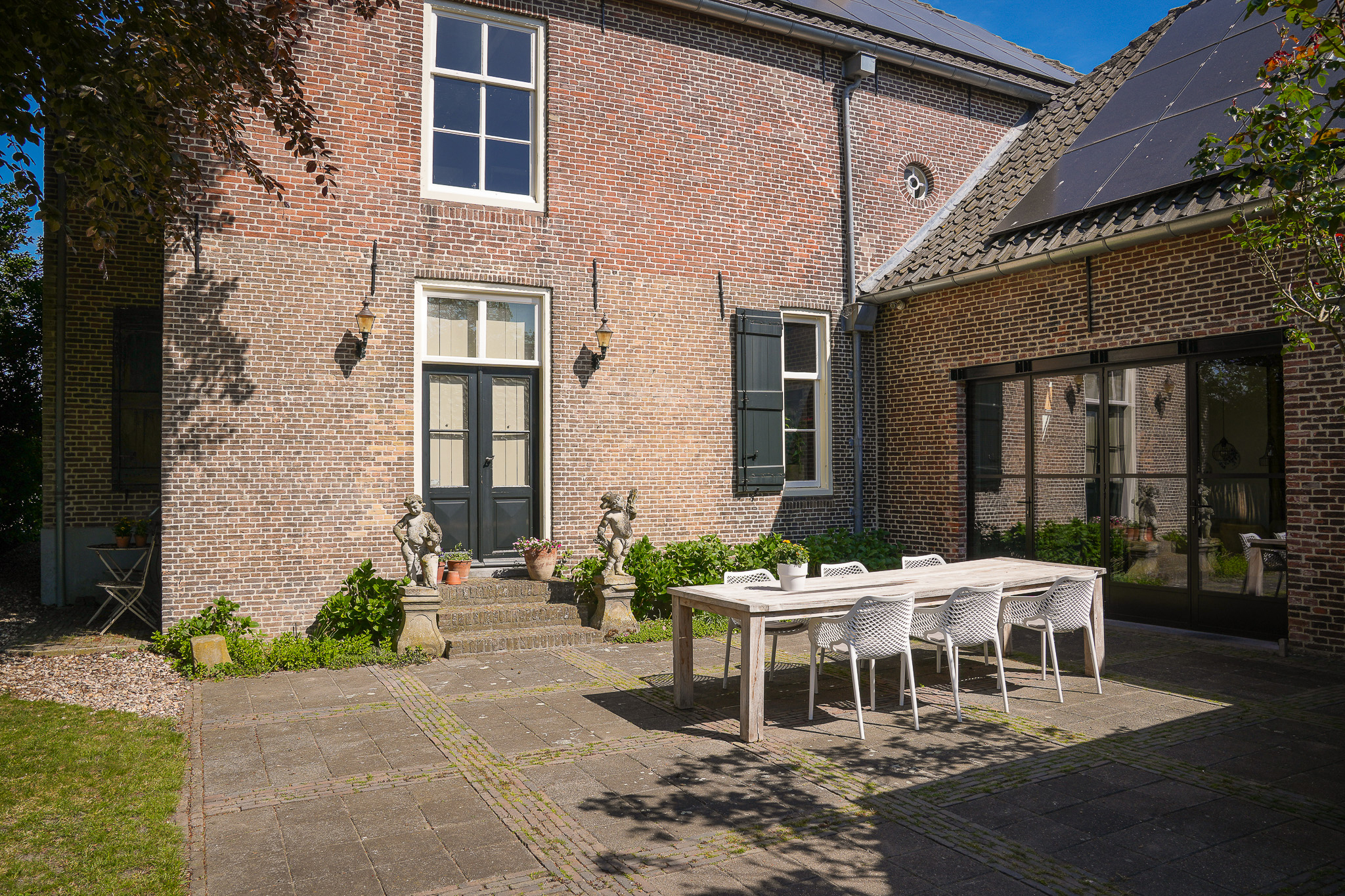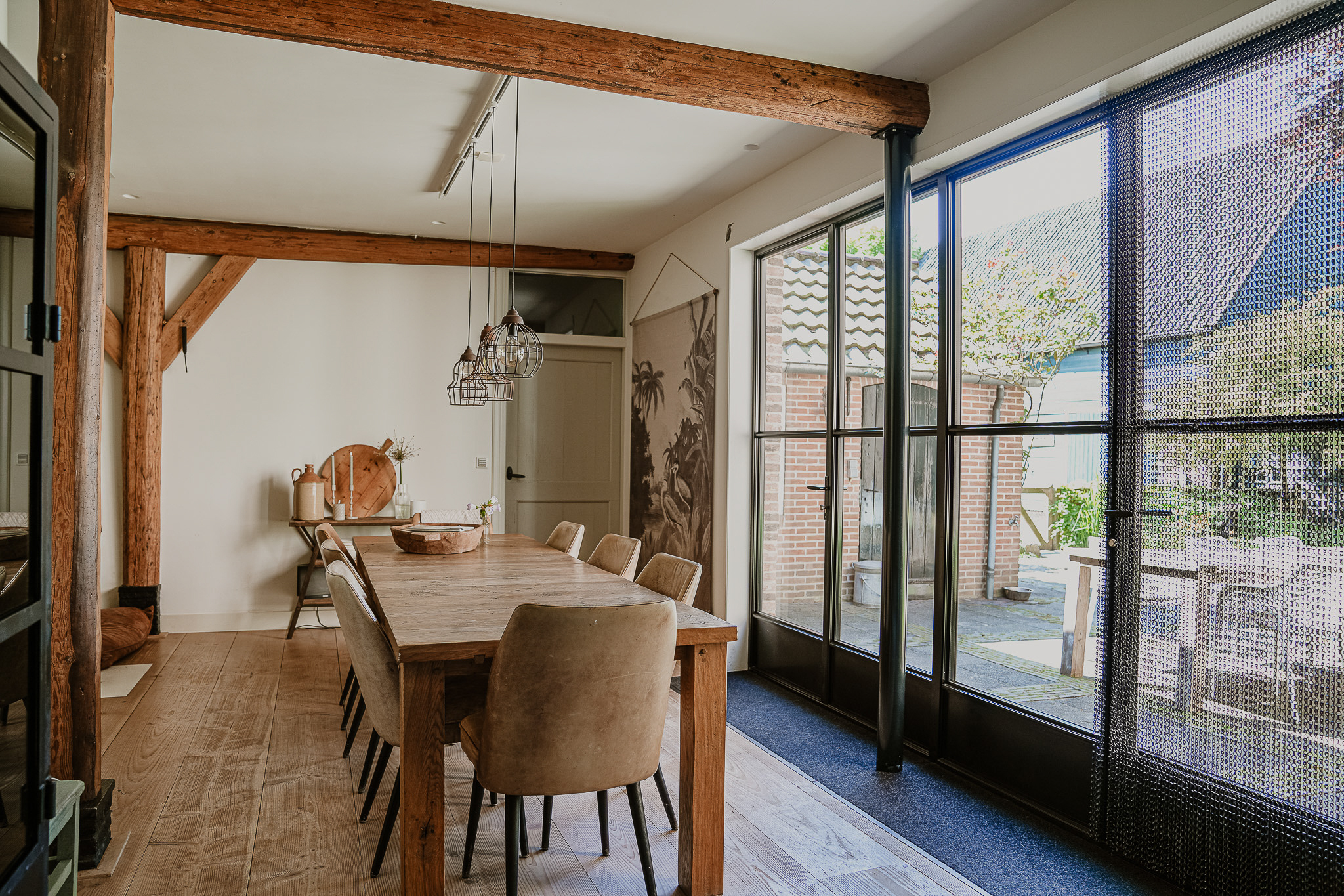 De tuinkamer beschikt over dubbele deuren naar de tuin, die zijn voorzien van binnenluiken. De houtkachel is aangesloten op de cv en de vloer is ook hier belegd met brede vloerdelen. Aan de tuinkamer grenst een ruime toiletruimte met voorportaal. De tuinkamer staat via een werkruimte in contact met de woonkeuken. De keuken is voorzien van een luxe houten keuken met een groot werkeiland en een natuurstenen werkblad met gefrijnde rand. Onder de antieke schouw is royaal ruimte om te wokken, grillen of koken. In de keuken is een deel van het plafond in veiligheidsglas uitgevoerd, zodat er niet alleen licht via het keukenraam binnenvalt, maar ook via het raam op de overloop. Aan de keuken grenzen twee opkamers, waarvan er één in gebruik is als provisieruimte en de andere als werkkamer. Onder de opkamers bevindt zich de wijnkelder. De keuken vormt een visuele eenheid met de aangrenzende eetkamer; een heerlijke leefruimte met houtkachel. Via de geïsoleerde, zwartstalen pui is volledig zicht op de tuin, waarin een imposante beuk de blikvanger is. Aan de eetkamer grenst een praktische bijkeuken en een achterhal met tweede toilet. Vanuit de achterhal is toegang tot de voormalige paardenstal die momenteel in gebruik is als (fietsen)berging. Het aangebouwde verwarmde bakhuis beschikt over aansluitingen van gas, water, elektra en riolering.