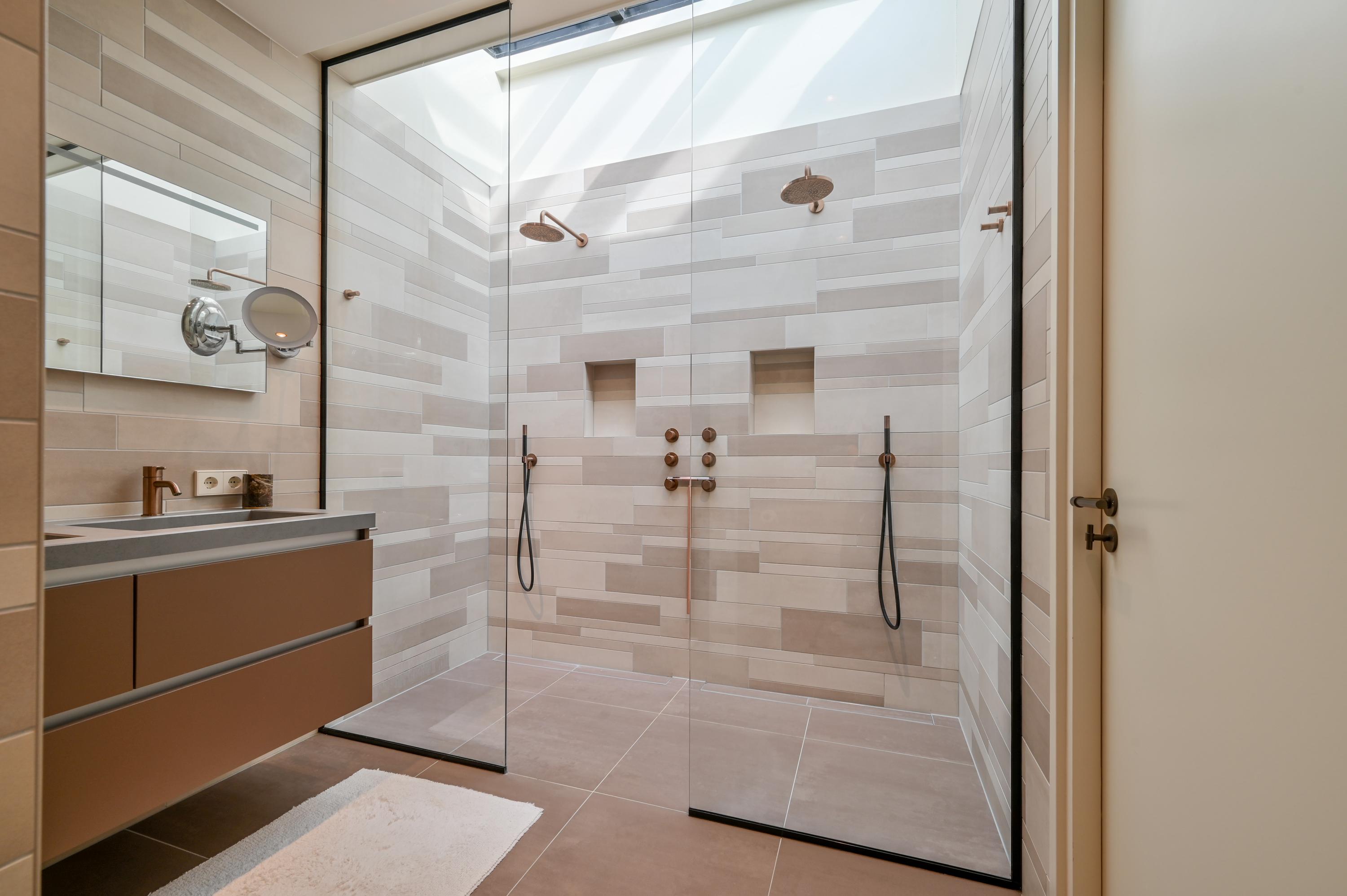 The second floor reveals a rooftop terrace with unobstructed views over the Amstel and polder, enriched by a pergola, integrated lighting, and water connection, creating an inviting setting for quiet reflection or hosting guests. Beneath the house, the garage is configured as a versatile studio, complete with kitchen, toilet, underfloor heating, and air conditioning, accessible via both the terrace and an electric entry.