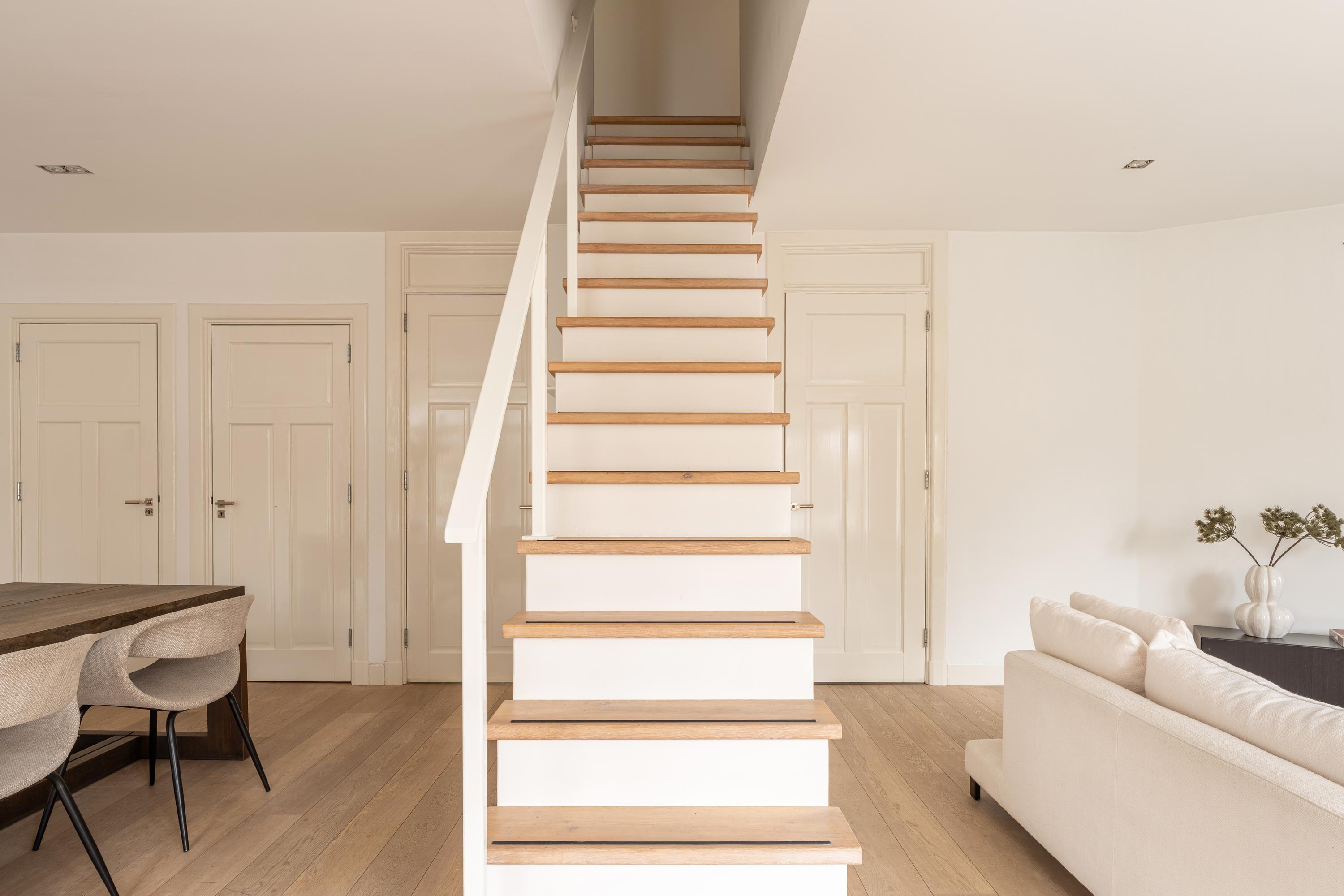 From the spacious landing you enter the exceptionally generous and light-filled living room, featuring a charming fireplace and a centrally positioned staircase that playfully divides the space into a sitting and dining area. Thanks to the many windows, the living room enjoys an abundance of natural light. There is also ample storage space in the form of bespoke, built-in cupboards.