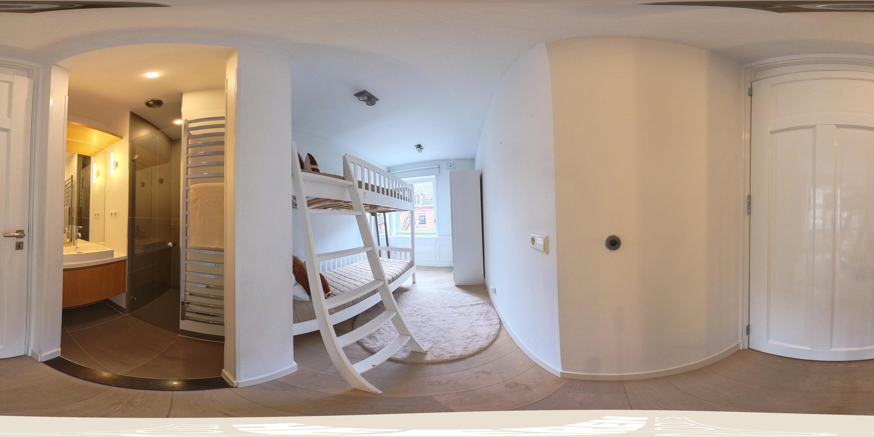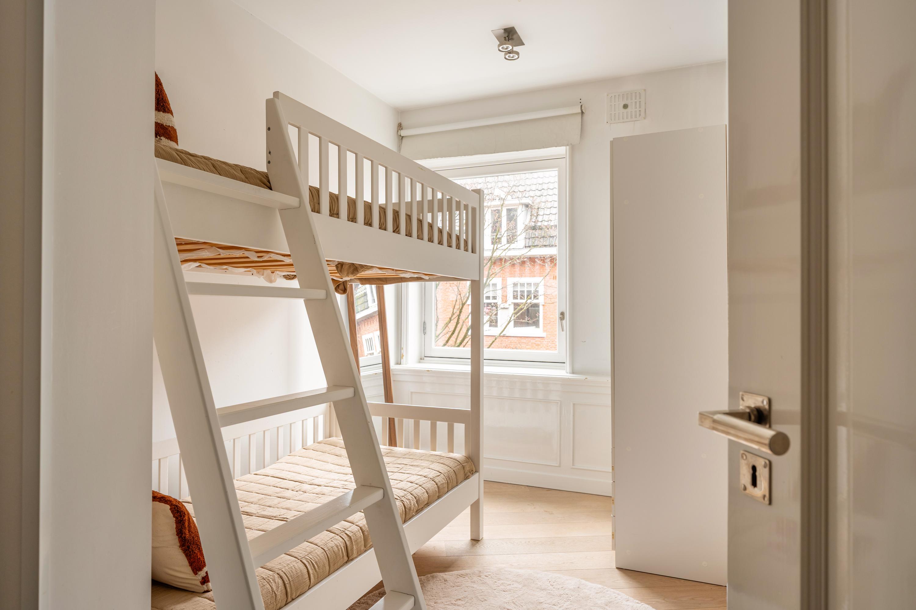 Via the staircase in the living room you reach the third and top floor of the apartment. Here you will find two well-proportioned bedrooms, both featuring large windows and bespoke built-in wardrobes. The master bedroom additionally boasts a stylishly integrated television within the fitted cabinetry.