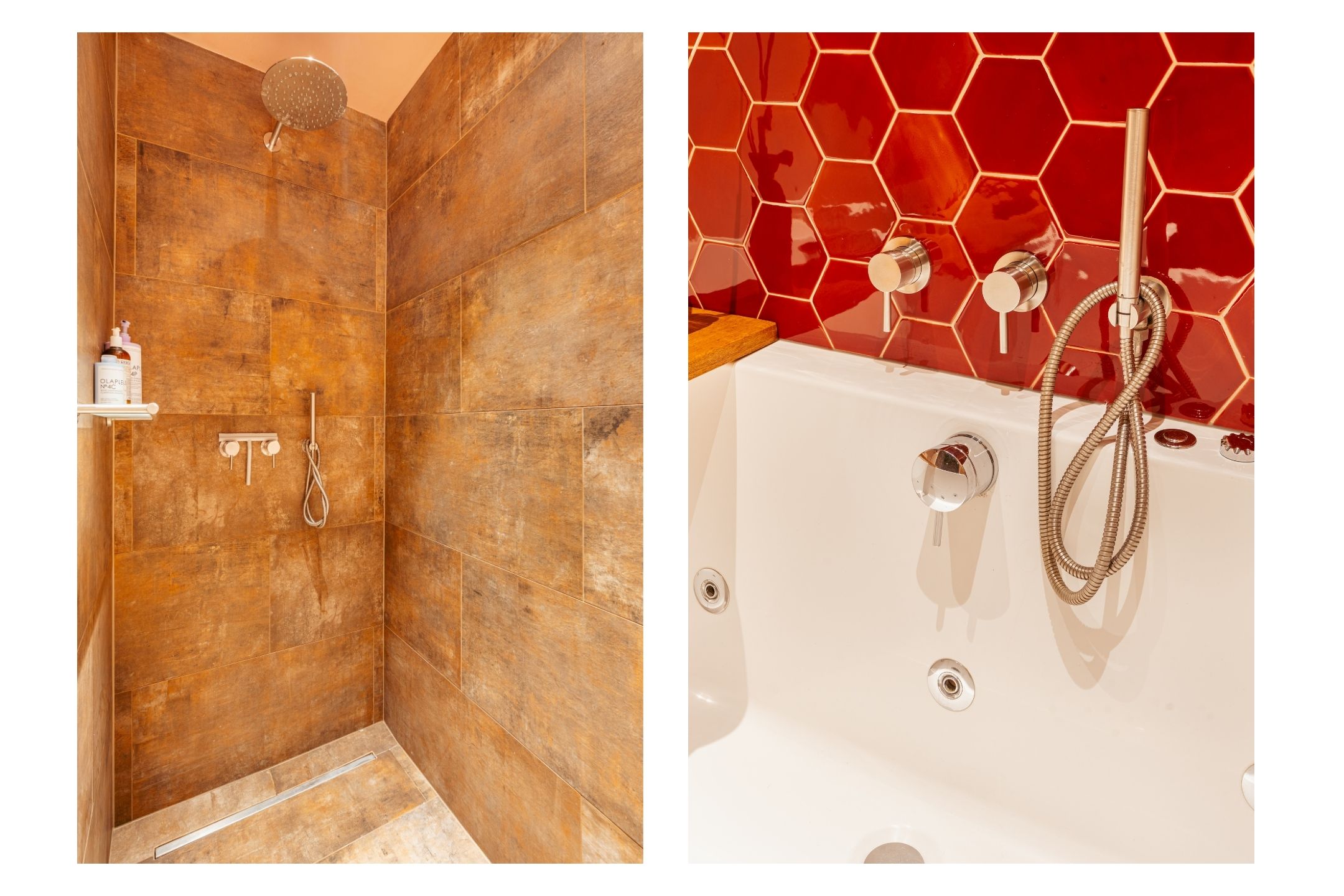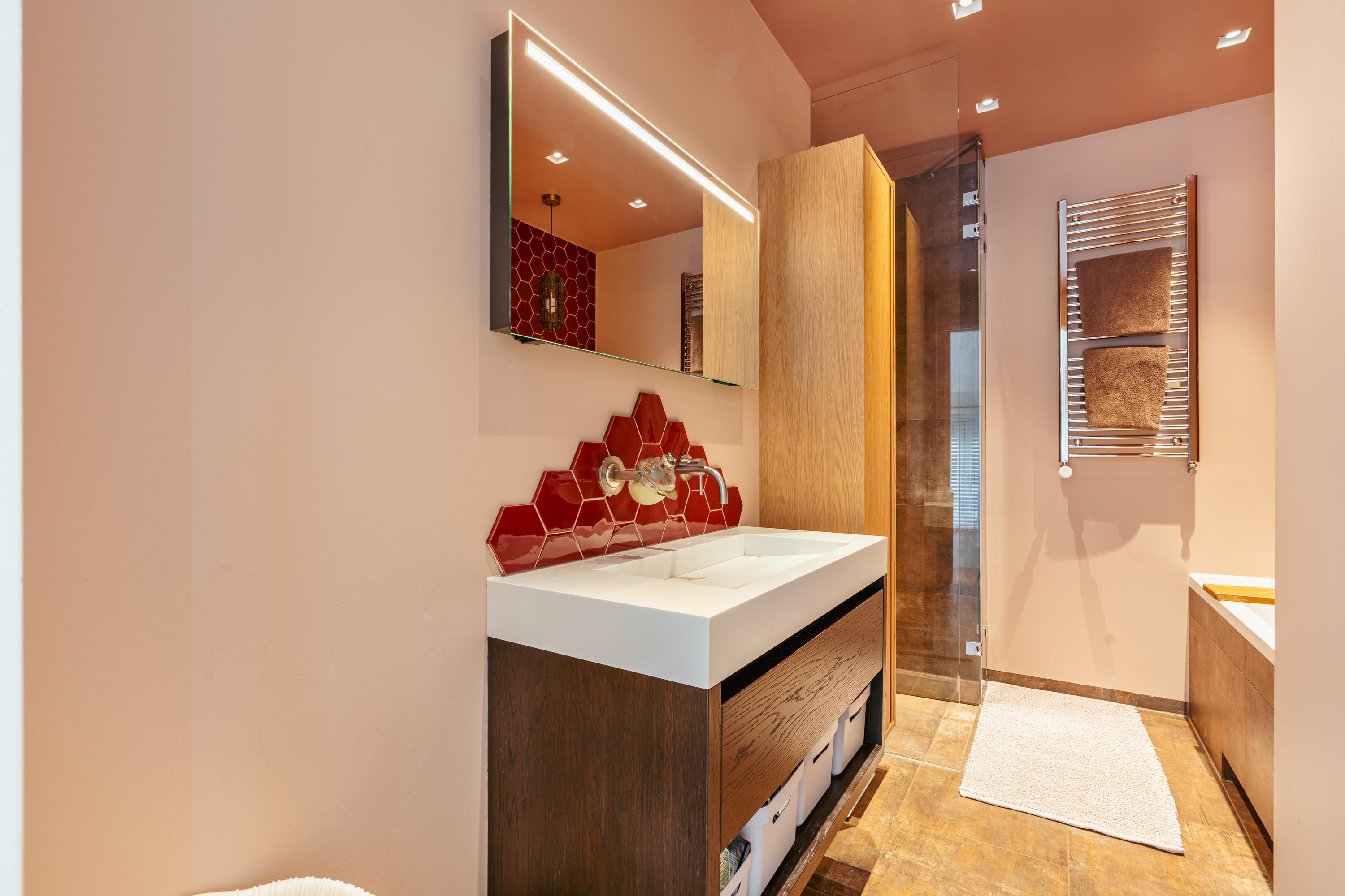 The bathroom is stylishly designed in warm brown shades with a striking red hexagon tile accent. It features a whirlpool bathtub, a separate walk-in rain shower, a vanity unit with ample storage drawers, a wall cabinet, a designer radiator, and underfloor heating. A wonderful place to unwind.