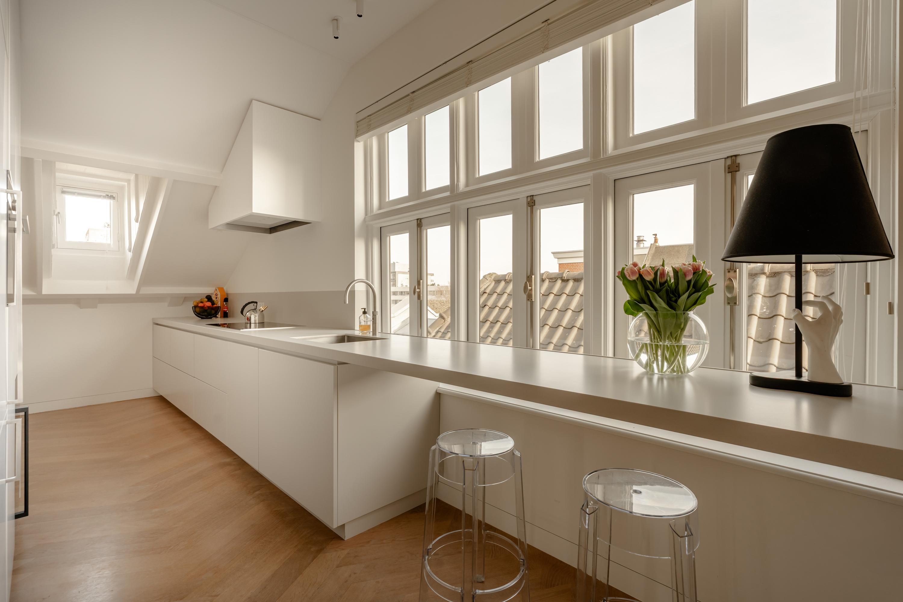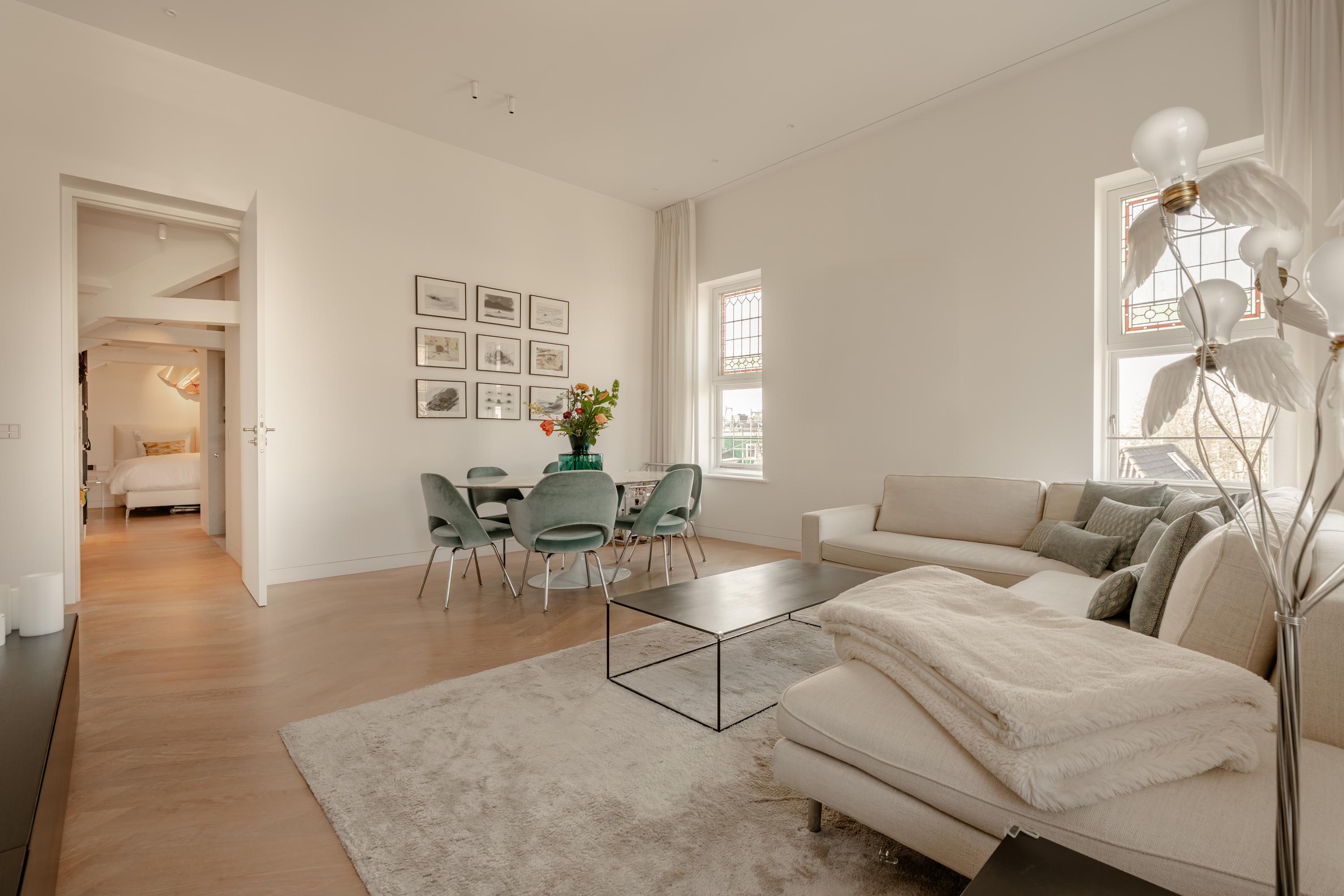Located in the highly sought-after Vondelpark neighbourhood, this luxurious penthouse of approximately 115 m² is situated in a characteristic listed (monumental) building with elevator. The apartment combines authentic details with modern living comfort and is distinguished by its high-quality finishes and bespoke cabinetry throughout. Large windows provide an abundance of natural light and offer beautiful views over the city. In addition, the property is situated on freehold land, making it even more attractive.