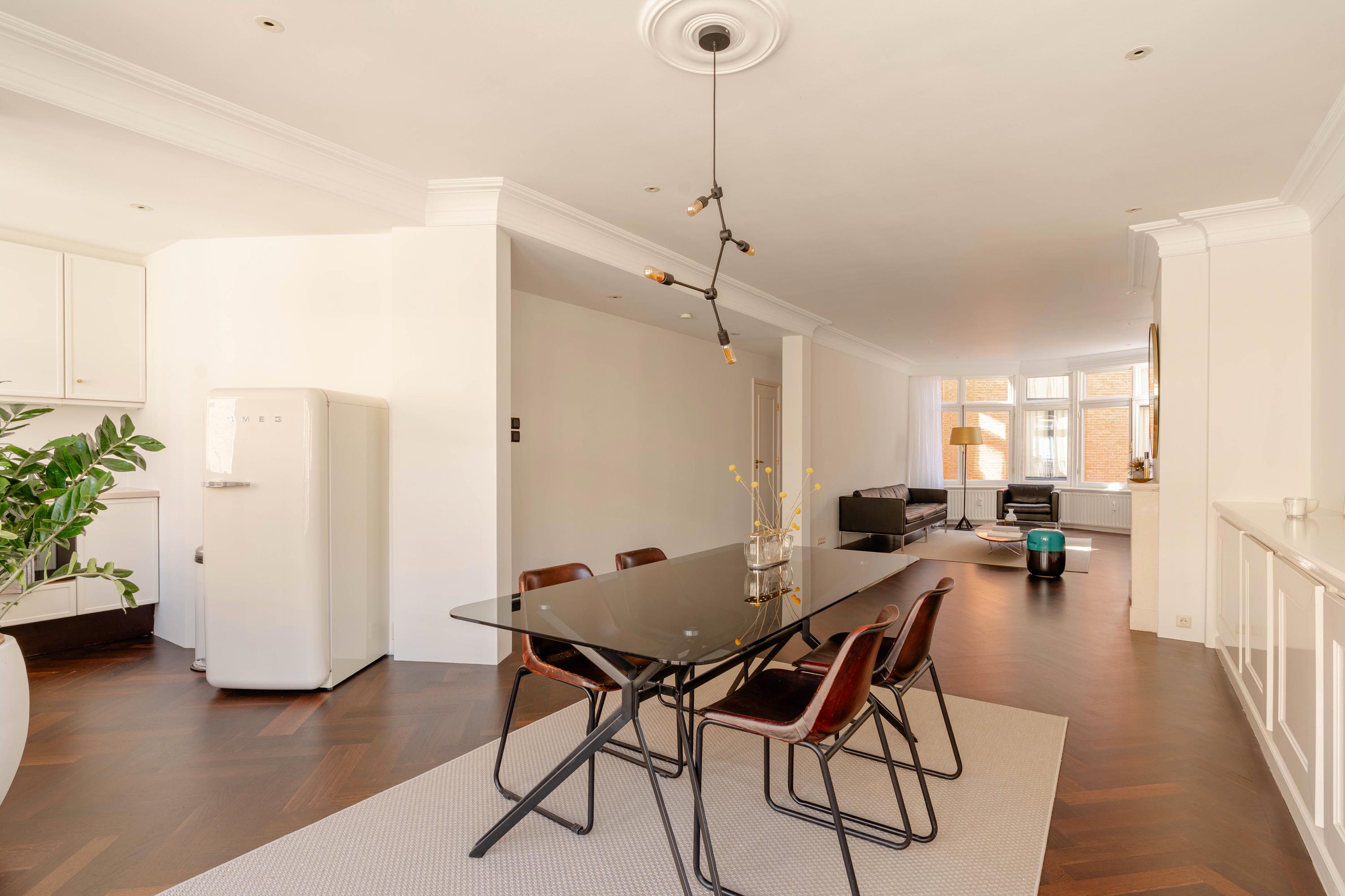 The living room is characterised by authentic features such as decorative mouldings, a fireplace with a classic mantelpiece, a beautiful wenge wood herringbone floor, and elegant wall panelling. French doors opening onto a charming Juliette balcony create a pleasant connection to the outside. The open kitchen is functionally designed and equipped with various built-in appliances and ample storage space.