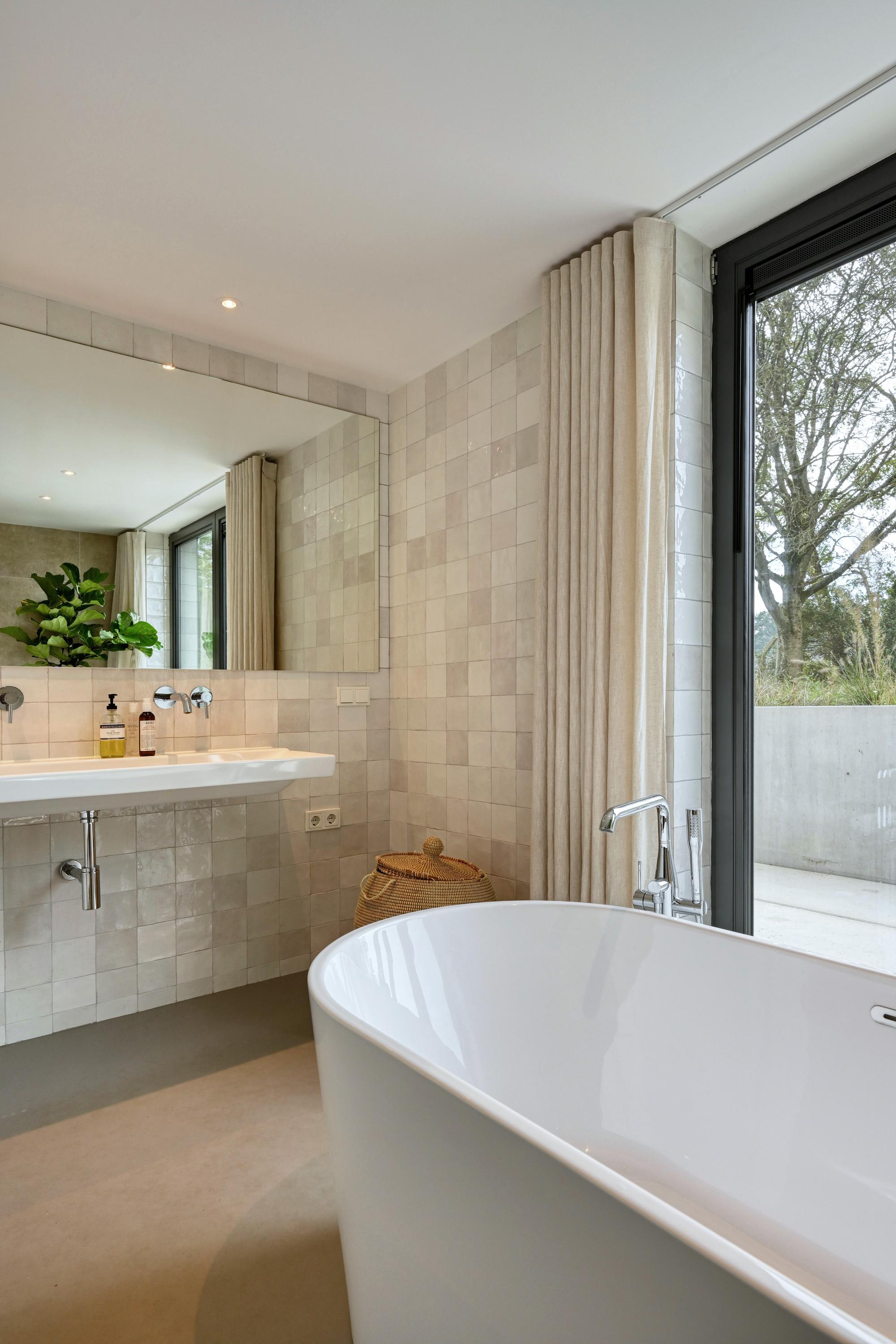 The main house reveals light-filled interiors: an entrance hall opens to a versatile hobby area, connecting by steel doors to a spacious kitchen, finished with a marble island and Moroccan-tiled wall. Floor-to-ceiling windows and terrace doors frame open views, blurring the line between indoors and landscape. Upstairs, oak flooring and a lounge overlook the business area, while versatile spaces offer potential for both private and guest accommodation. Downstairs, the bedrooms feature direct access to terraces, each designed to bring the surrounding green vistas inside.
