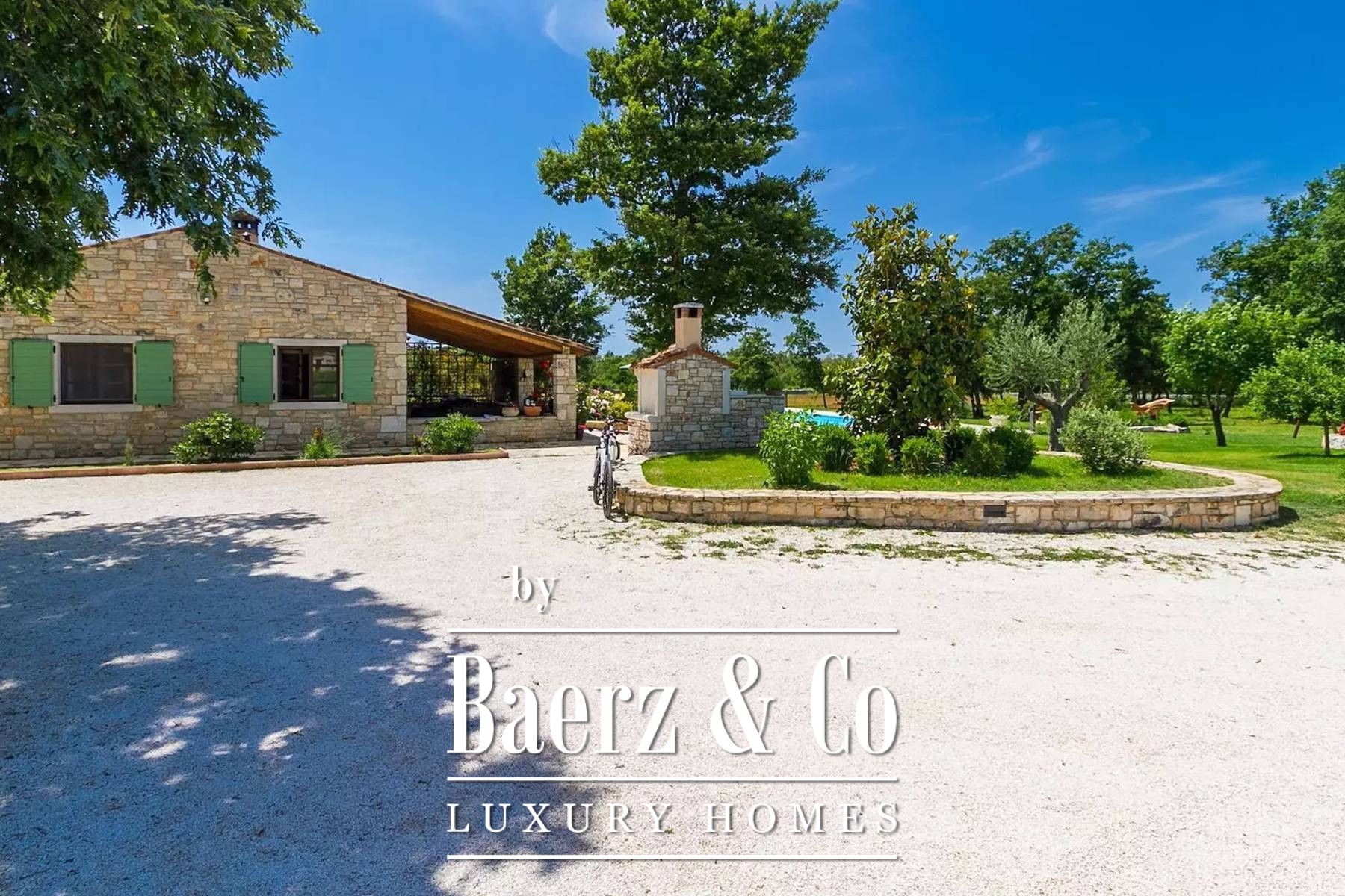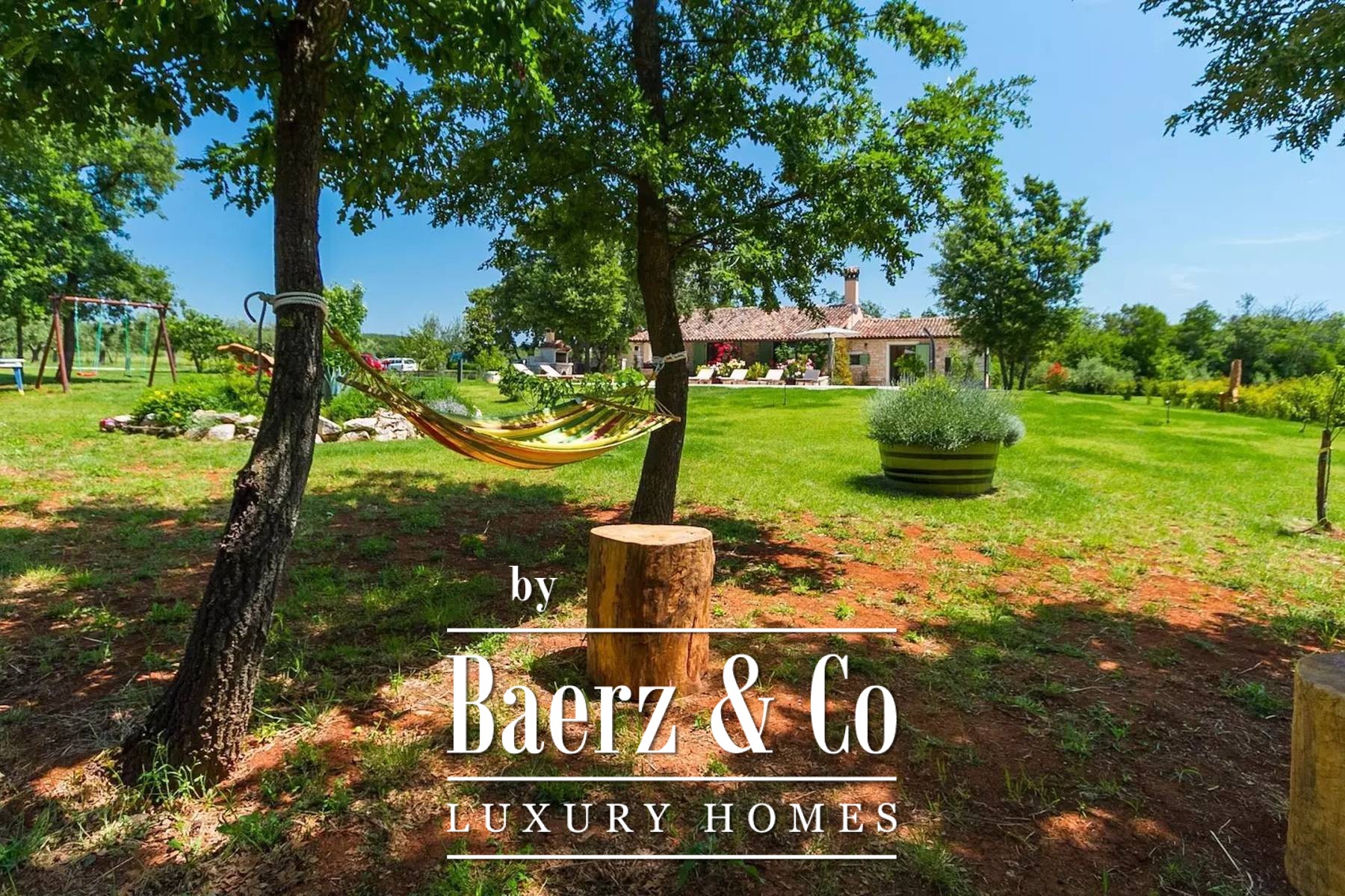 The grounds are marked by landscaped privacy, including a large olive grove comprising 170 indigenous Istrian trees, presenting both an aesthetic and agricultural legacy. An adjacent auxiliary apartment of 50 m², along with a smaller outbuilding, amplifies potential for guests or business utility. Terraces open towards the landscape, drawing in the clear Istrian light and broad views over nature, while a generous, enclosed garden shelters moments of solitude.
