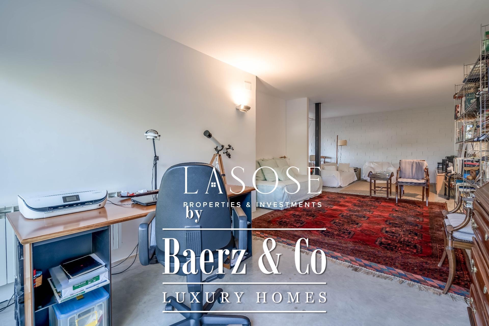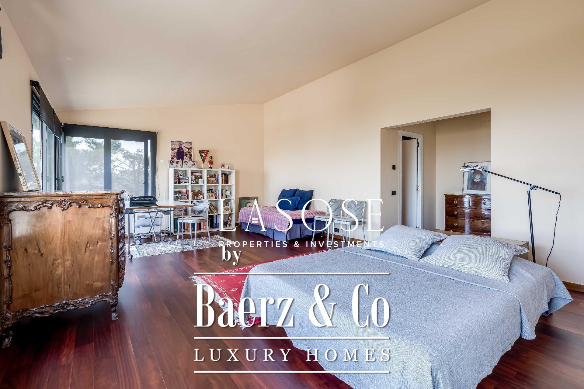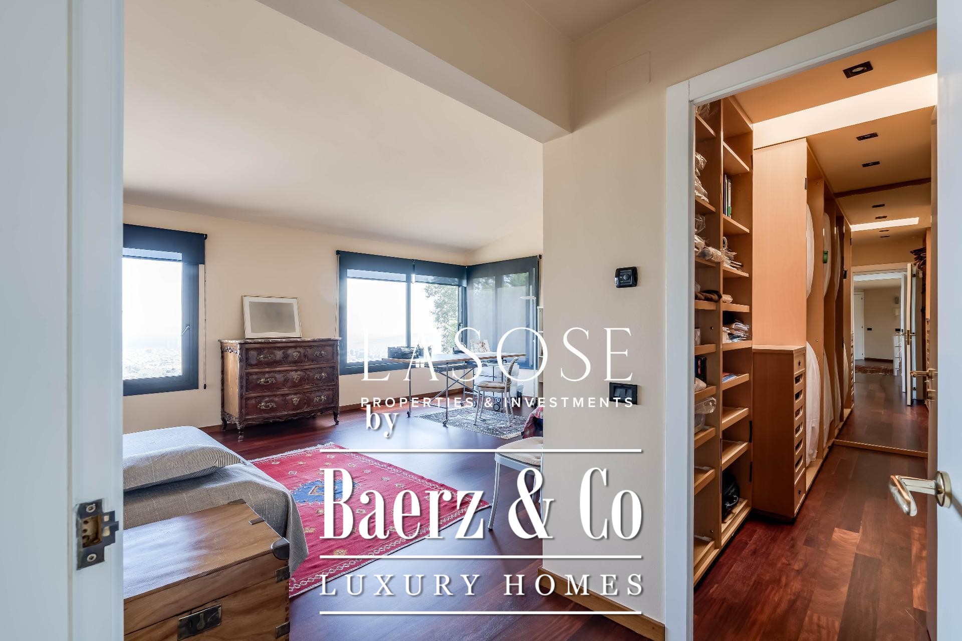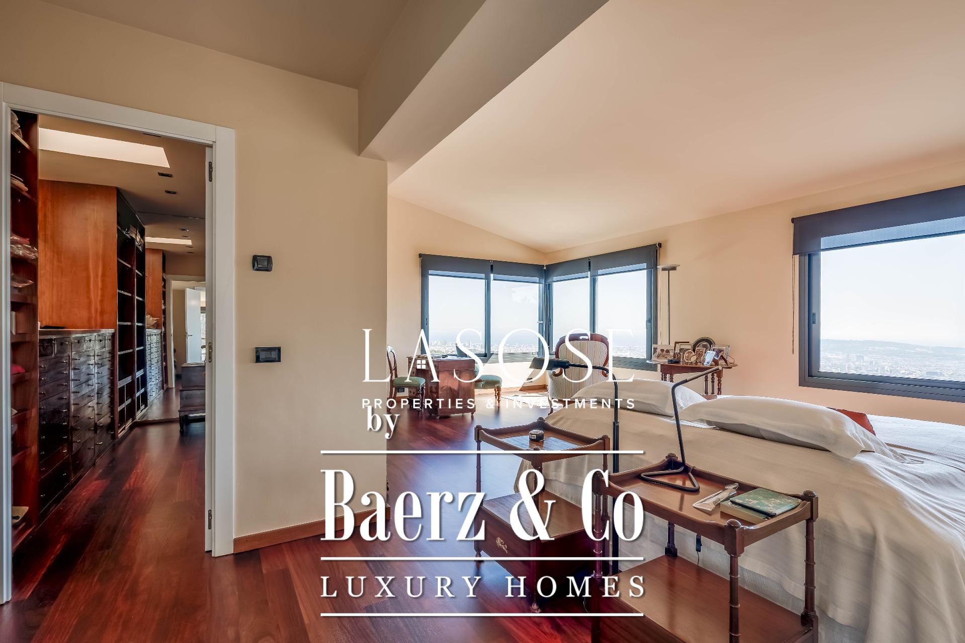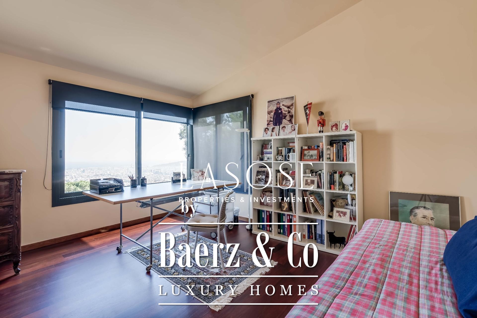 This extraordinary contemporary design house in Vallvidrera offers spectacular panoramic views of Barcelona and is located within walking distance of the city center and Sarriá via the funicular.. . Upon entering the main floor, you will be greeted by a spacious entrance hall leading to an impressive living-dining room with access to a 90 m² terrace offering unobstructed panoramic views.. . The independent kitchen is fully equipped and has a pantry and a laundry area with separate entrance. . . Adjacent to the living room, you will find a bedroom with bathroom, which is currently used as a living room, but can be converted into an additional bedroom. Slate underfloor heating. In addition, from inside the house, there is access to the garage with capacity for two cars.. . Upstairs, the sleeping area houses two spacious bedrooms with a generous dressing room and a full bathroom. Large windows flood this area with natural light and offer unparalleled views of the city of Barcelona. Underfloor parquet flooring.. . Descending to the lower floor, you will discover a 115 m² summer apartment with dressing room and full bathroom, with independent access.. . From here, you will enjoy direct access to the garden area, swimming pool, machine room and a small storage room.. . This magnificent residence