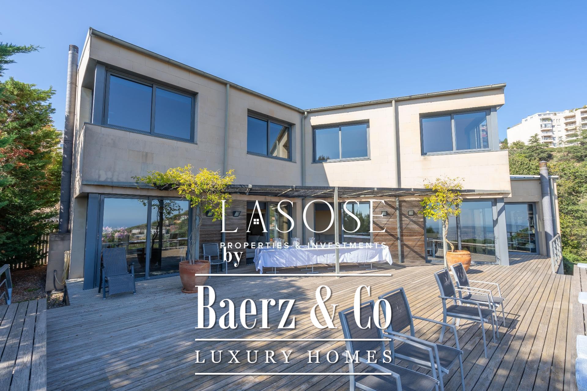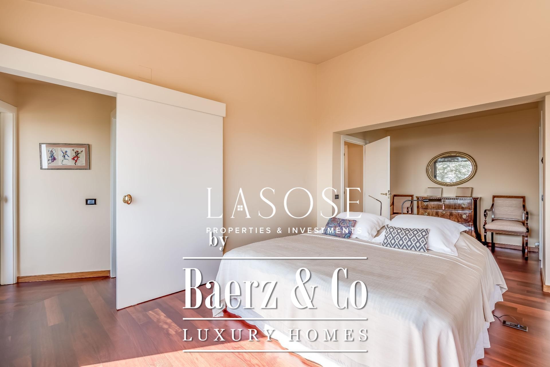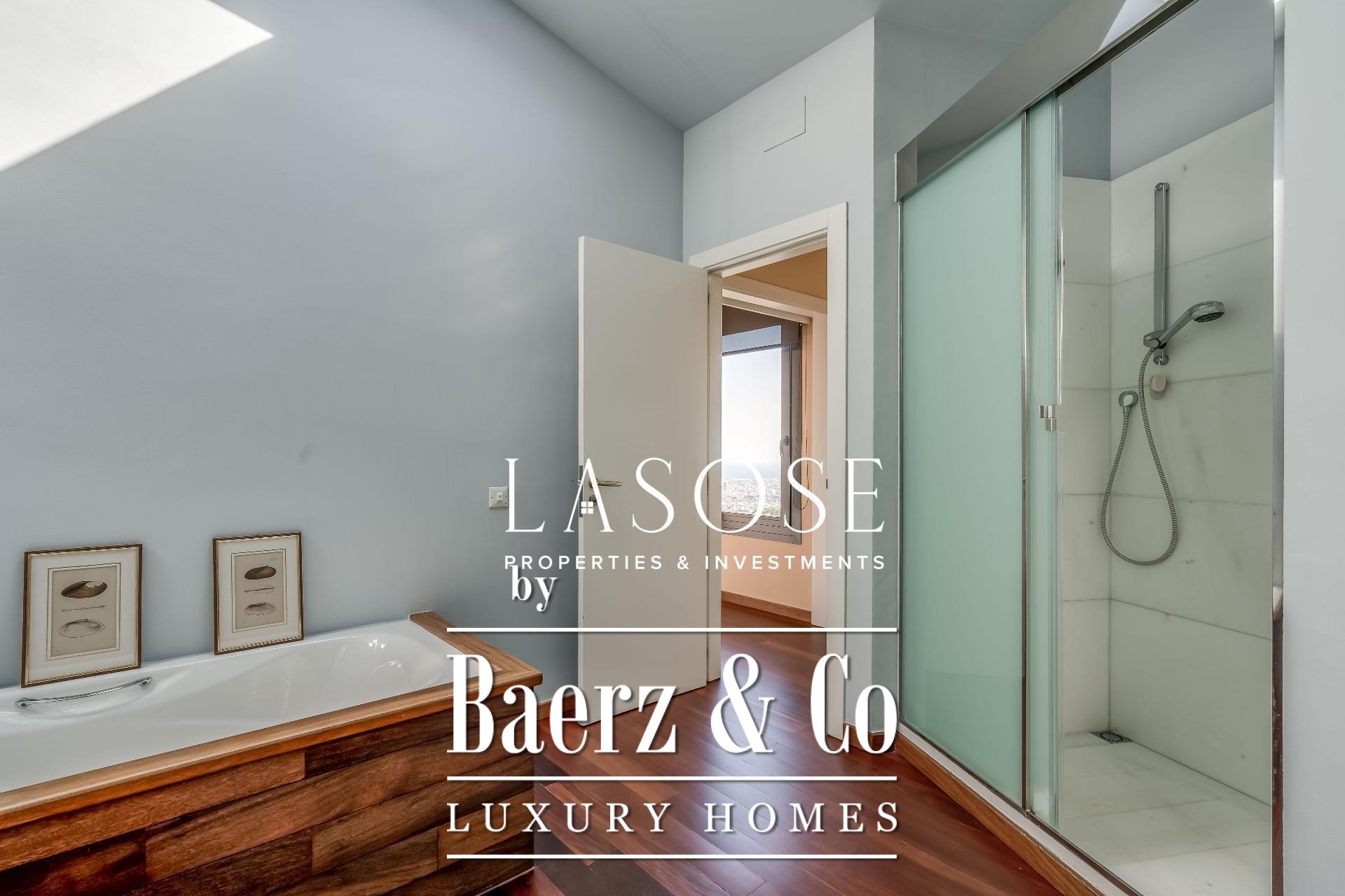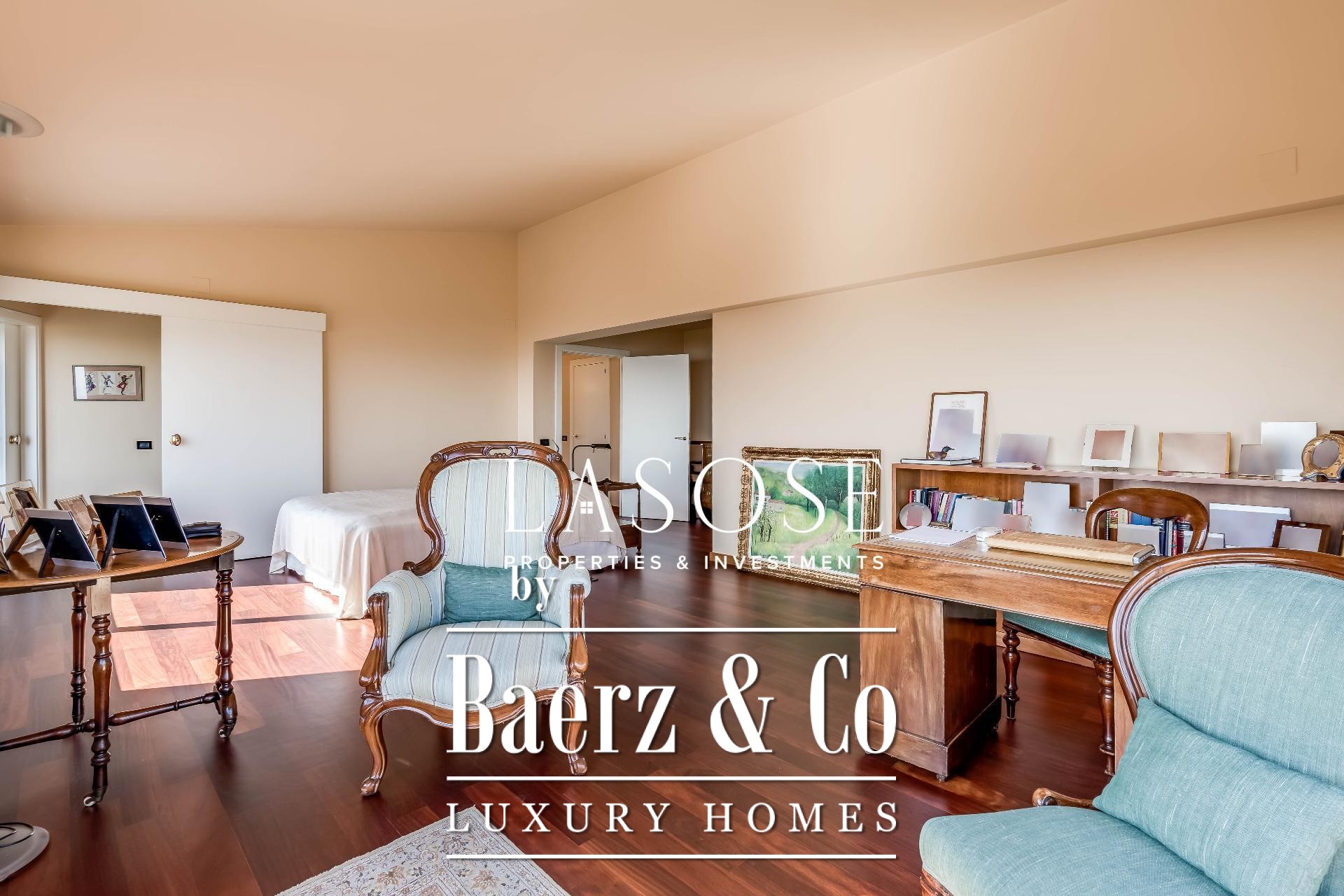 This extraordinary contemporary design house in Vallvidrera offers spectacular panoramic views of Barcelona and is located within walking distance of the city center and Sarriá via the funicular.. . Upon entering the main floor, you will be greeted by a spacious entrance hall leading to an impressive living-dining room with access to a 90 m² terrace offering unobstructed panoramic views.. . The independent kitchen is fully equipped and has a pantry and a laundry area with separate entrance. . . Adjacent to the living room, you will find a bedroom with bathroom, which is currently used as a living room, but can be converted into an additional bedroom. Slate underfloor heating. In addition, from inside the house, there is access to the garage with capacity for two cars.. . Upstairs, the sleeping area houses two spacious bedrooms with a generous dressing room and a full bathroom. Large windows flood this area with natural light and offer unparalleled views of the city of Barcelona. Underfloor parquet flooring.. . Descending to the lower floor, you will discover a 115 m² summer apartment with dressing room and full bathroom, with independent access.. . From here, you will enjoy direct access to the garden area, swimming pool, machine room and a small storage room.. . This magnificent residence