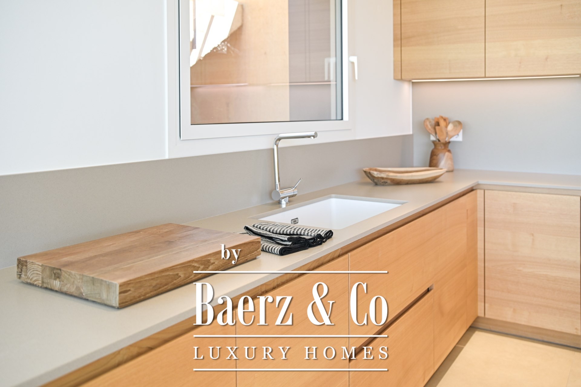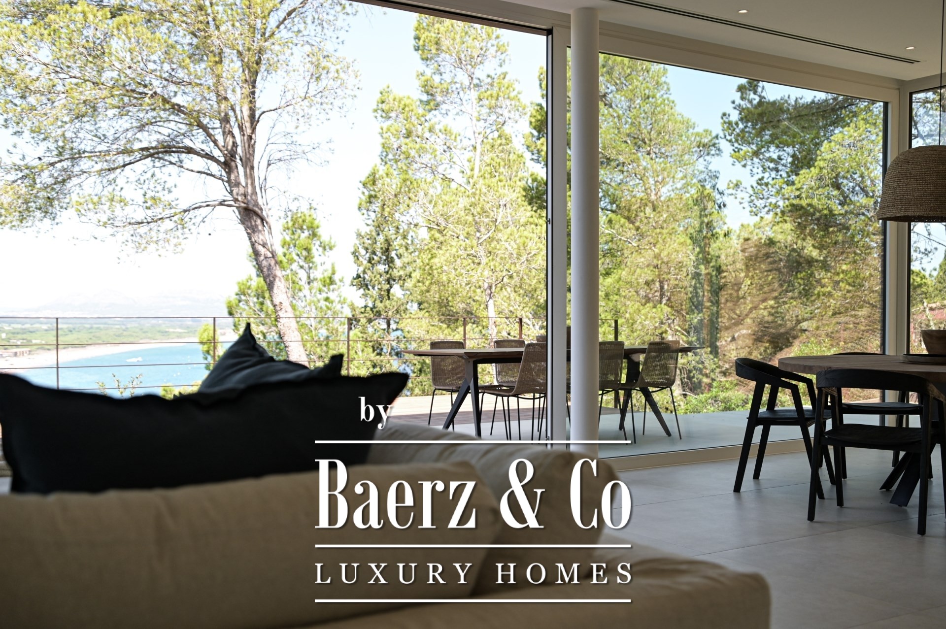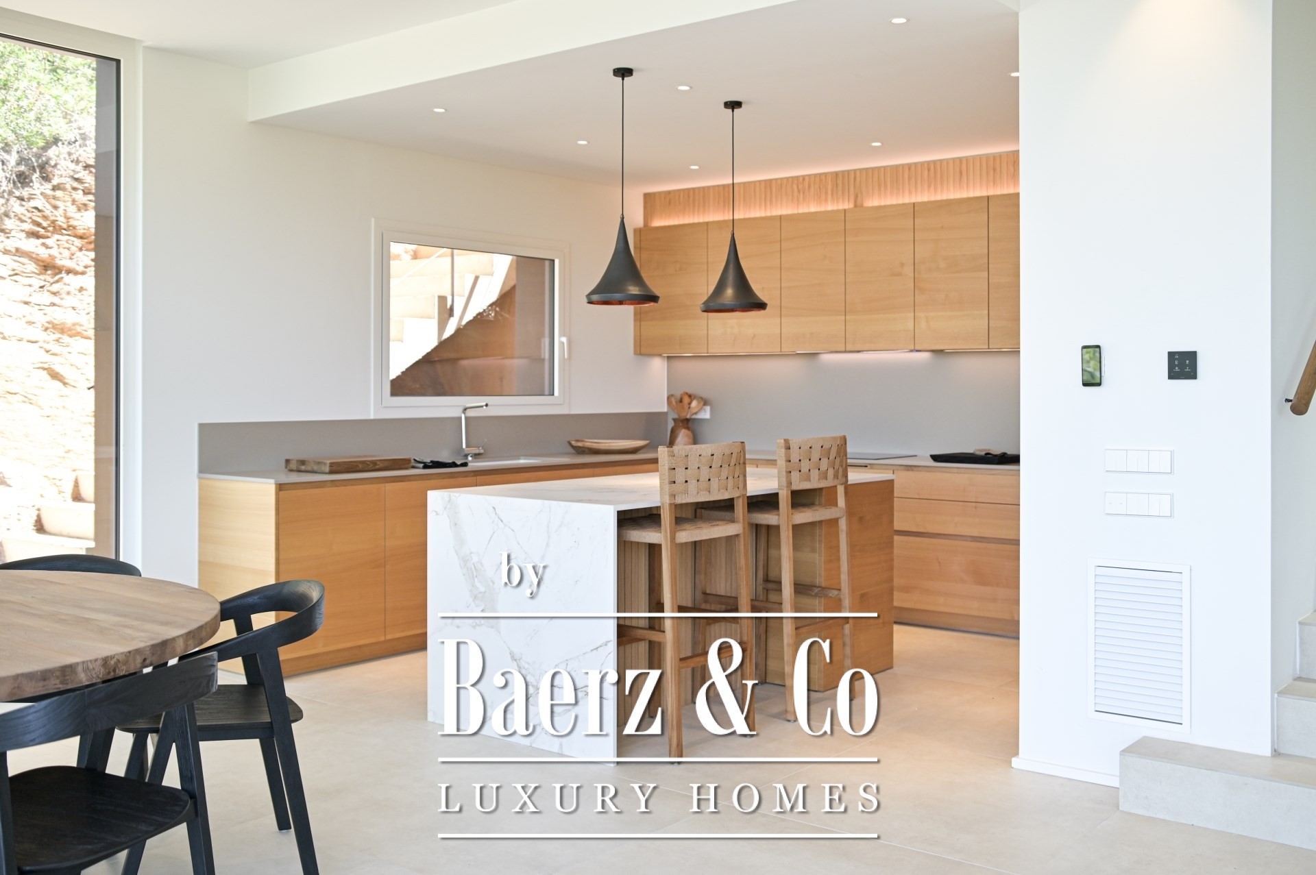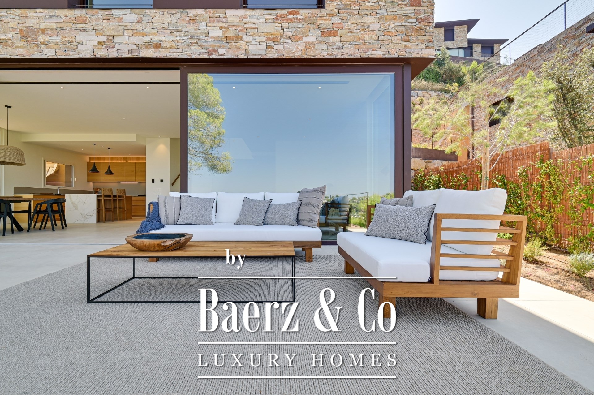 The villa presents 347 m² of living space within a 925 m² plot, including four bedrooms and three bathrooms. Glass-walled interiors invite the outside in, dissolving the boundaries between home and the Mediterranean light. Premium materials and tailored finishes set a serene rhythm throughout, while terraces, a swimming pool, carport, and landscaped garden allow residents to enjoy open-air living in privacy. Security is ensured by an alarm system and gated entrance, while air conditioning and heating deliver year-round comfort.
