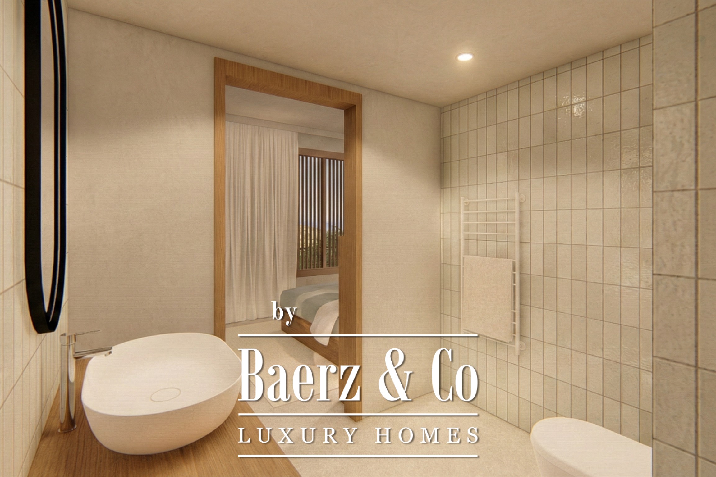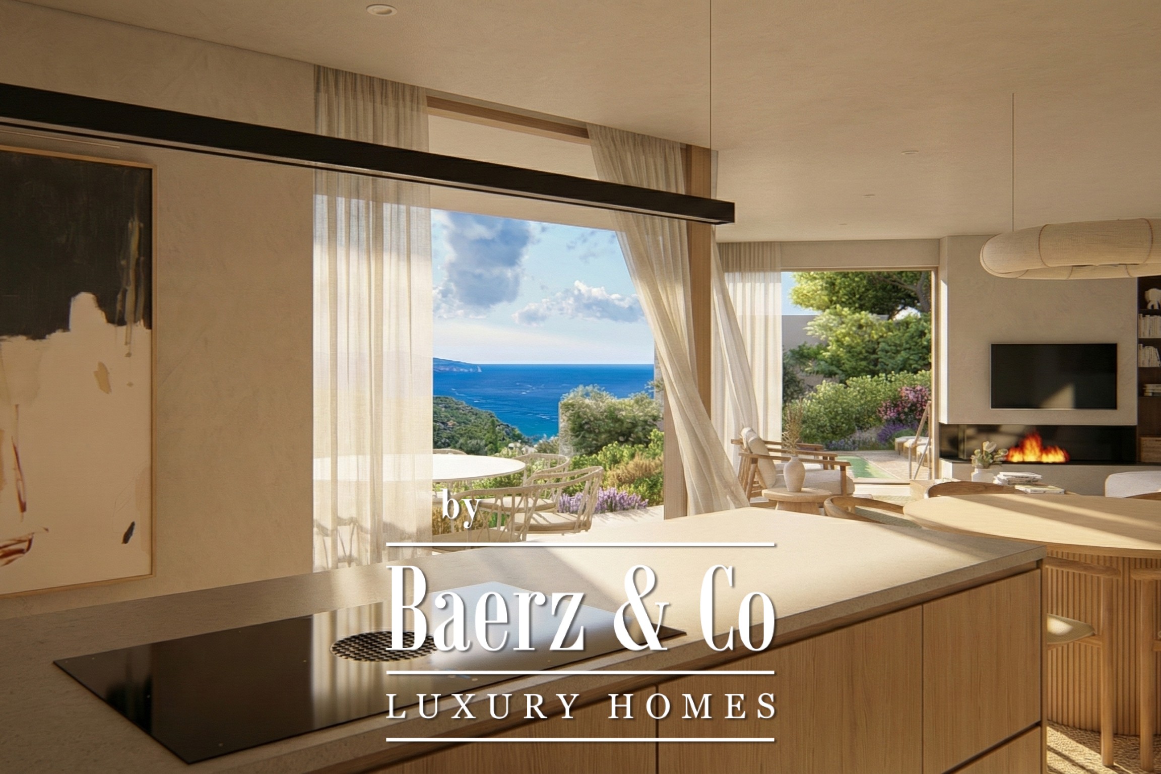 On the main level, an open-plan living area unites the kitchen, dining and lounge, enhanced by expansive floor-to-ceiling windows that illuminate the interior and frame the sea. Glass doors connect the living space to a generous terrace and swimming pool, designed for both relaxation and entertaining. This floor offers one bedroom with en-suite bathroom and a guest toilet, maintaining privacy for residents and guests alike.