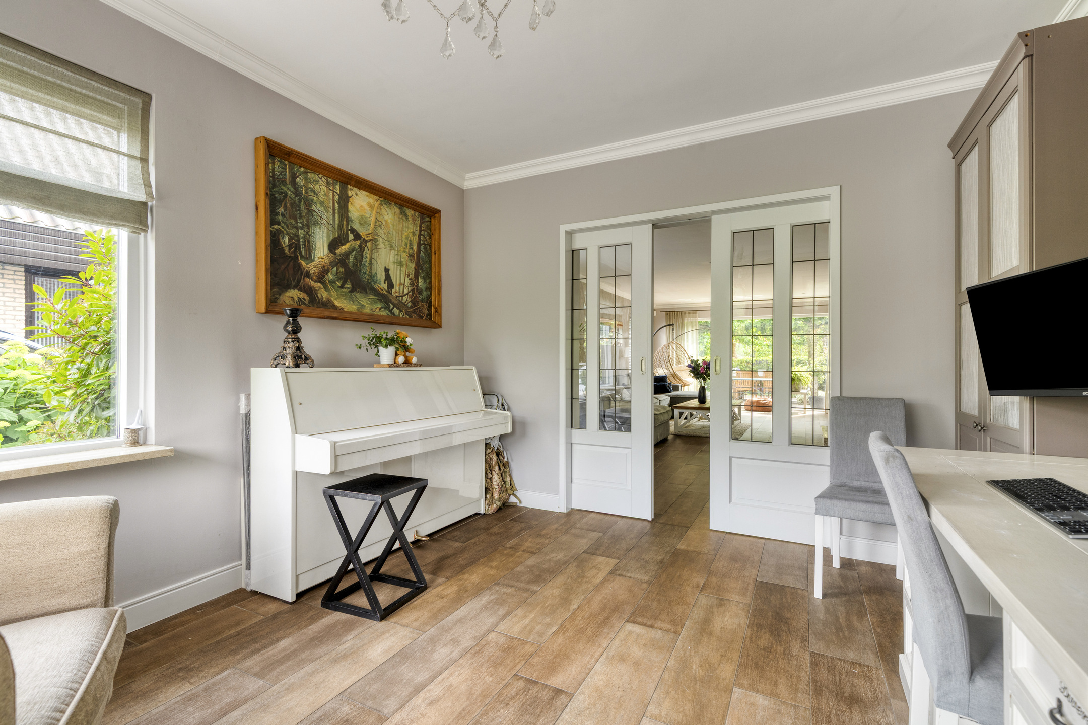 At the front of the house, adjoining the living room, are beautiful en-suite doors to the office/TV room.