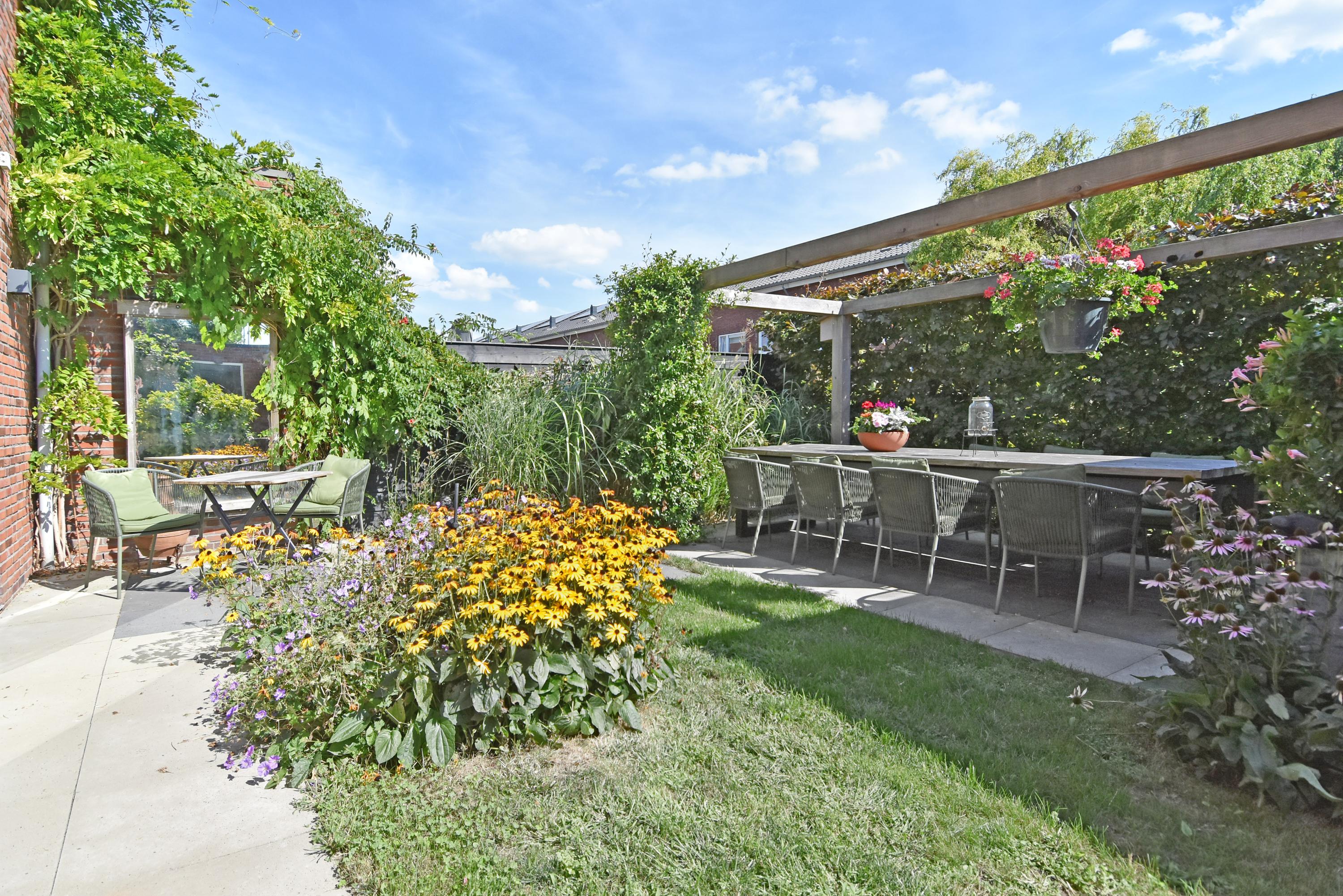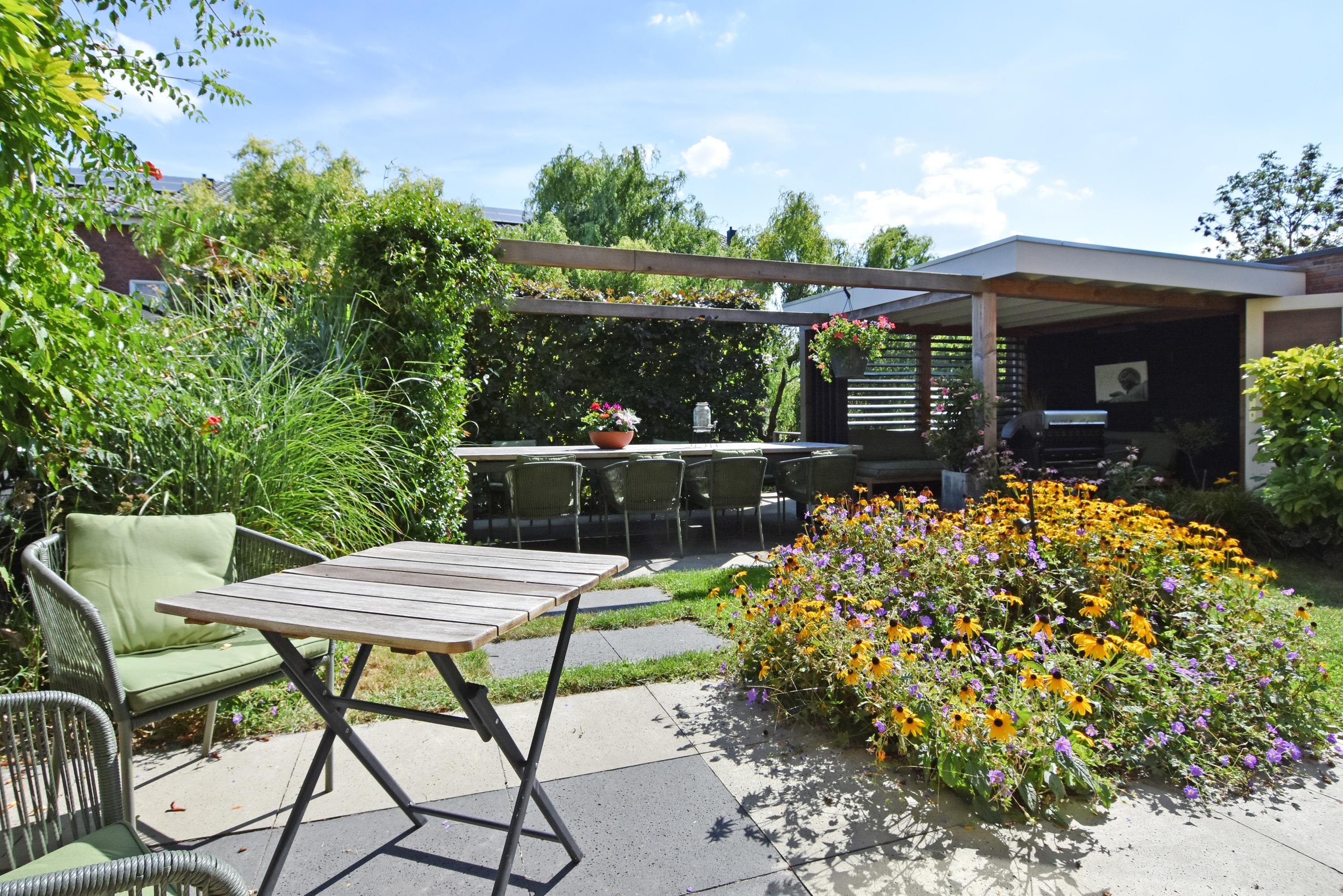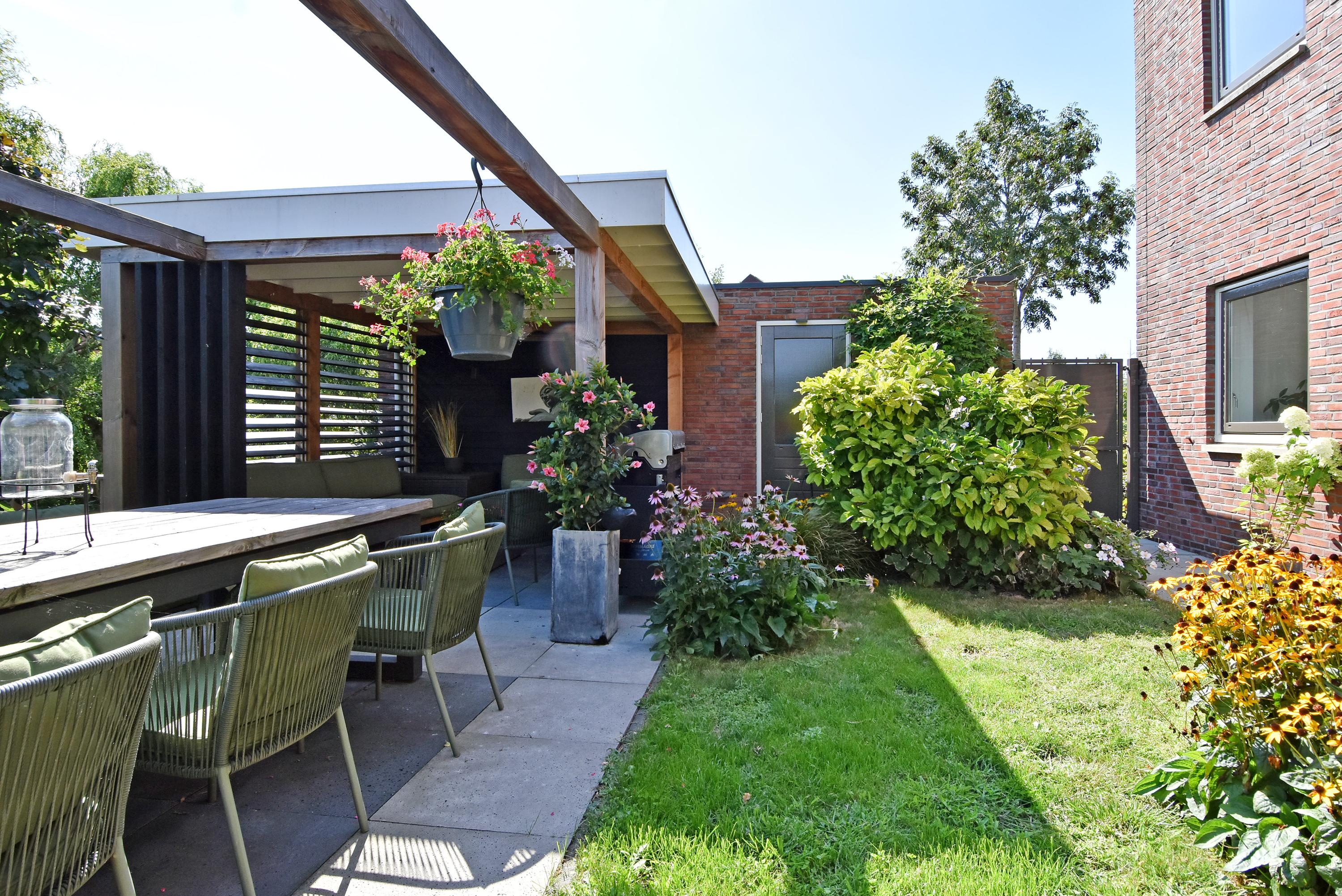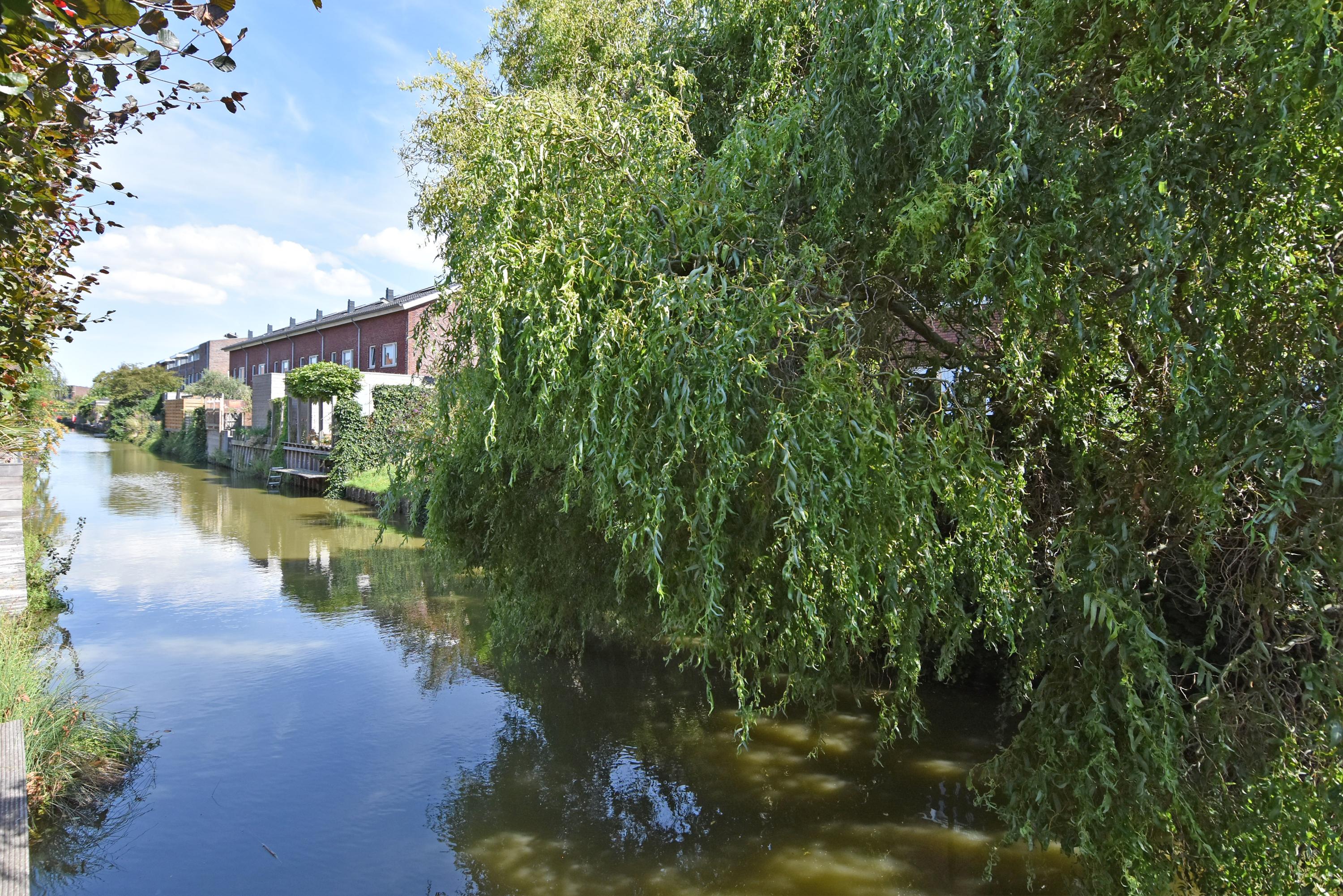 The spacious hall leads into the attractive, light-filled living room. The large sliding doors create a beautiful connection with the sunny garden. The garden has been recently landscaped and features lots of greenery, a lawn, a sunny terrace, a veranda and a canopy: a wonderful place to enjoy and relax all year round. The garden borders the water.