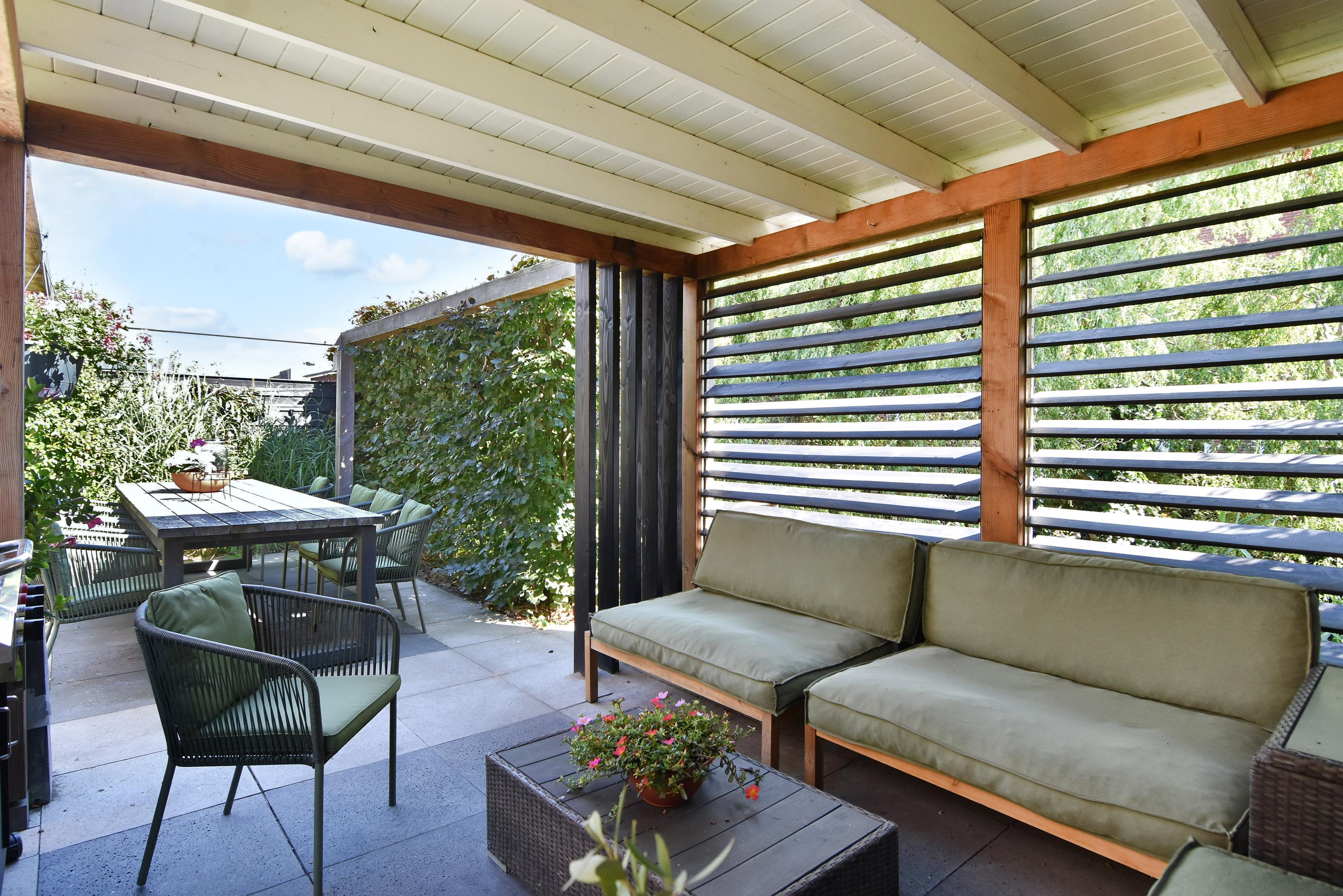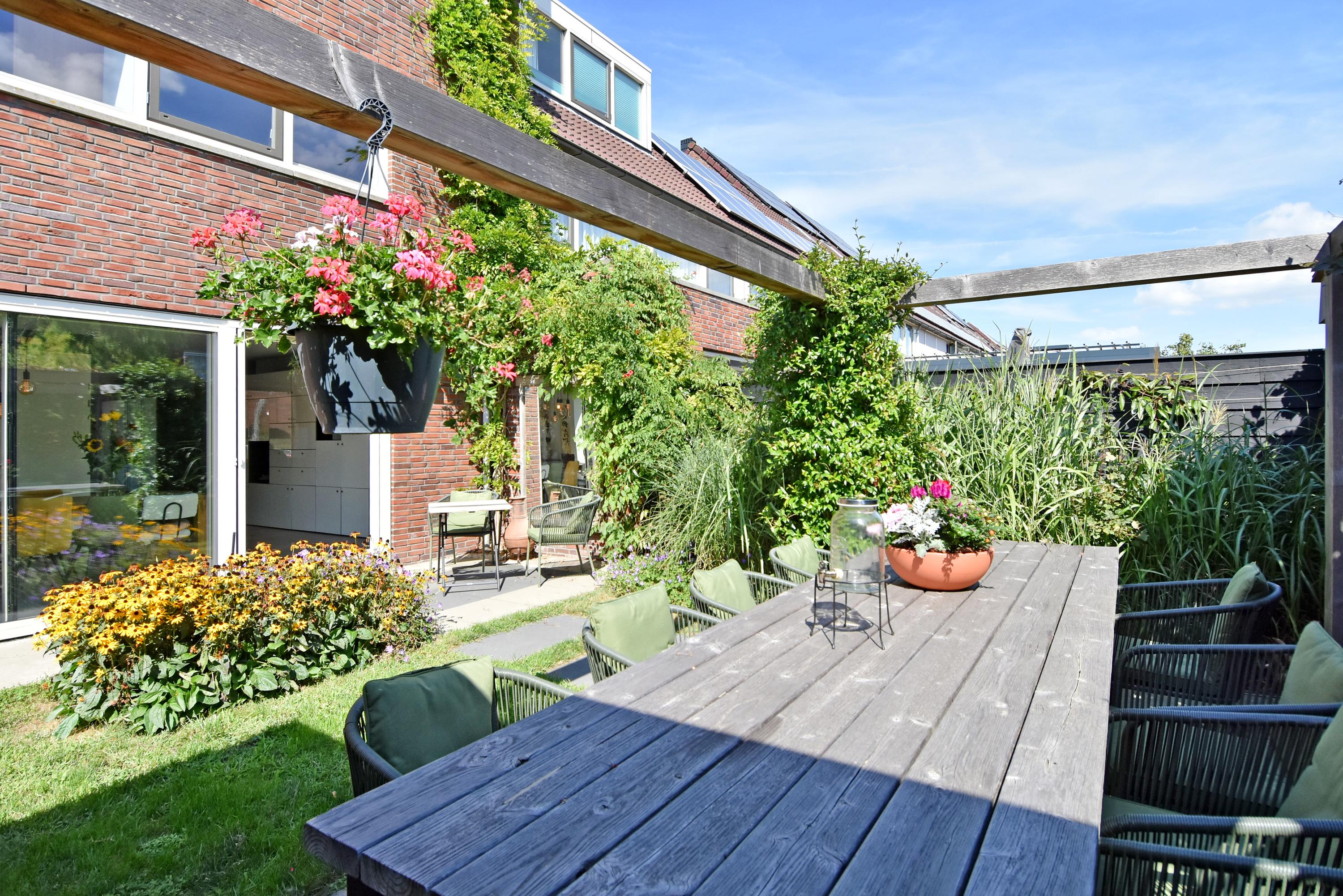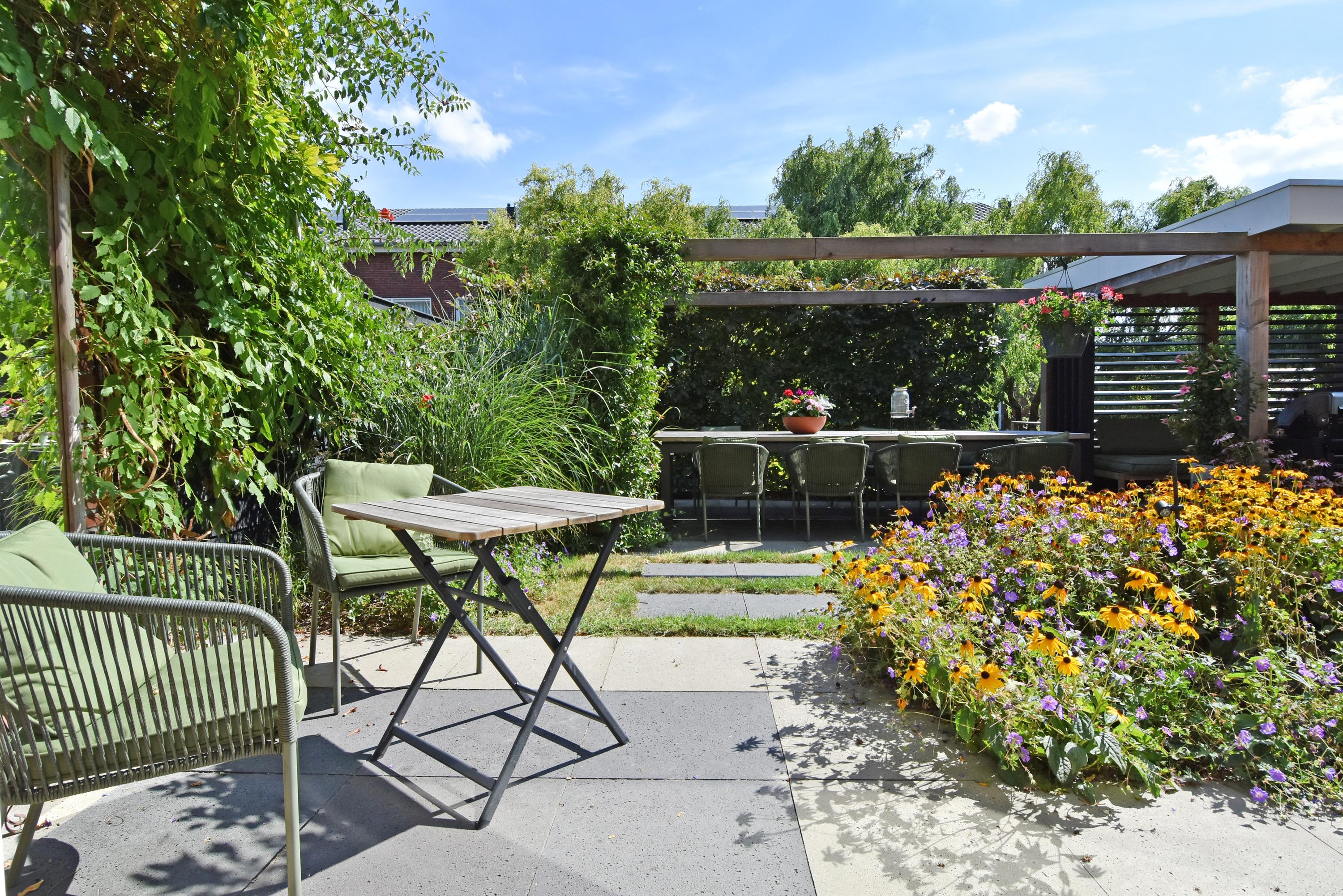 The spacious hall leads into the attractive, light-filled living room. The large sliding doors create a beautiful connection with the sunny garden. The garden has been recently landscaped and features lots of greenery, a lawn, a sunny terrace, a veranda and a canopy: a wonderful place to enjoy and relax all year round. The garden borders the water.