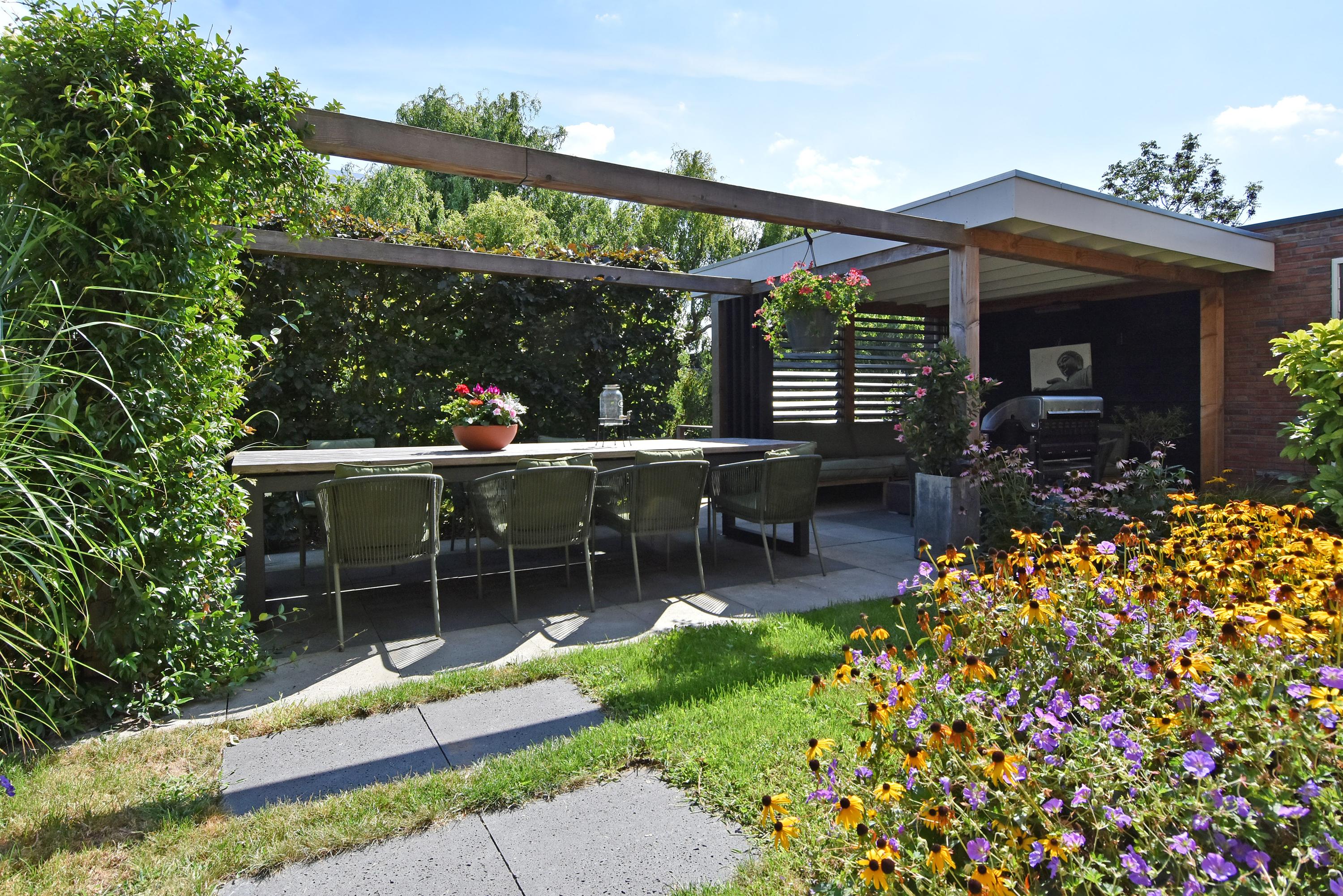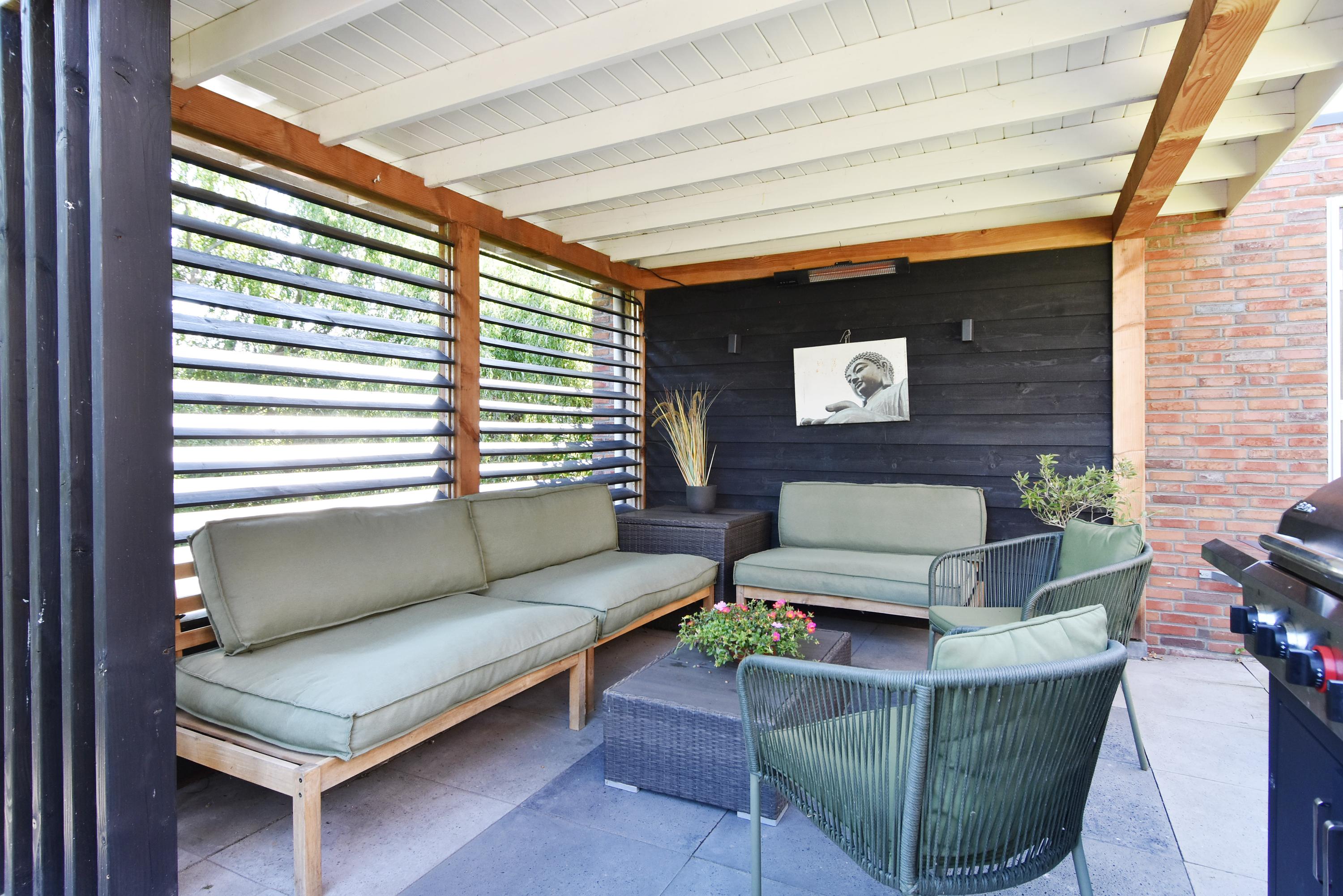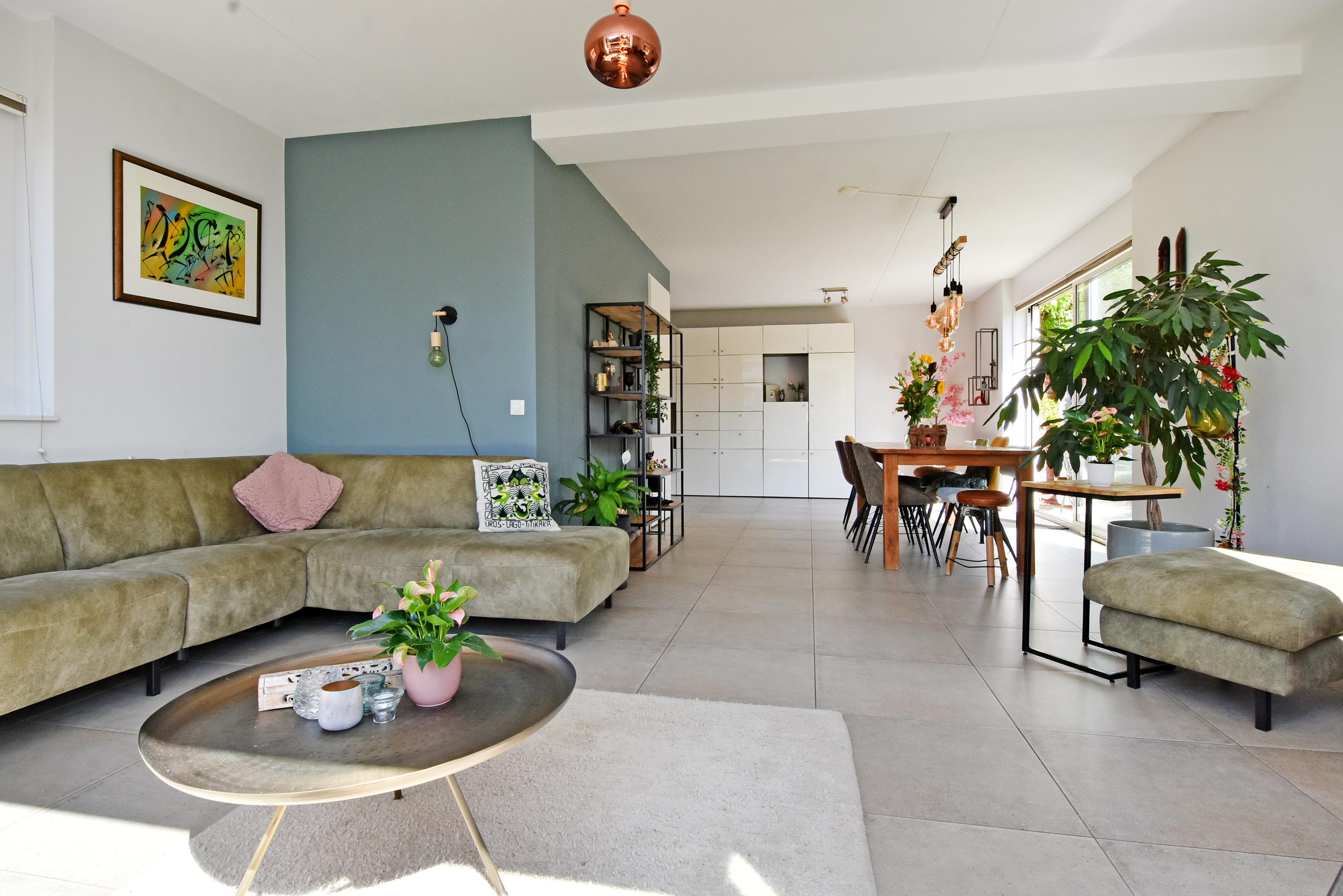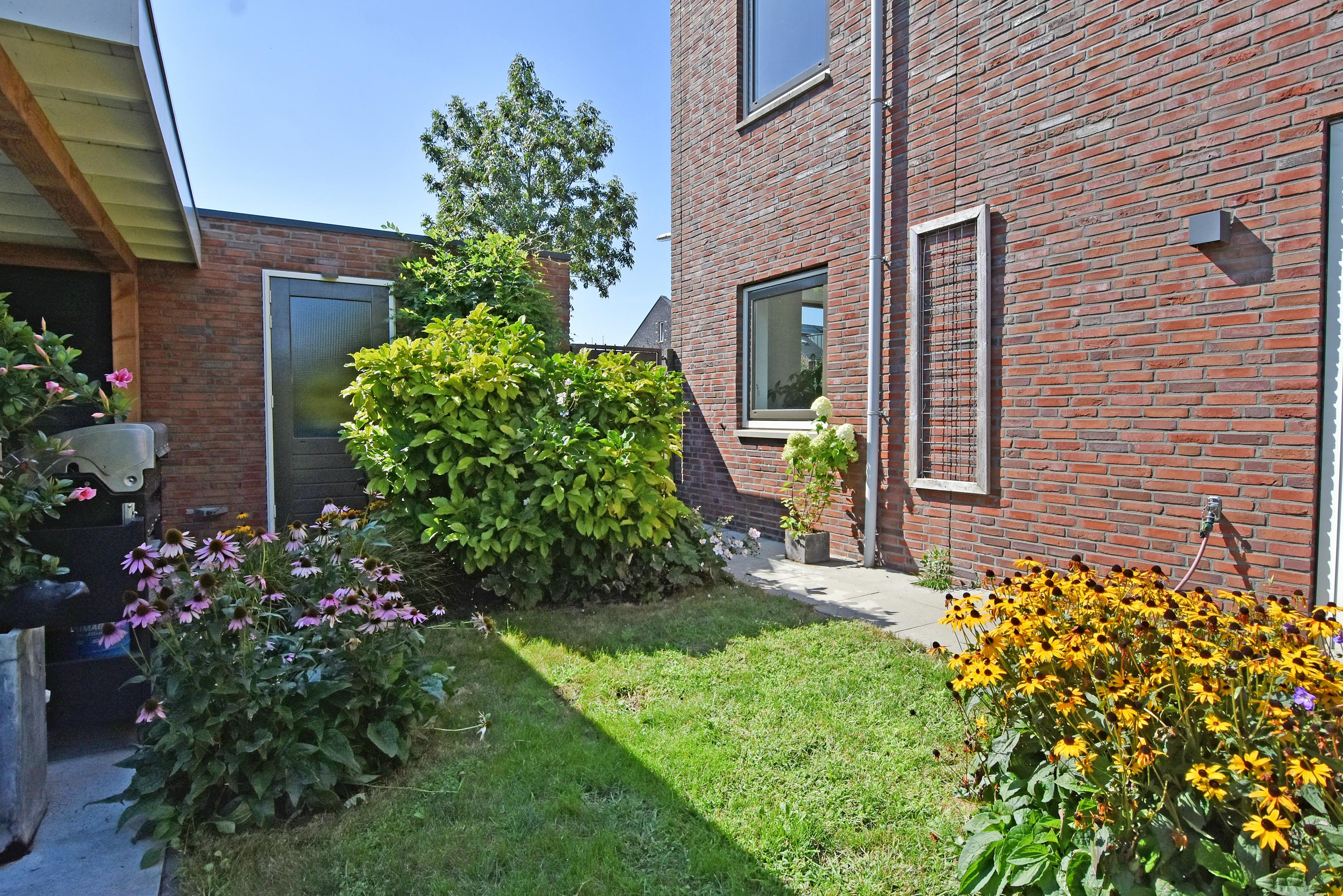 The spacious hall leads into the attractive, light-filled living room. The large sliding doors create a beautiful connection with the sunny garden. The garden has been recently landscaped and features lots of greenery, a lawn, a sunny terrace, a veranda and a canopy: a wonderful place to enjoy and relax all year round. The garden borders the water.