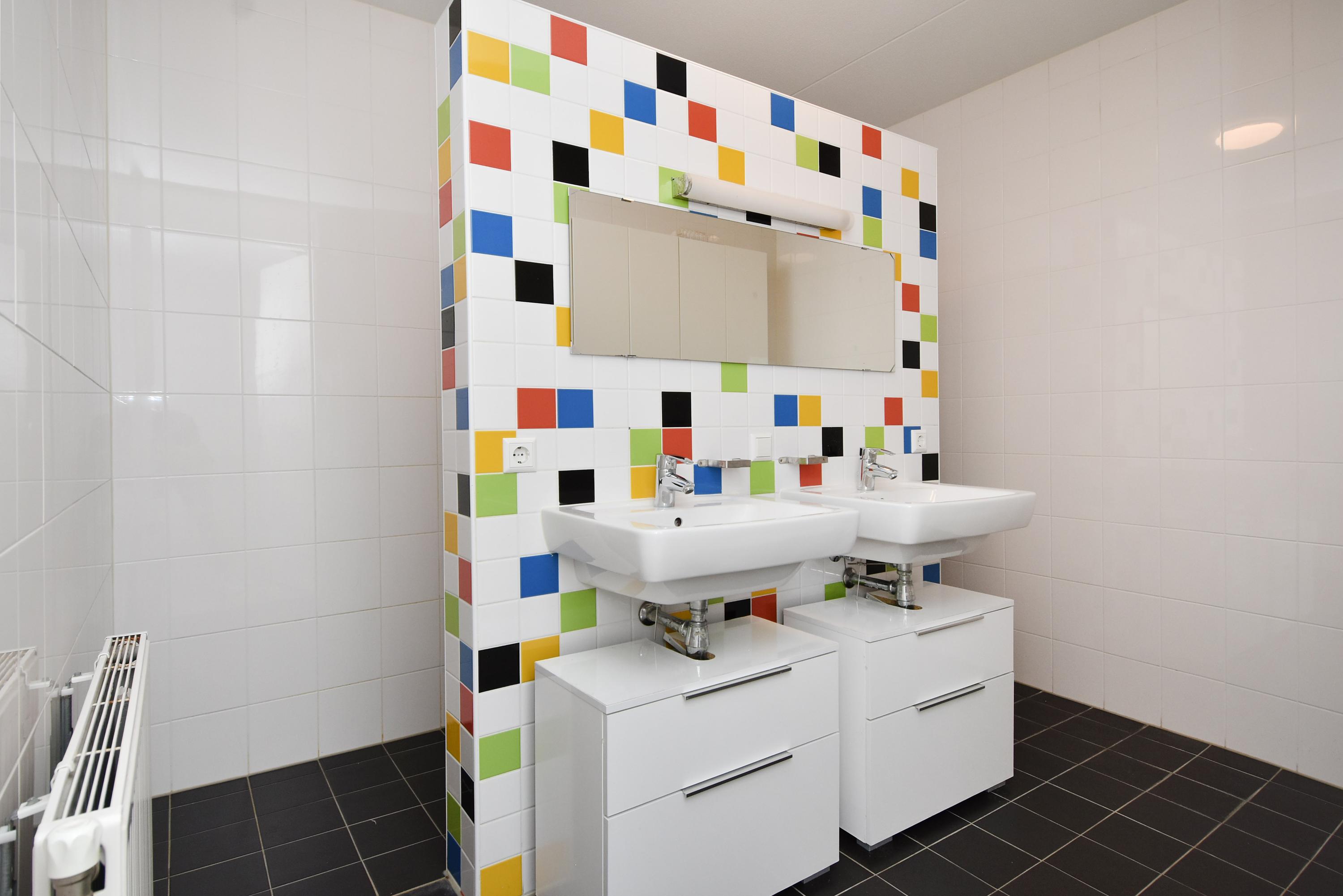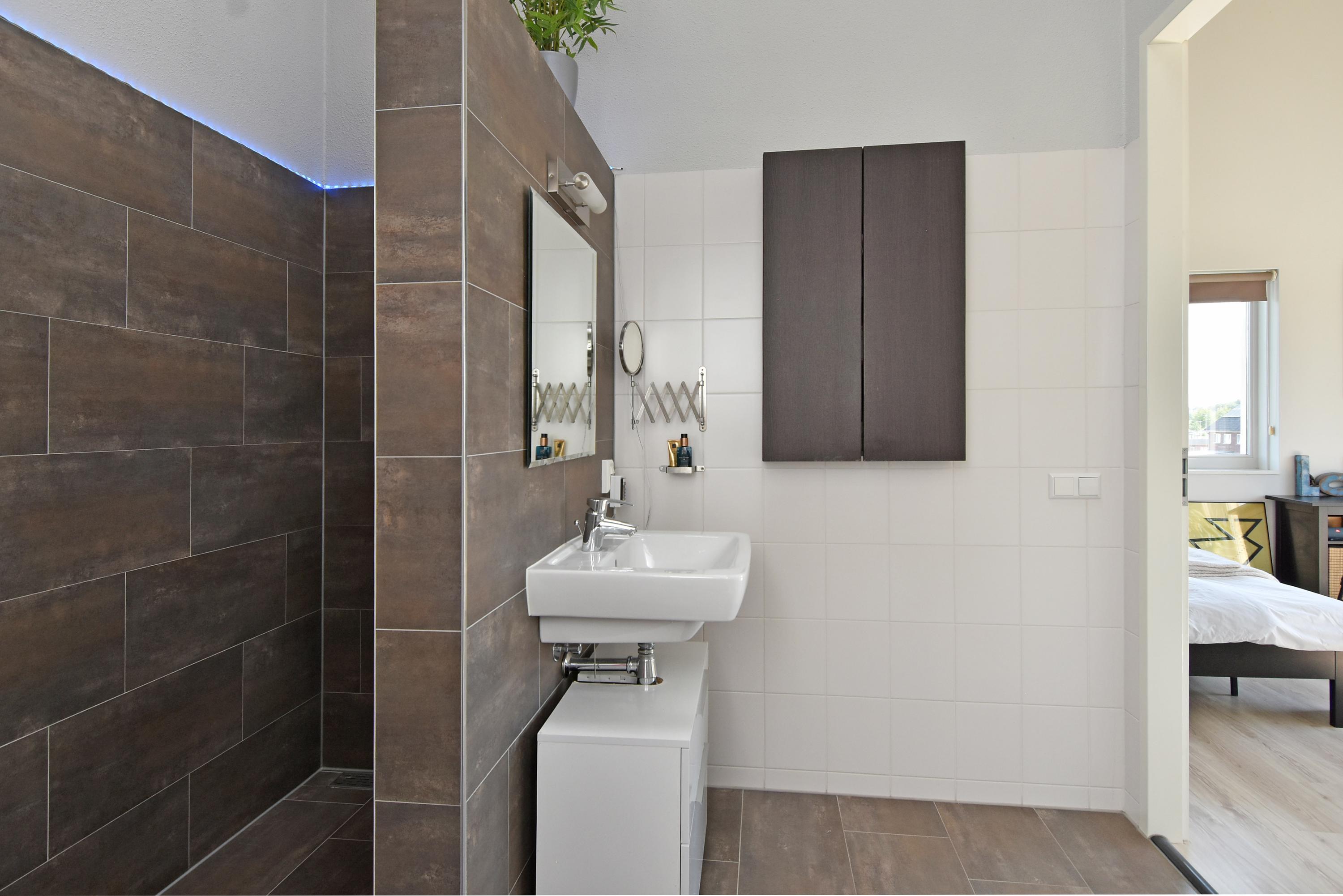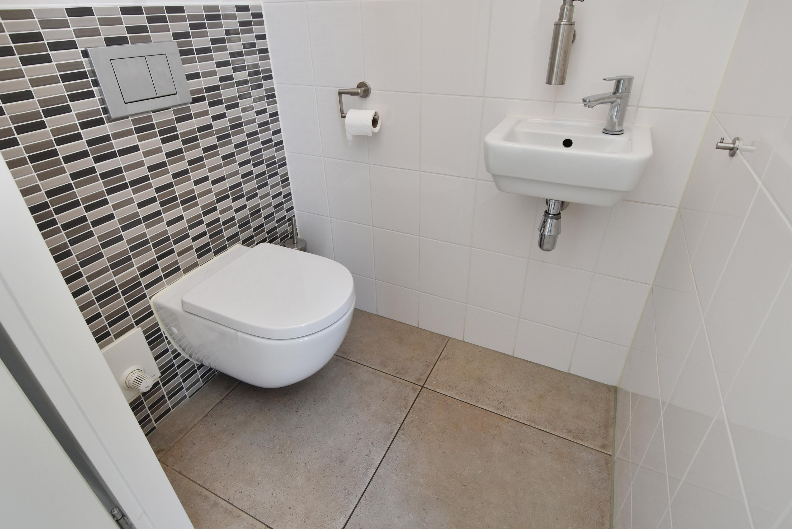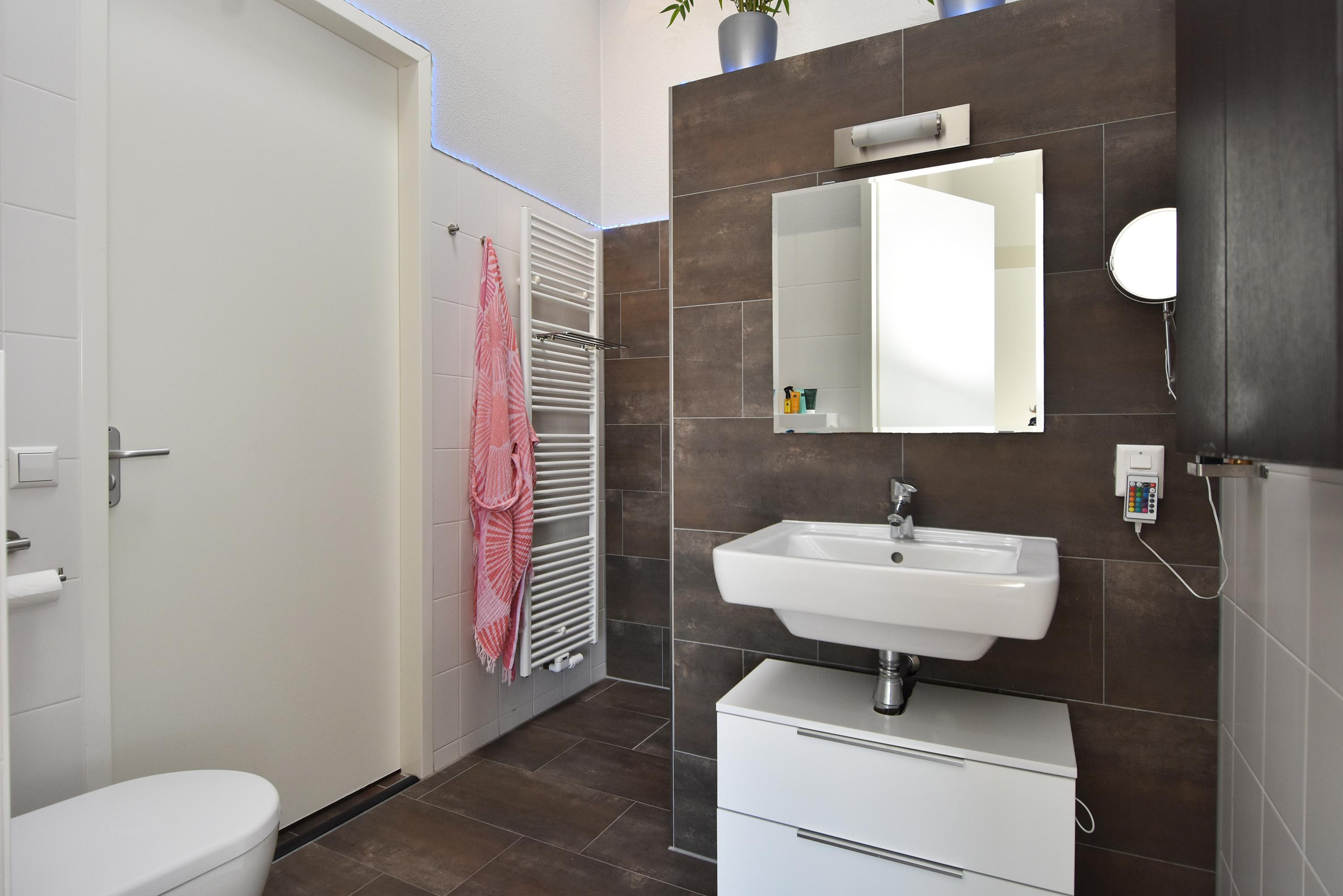 The second bathroom is modern and has a washbasin, a spacious walk-in shower and a third toilet.