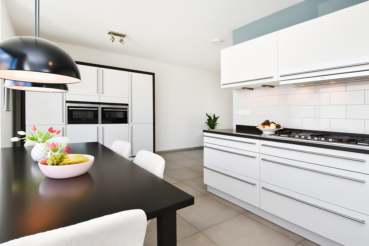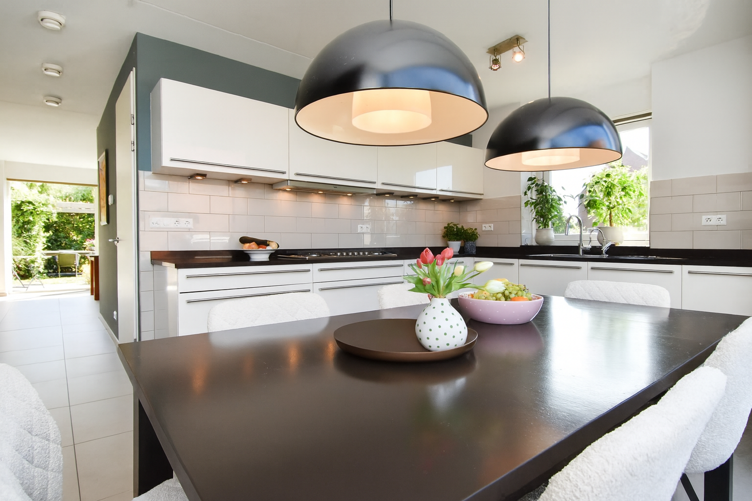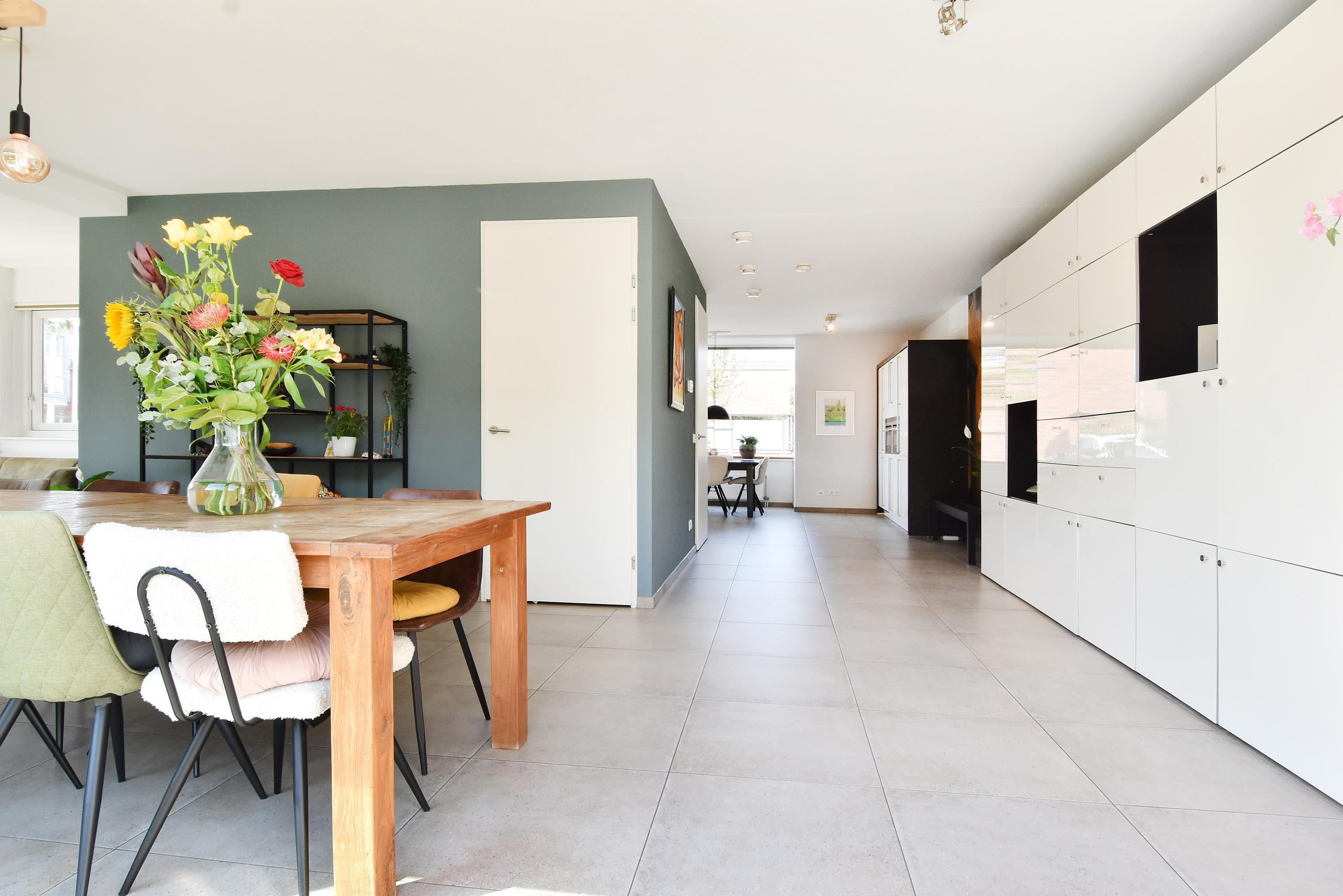 At the front, there is a modern kitchen-diner, which is arranged in a practical U-shape. Thanks to the large windows, the kitchen is remarkably light and equipped with all modern conveniences, including high-quality built-in appliances. There is ample space for a large dining table, making the kitchen the heart of the home.