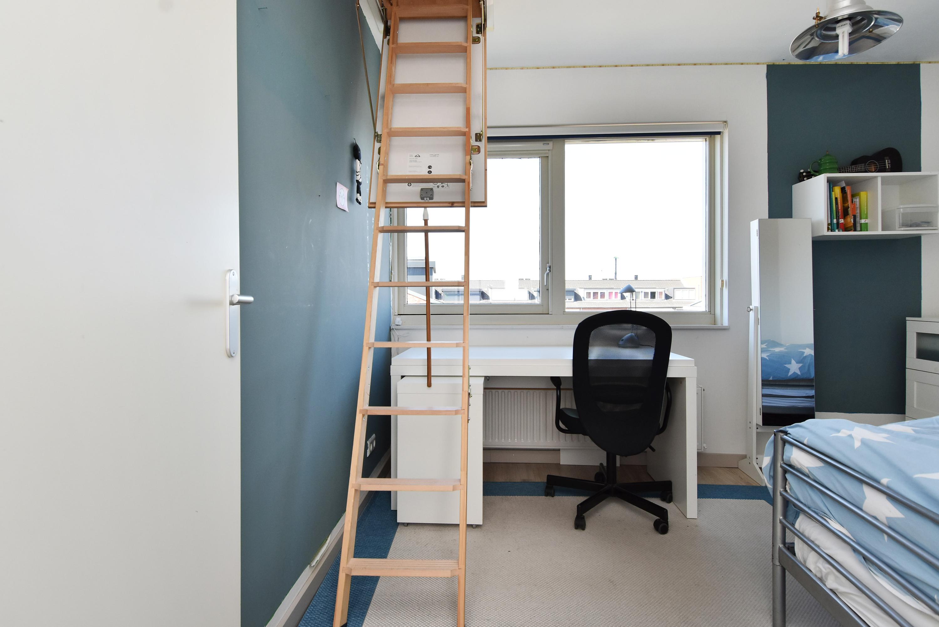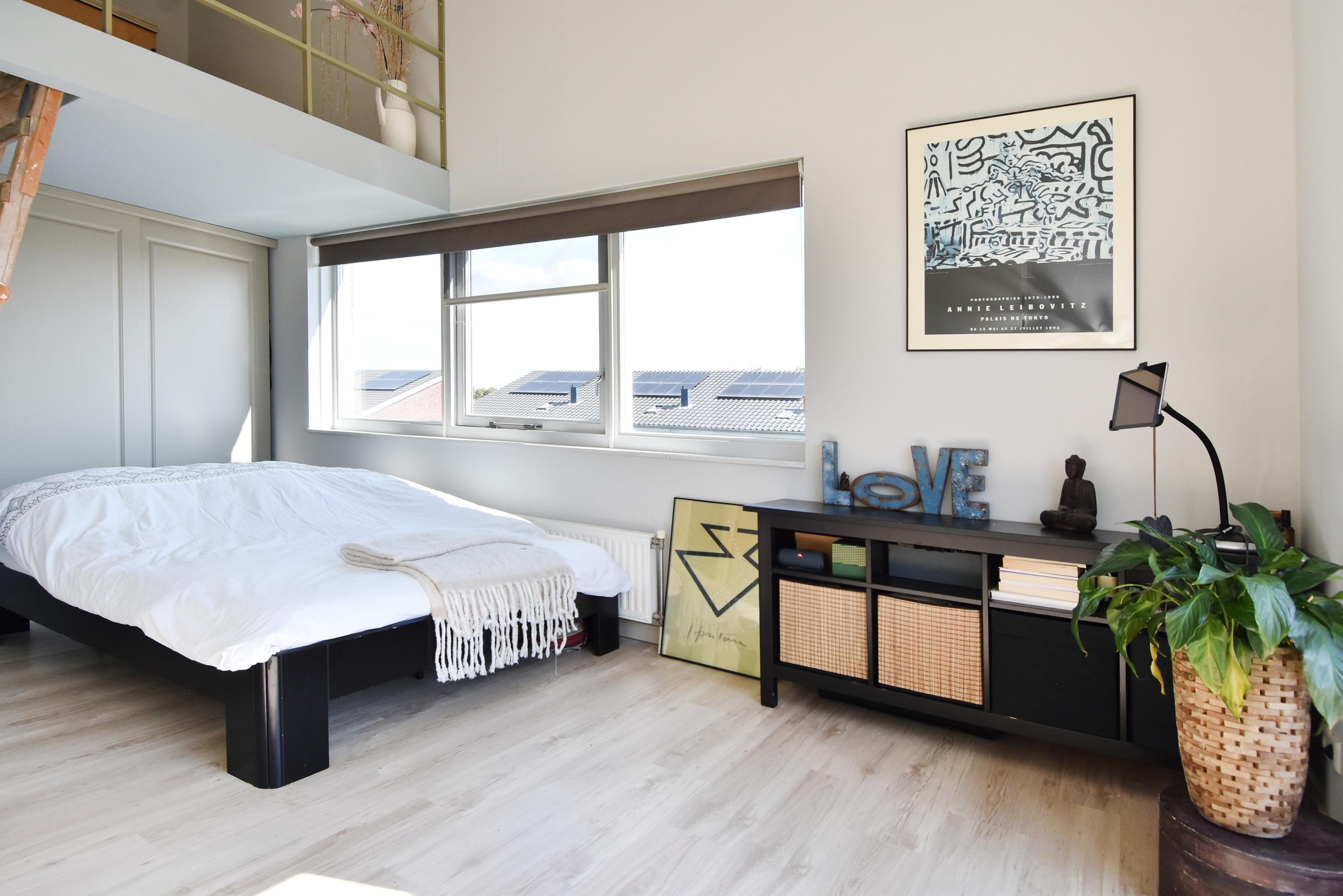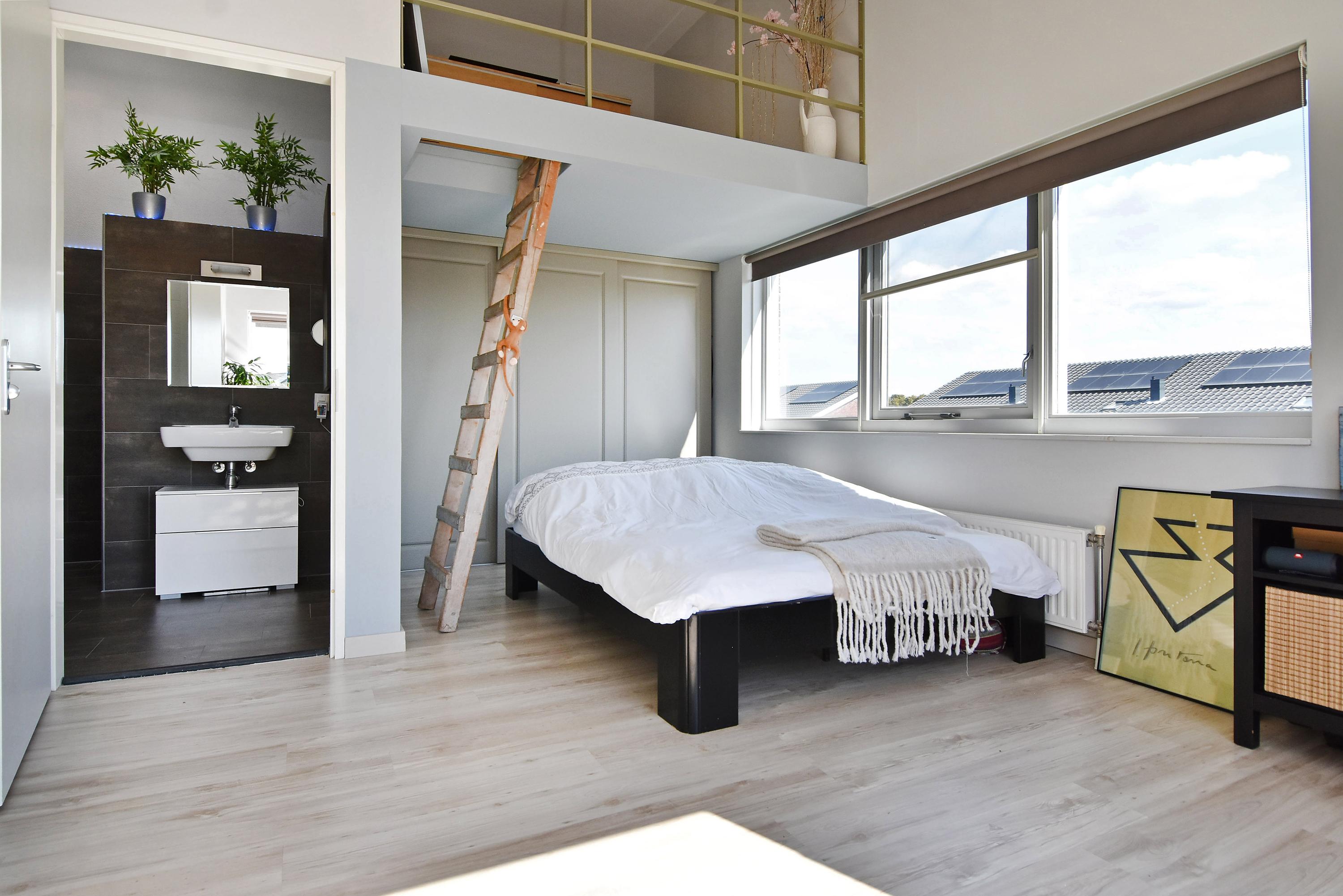 The third bedroom/studio (currently the master bedroom), which provides access to the terrace, has a playful layout with a particularly attractive ceiling height of more than 4 metres (!) with a mezzanine and loft.