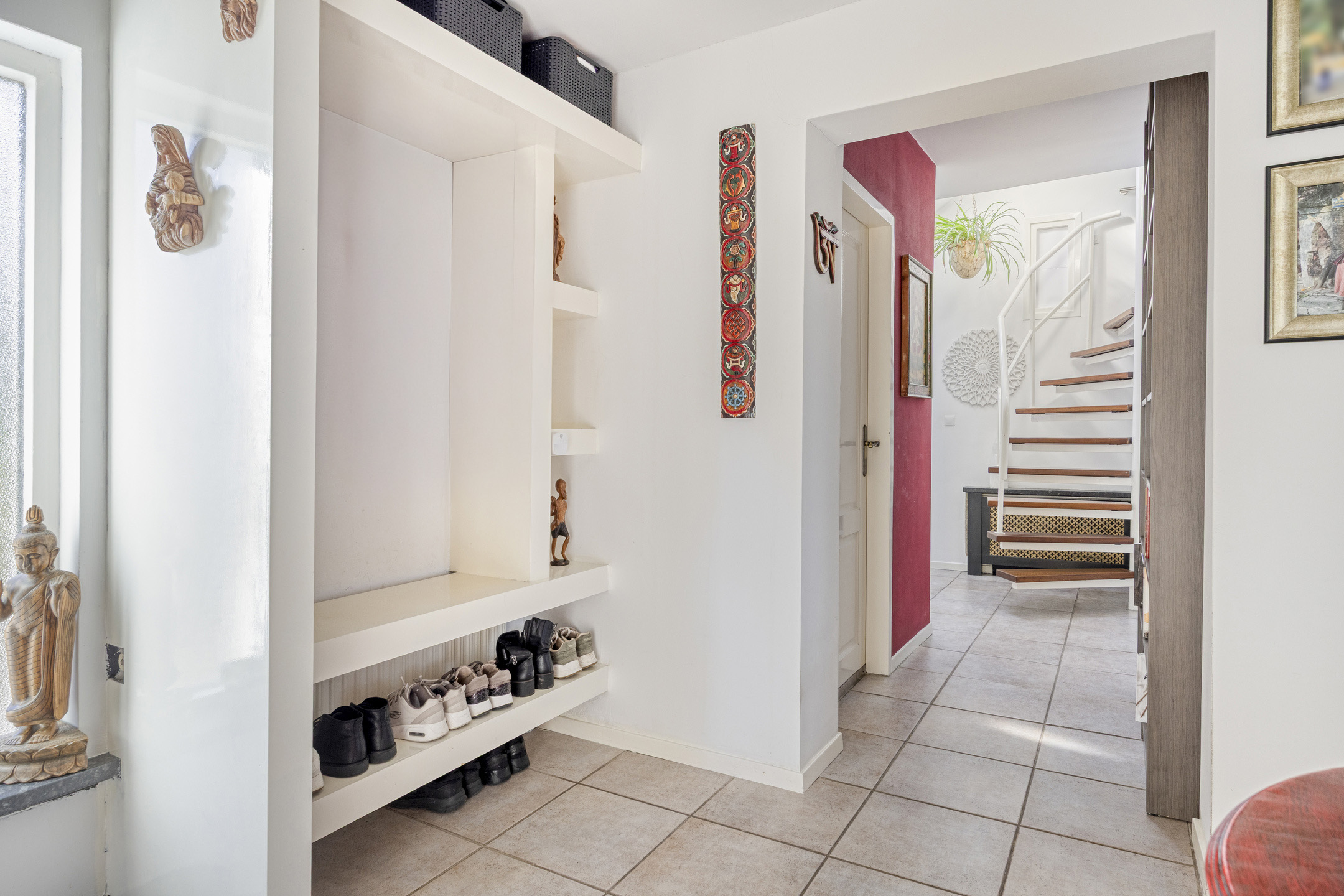 Hall/entrance in two sections with staircase to the first floor, wardrobe and utility space with HR combi boiler and washing machine/dryer connections;