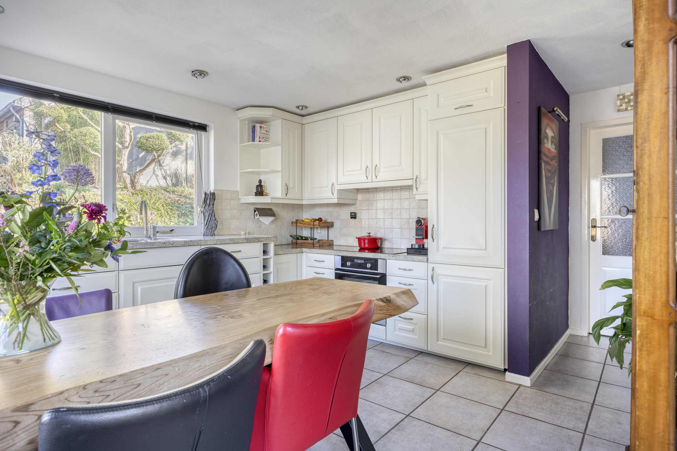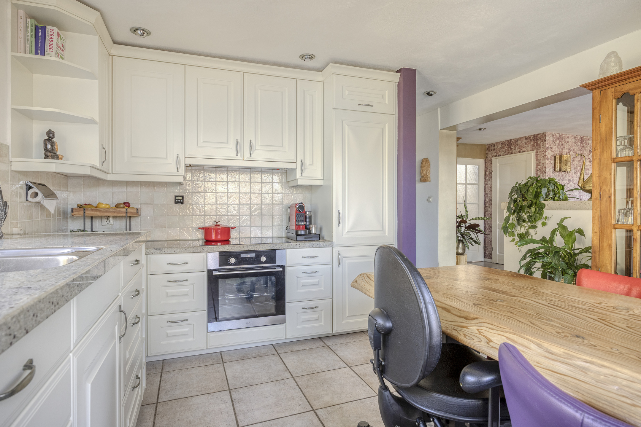 kitchen-diner with an L-shaped fitted kitchen featuring a granite countertop with 1½ sink, built-in induction hob, fridge/freezer combination, combi oven/microwave, electric oven, raised dishwasher and extractor hood, tiled wall finish, tiled floor, ceiling with recessed lighting;