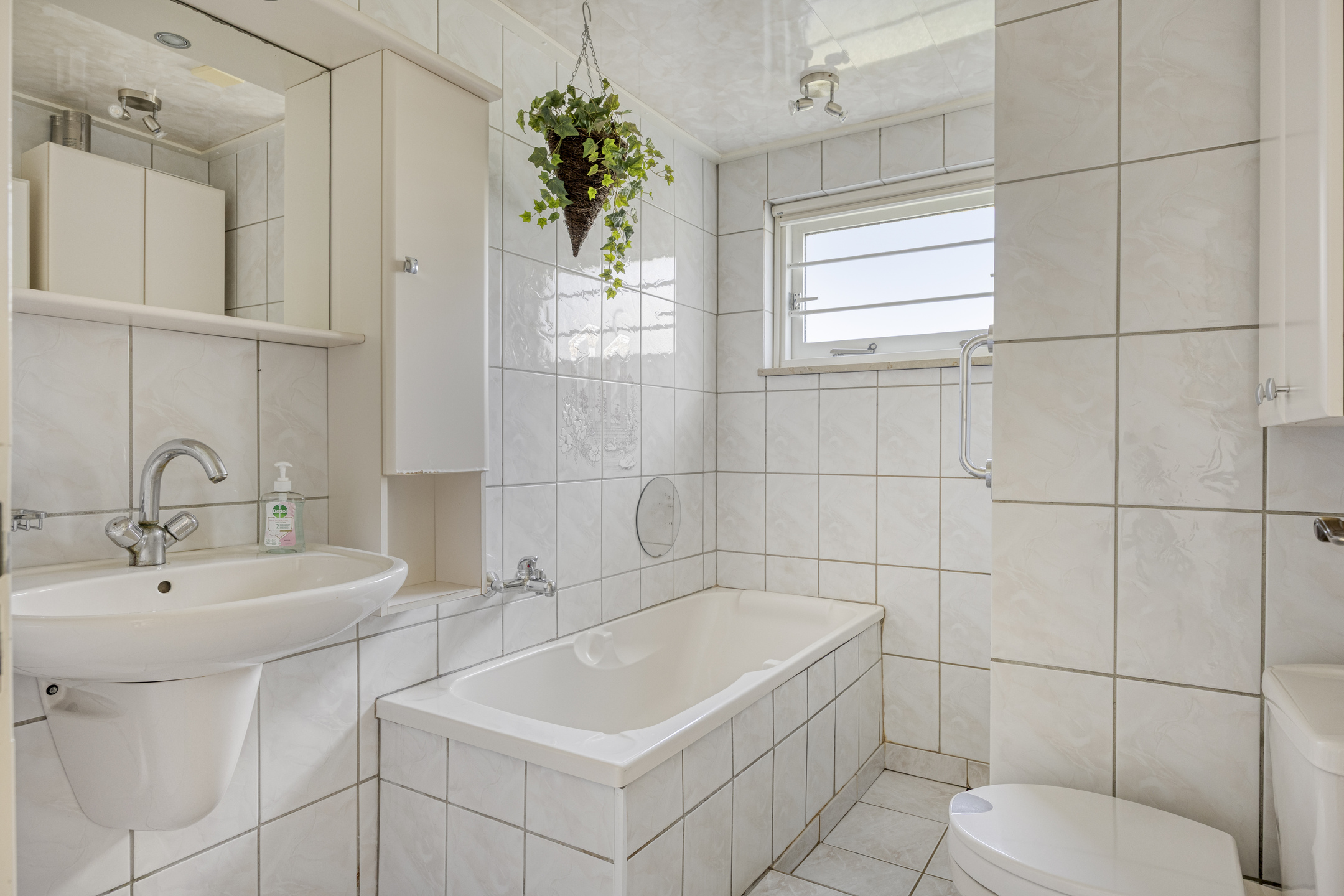 tiled toilet with washbasin;