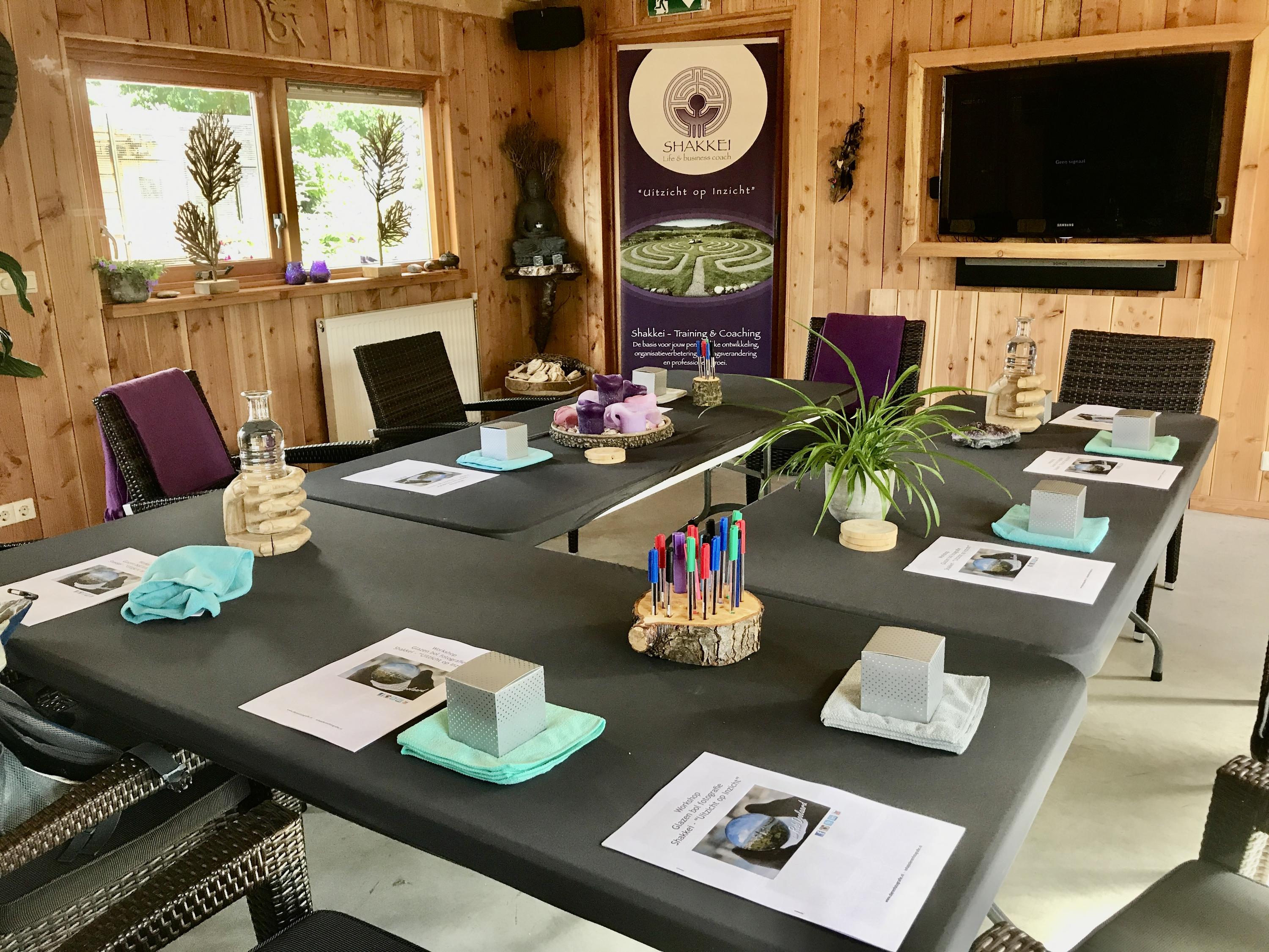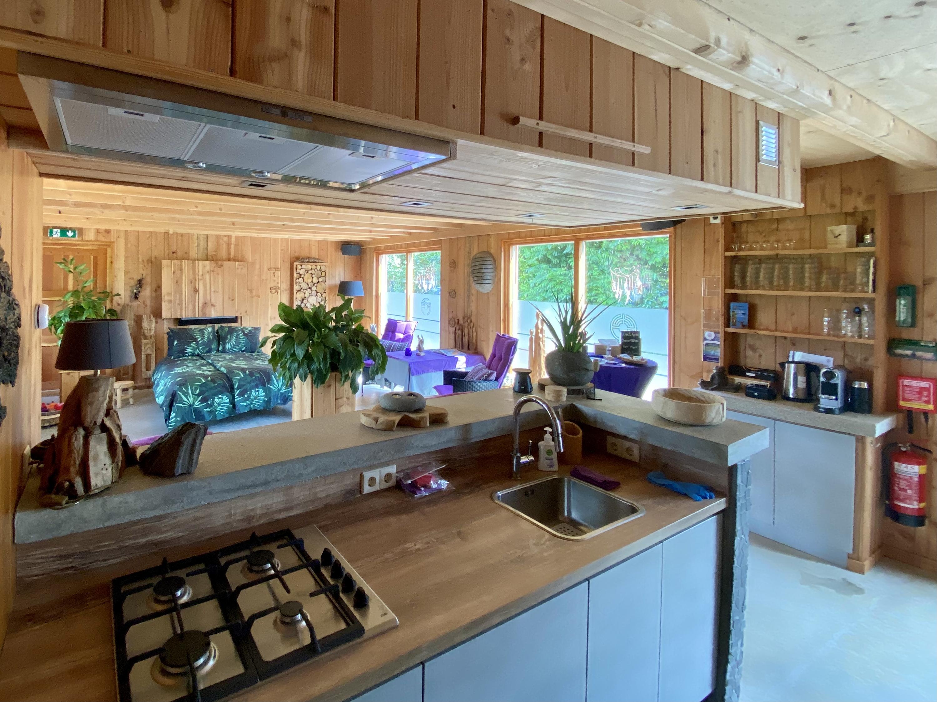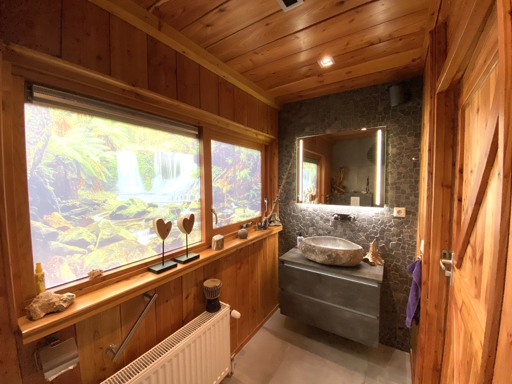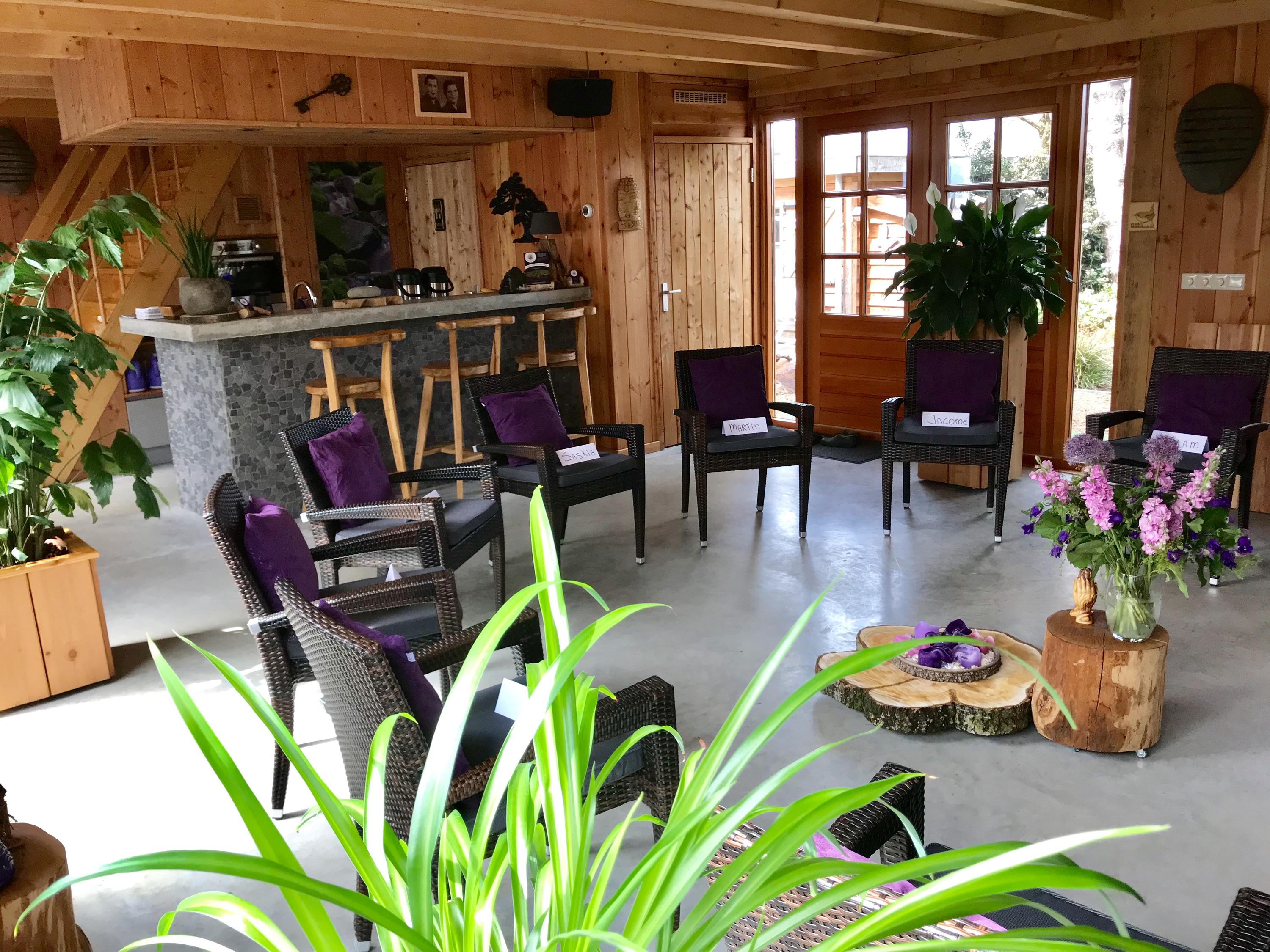 The outbuilding has recently been used for group sessions and has also been rented out via natuurhuisje.nl. The layout is practical and complete with on the ground floor a spacious living room/group area, a full kitchen and bathroom. On the first floor there is a landing with washing machine and dryer connections, its own central heating system and a second (bed)room equipped with air conditioning.