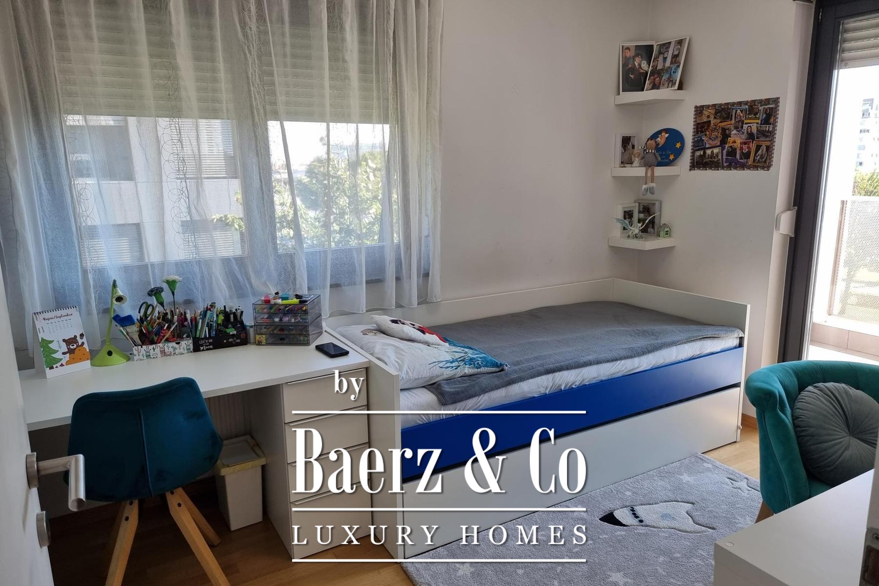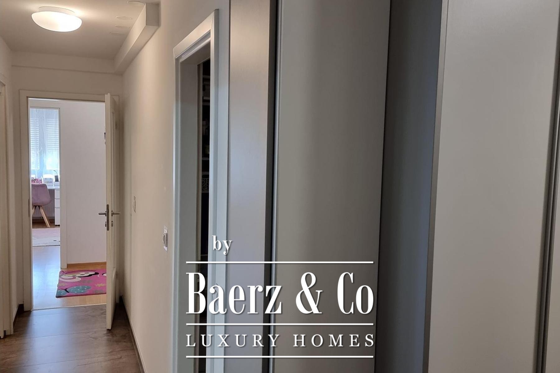 The interiors are defined by custom-made furnishings, oak parquet, and high-quality ceramics, while the living area extends to a generous loggia, welcoming natural light from east, north, and south exposures. Two bedrooms open to a second loggia, creating a rhythm of private outdoor space within the residence. The master suite includes an en-suite bathroom and built-in storage is found throughout. Finishes such as Laufen sanitary ware, Hansgrohe fittings, wooden carpentry, and underfloor heating contribute to quiet luxury, complemented by security doors, air conditioning, video intercom, and access via two elevators.