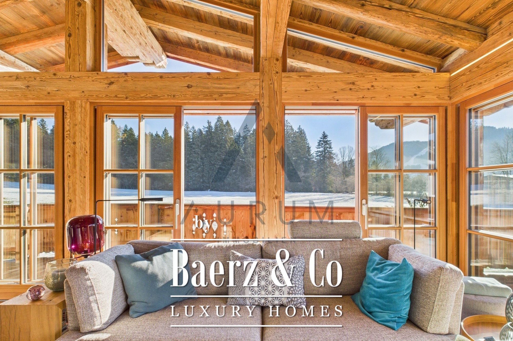 Within its 241 m² living area and 314 m² total usable space, four bedrooms and three bathrooms are complemented by two guest WCs, an office, and a wellness suite featuring a Klafs sauna with sanarium function. The open living, dining, and kitchen zone is underscored by exposed reclaimed wood roof trusses, an open fireplace, and seamless flow onto 172 m² of terraces and balconies. Finishes include oak flooring, electric blinds, and a fitted kitchen equipped with appliances from Gaggenau, Miele, and Bora.