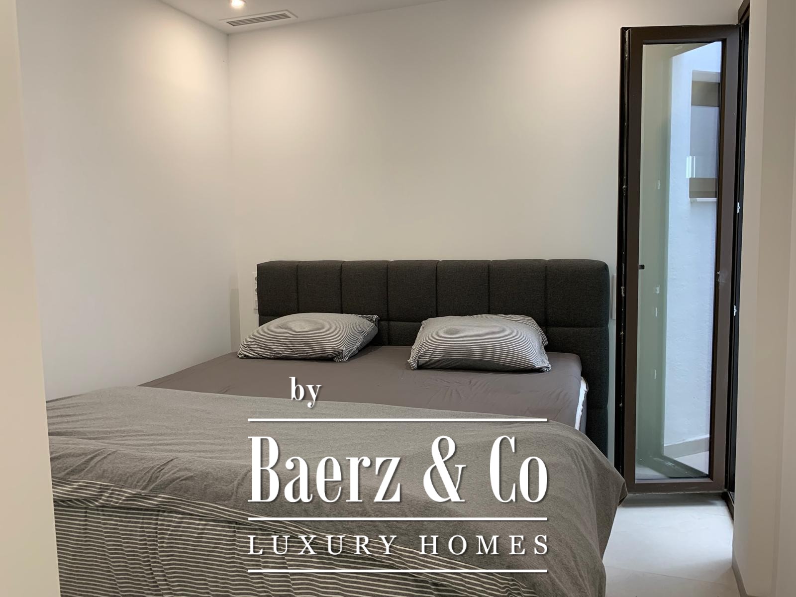 The first floor is anchored by a serene master suite featuring an en-suite bathroom with walk-in shower and a dedicated dressing area, paired with an independent toilet. On the ground floor, a fully furnished open kitchen frames the entrance, leading into an airy living-dining room. Two bedrooms, including one with an en-suite bathroom, complement a discreet guest toilet on this level.
