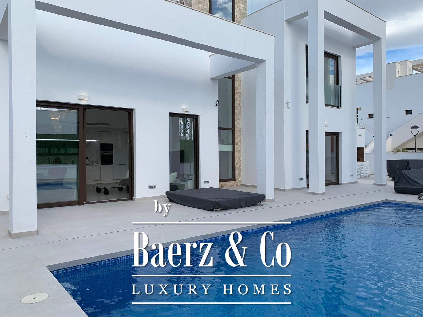 Descending to the semi-basement, a spacious lounge encourages use as a cinema room or personal gym, accompanied by laundry facilities, two further bedrooms, and a bathroom with shower. Outside, the landscaped garden envelopes a private pool and terraces for outdoor relaxation while a fenced parking area offers security and convenience. Two solariums, each with independent access, reveal broad sea and cove views, one equipped with an outdoor shower. This Finestrat villa balances clean lines, double glazing, and intelligent security within a calm residential setting.