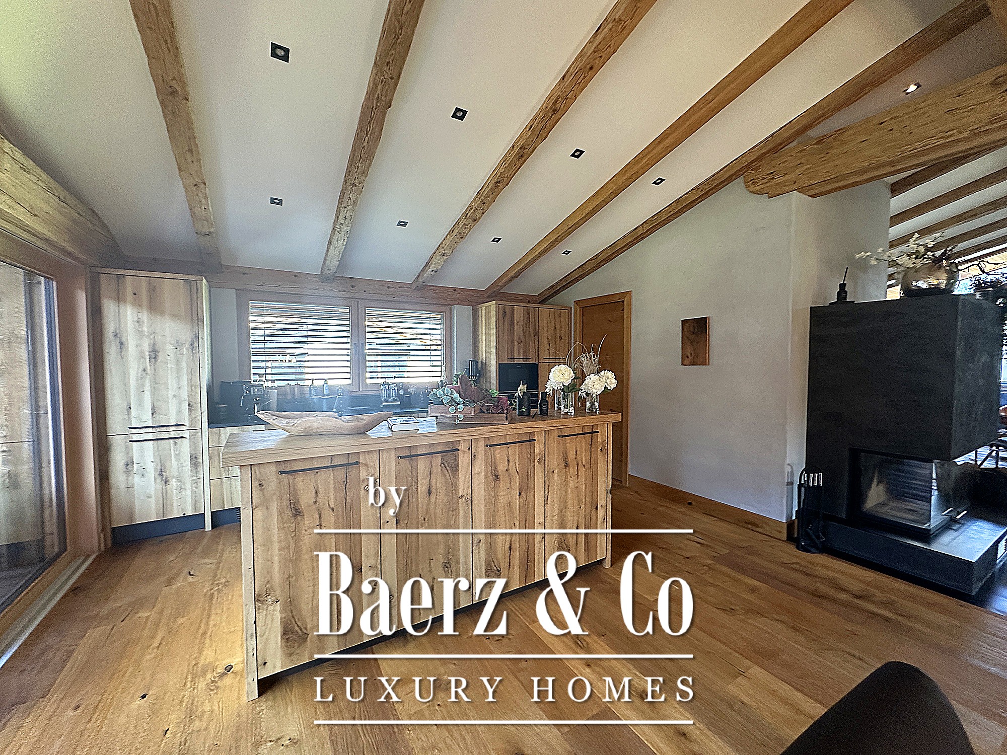 Entry is provided through the lower level, where a generous cloakroom, double garage and ample storage accommodate alpine living. The wellness suite with sauna, fitness area, shower and technical amenities further emphasizes the chalet’s commitment to comfort. A lift links all levels, ensuring seamless movement throughout the residence.