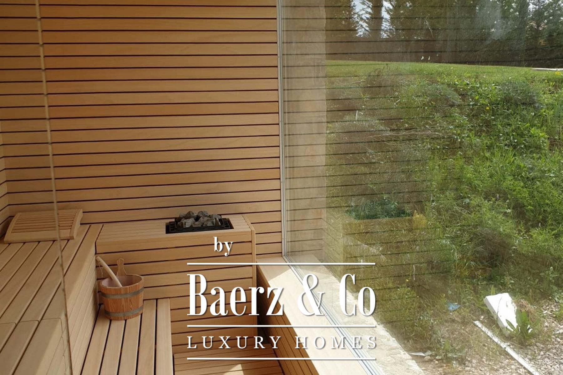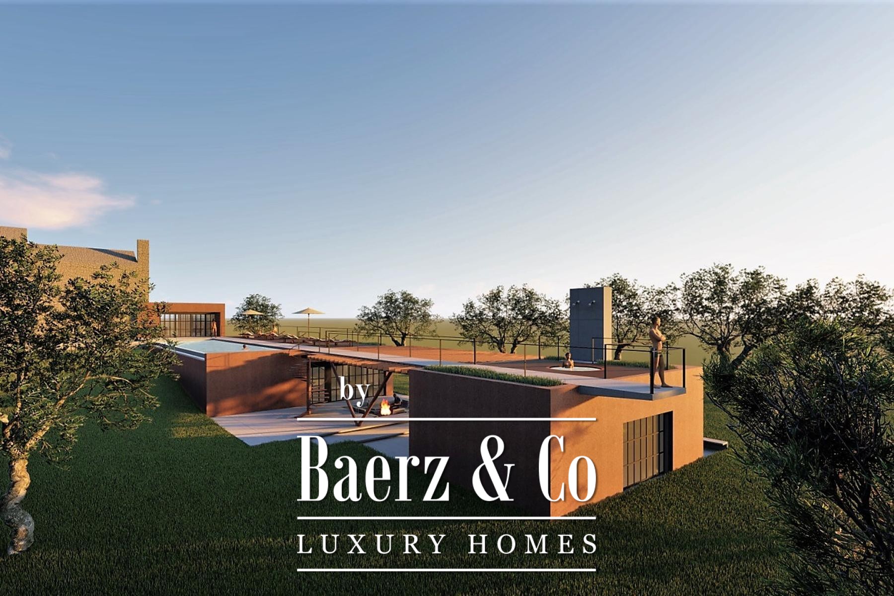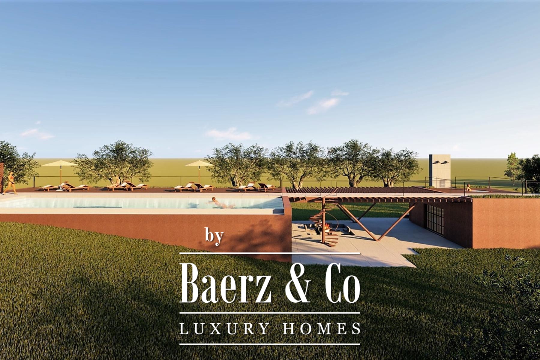 The modern building introduces elevated leisure, including a wellness area, media room, lounge space, and an 18-meter swimming pool with adjoining sunbathing terrace. There is provision for an additional poolside structure with a summer kitchen and wine cellar, offering a rare opportunity for personal customization, as the contemporary section remains under reconstruction.