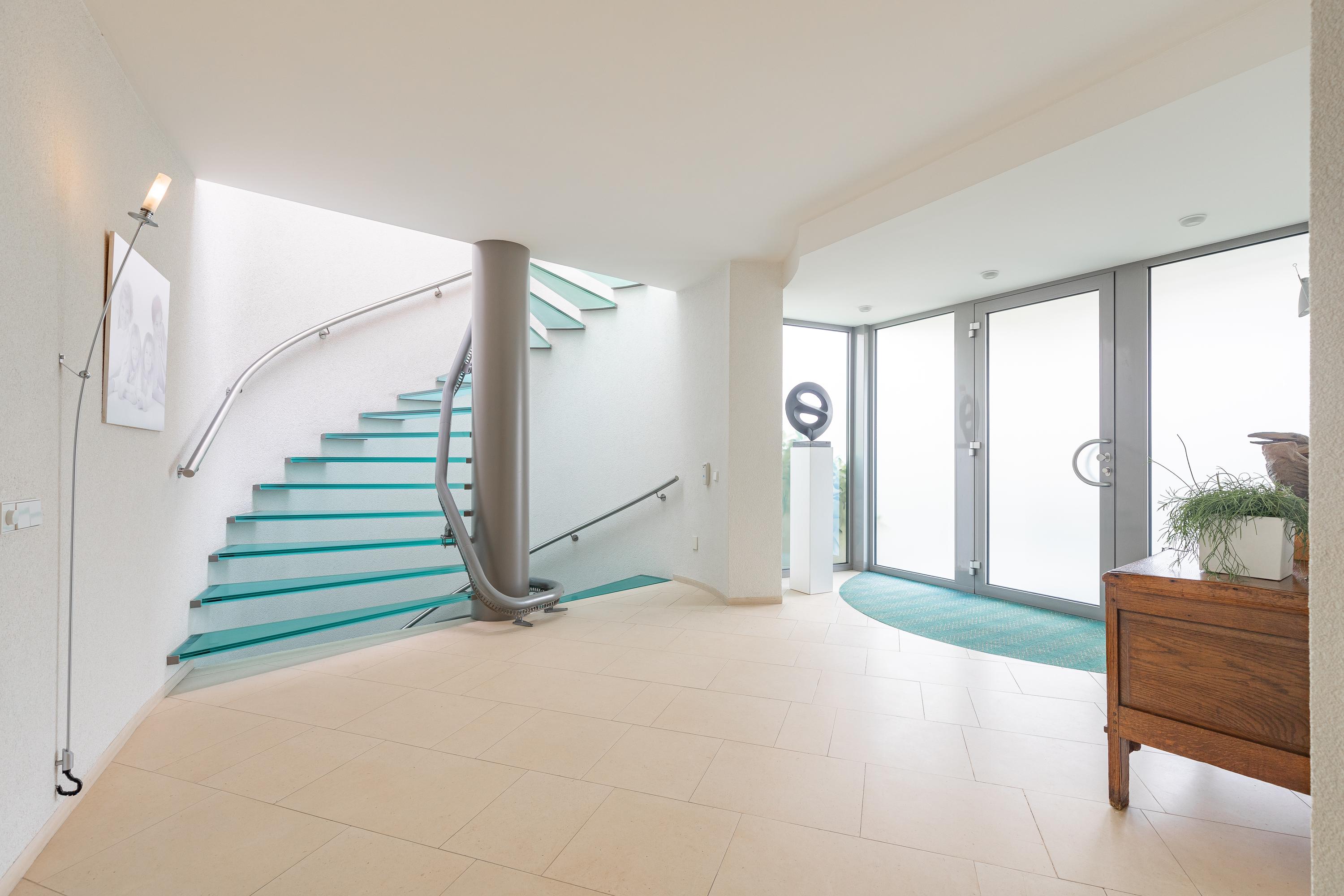 The imposing staircase is built in a circular shape and runs from the basement to the landing on the second floor. The steel tube central serves as a laundry chute and for fixing the hard glass stair treads.