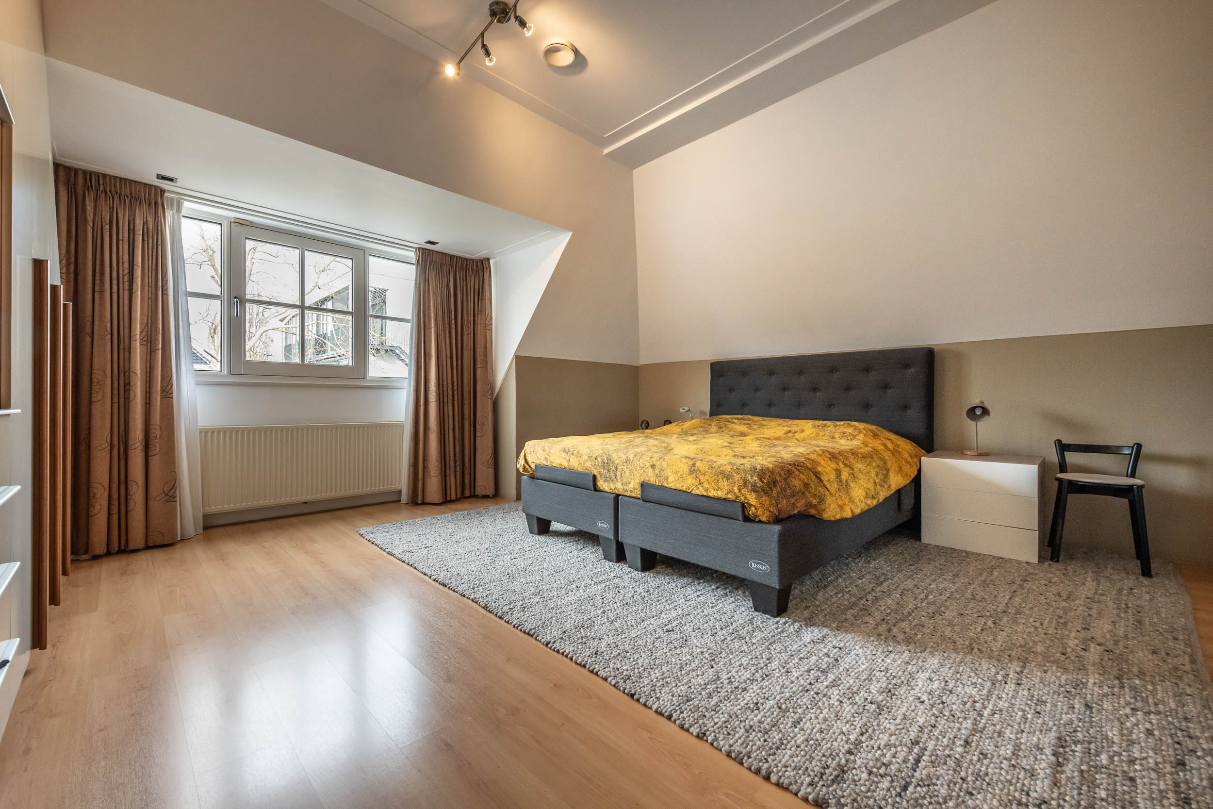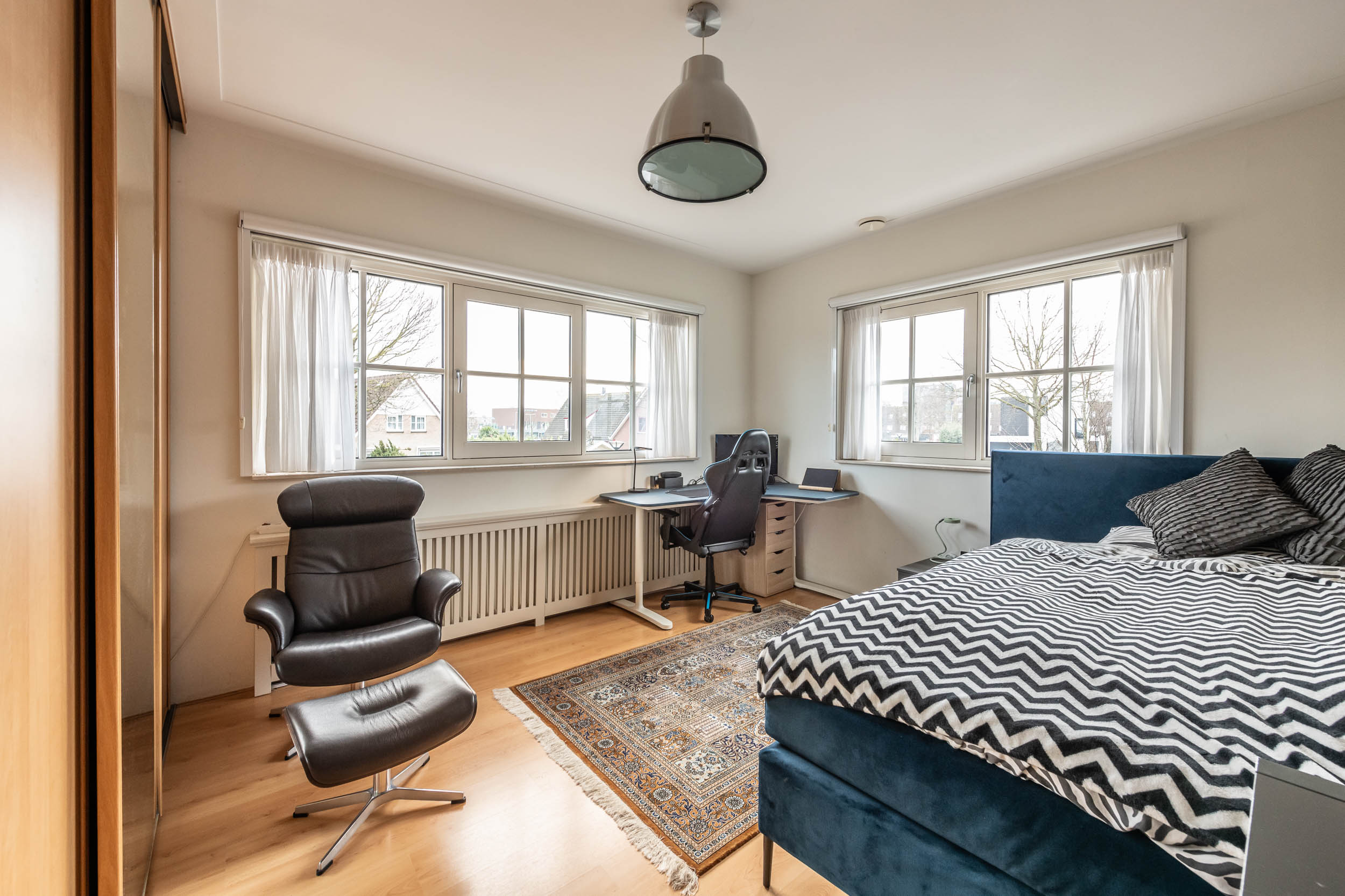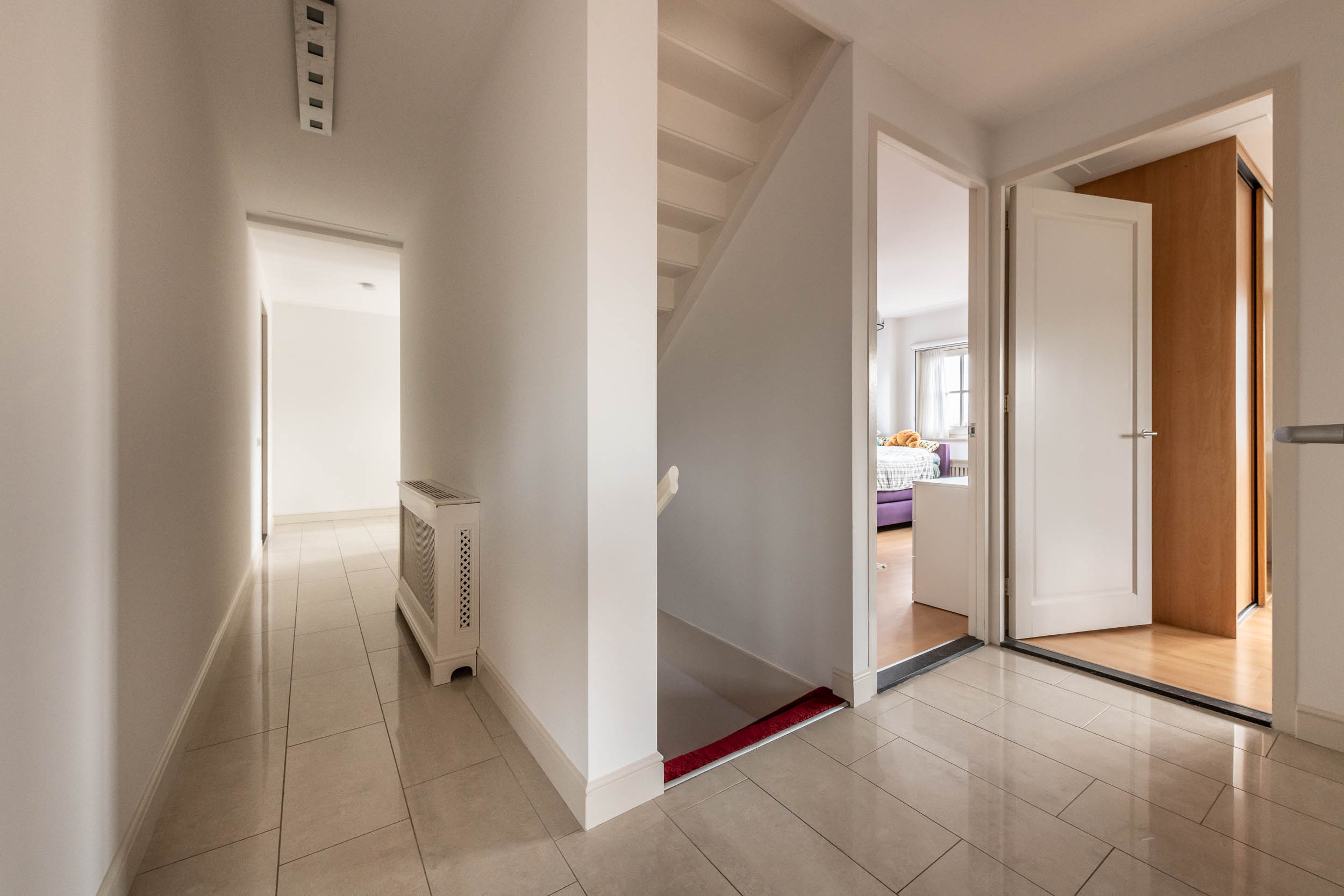 Inside, rooms are generously scaled, filled with light through large windows, and appointed for functional elegance: a SieMatic kitchen with cooking island, a living room warmed by a gas fireplace and built-in storage, and a utility room accessible from both kitchen and garage. The first floor includes four bright bedrooms, access to a roof terrace, and two sophisticated bathrooms—one with a sauna, the other with contemporary amenities. The attic provides versatile additional space and a private bedroom. Multiple international and English-language schools are nearby, and everyday needs are attended to with an installed alarm system, charging station for electric cars, and modern central heating.
