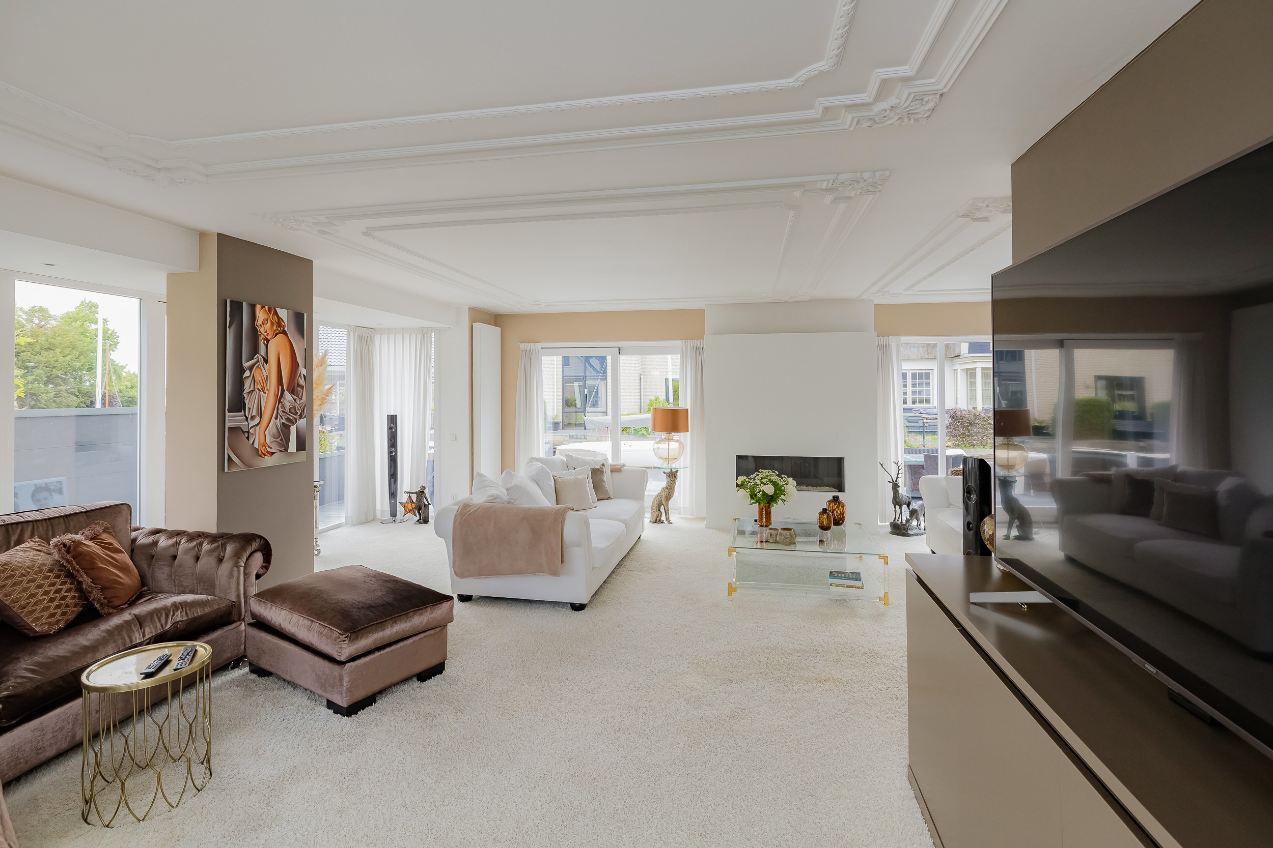 You enter the house through a generous hallway with loft and the staircase upstairs. A checkroom niche with toilet and meter cupboard provide a practical layout. The living room is spacious, bright and cozy and features a large bay window, classic decorative moldings on the ceiling and a cozy gas fireplace. Thanks to three pairs of double doors and a sliding door, the living room is in direct connection with the sunny terrace on the water.