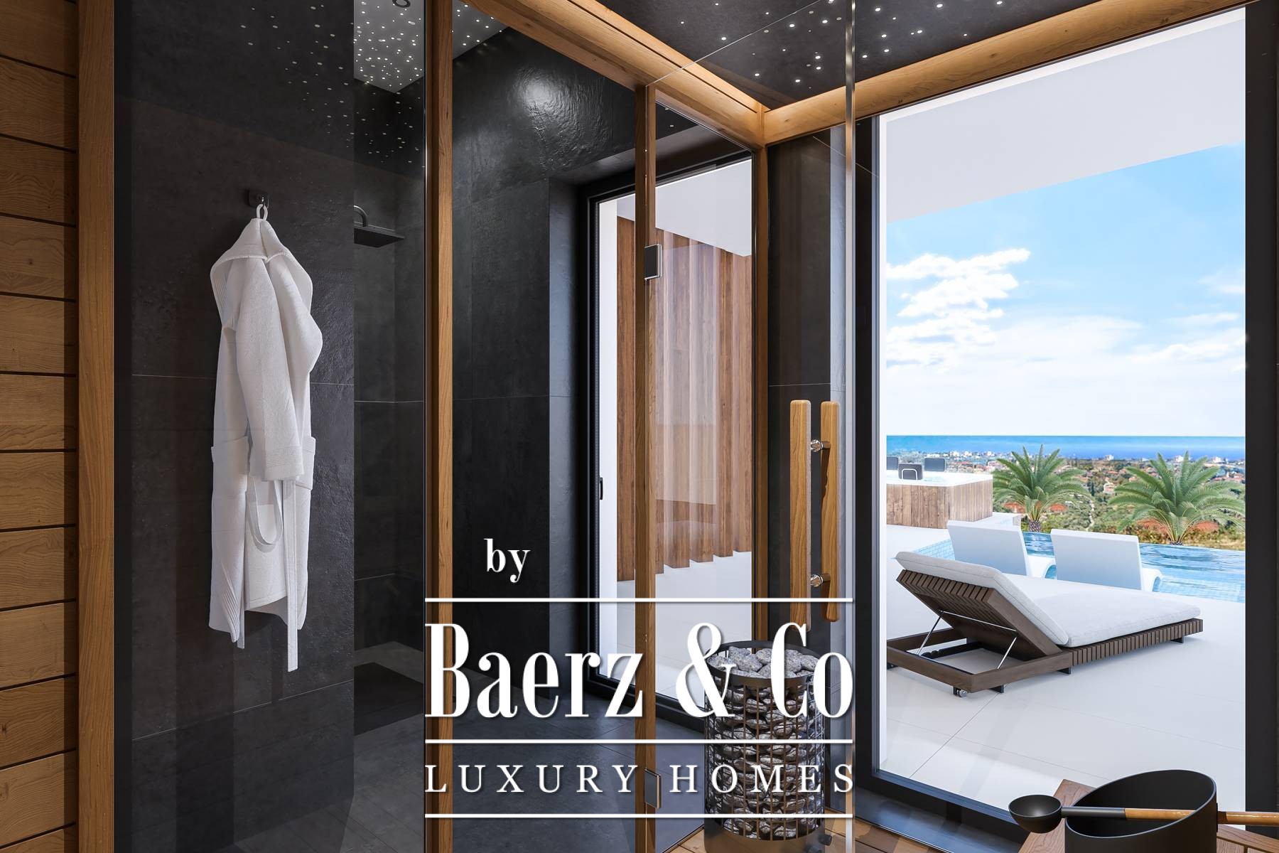 Villa Kaštelir-Labinci with panoramic sea view stands in a highly desirable area, offering an understated sense of luxury and privacy. This contemporary villa spans 516 m² of living space set on a 1019 m² plot, where clean architecture frames sweeping sea vistas. The property comprises four bedrooms, each with en-suite bathrooms, and floor-to-ceiling outlooks across the landscape. Two bedrooms offer spacious balconies with bathtubs, fully shielded for intimacy and tranquility.