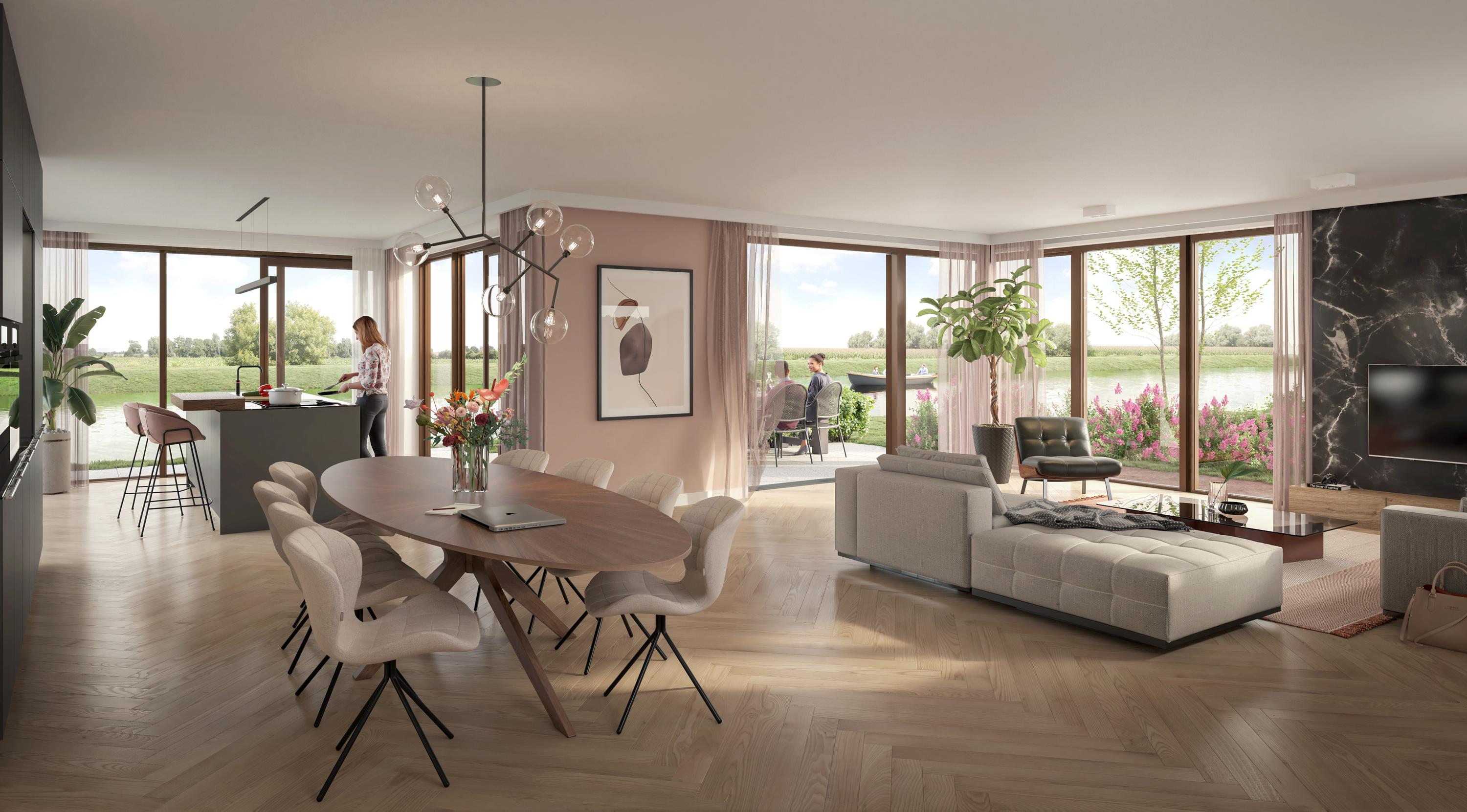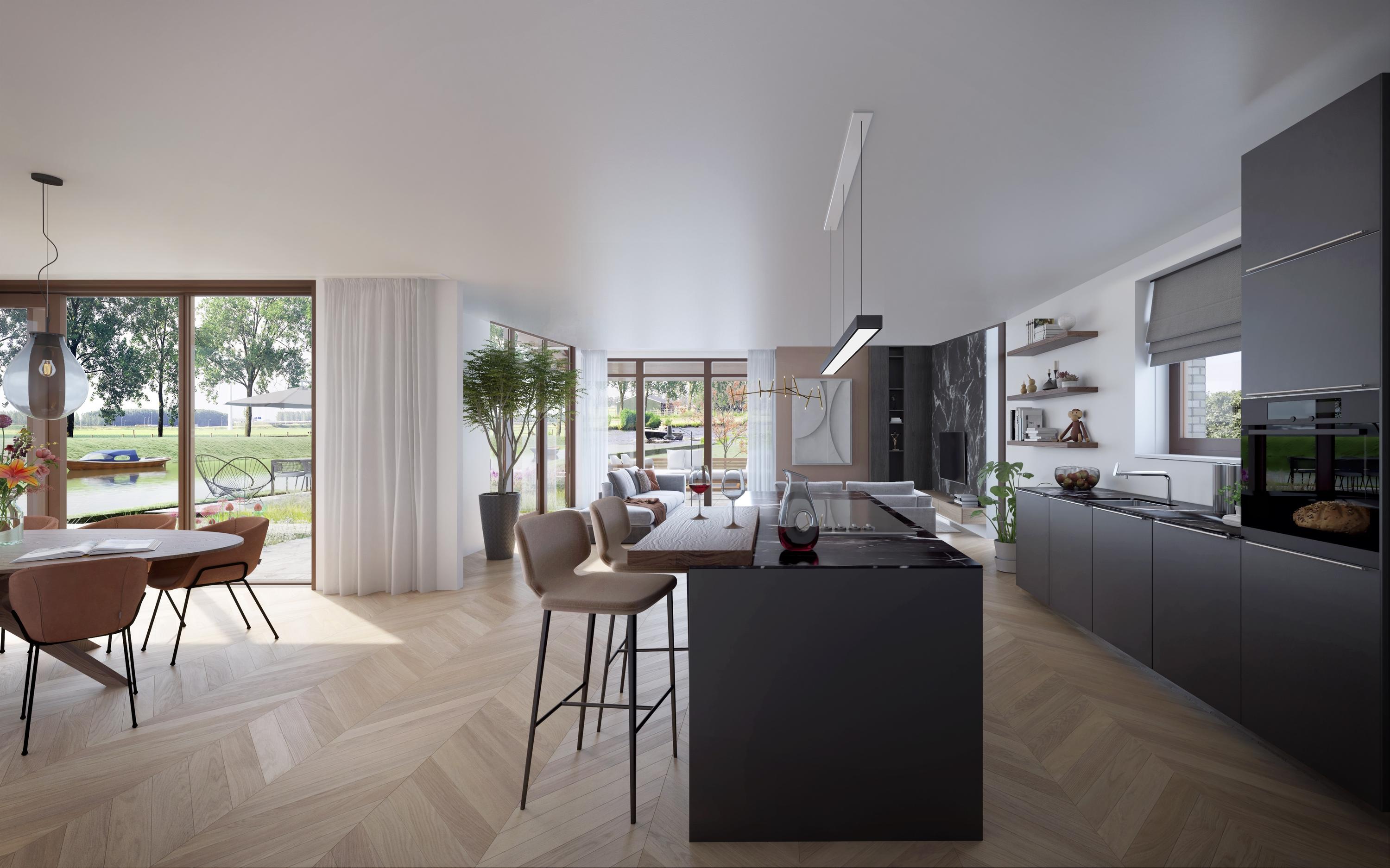 The spacious hall with loft immediately gives a feeling of space. The generous, light-filled living room has high windows with a view of the water on two sides and French doors. The beautifully built-in conservatory is the perfect place for the open kitchen. Here, indoors and outdoors merge into one another, partly thanks to the three sliding doors. You can cook and eat with a panoramic view.