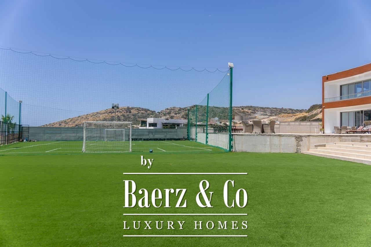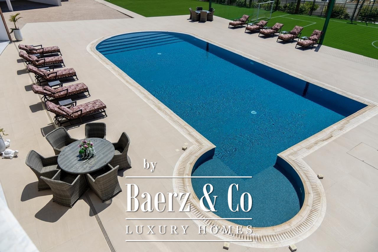 The designer kitchen, equipped with two ovens, both electric and gas stoves, a barbecue grill and advanced appliances, flows towards an outdoor covered kiosk and secondary kitchen, ideal for entertaining. Outdoors, the villa transitions into a private resort, anchored by a 53-meter saltwater pool with integrated jacuzzi and surrounded by landscaped gardens, mature fruit trees and a private mini football pitch.