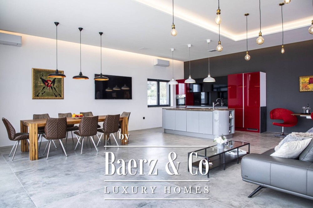 Villa Ližnjan with sea views and pool embodies a contemporary architectural sensibility just 460 metres from the Adriatic. This villa in Ližnjan offers 323 m² of living space across two light-filled floors, set on a 1,080 m² plot that connects indoors and out through expansive 3.40 metre glass walls. The main floor’s open layout, with minimal partitions, allows for a seamless transition between living areas and a kitchen that flows toward the terrace and heated pool. Unique poolside mosaic tiles glow after sunset, underscoring the villa’s focus on subtle luxury.