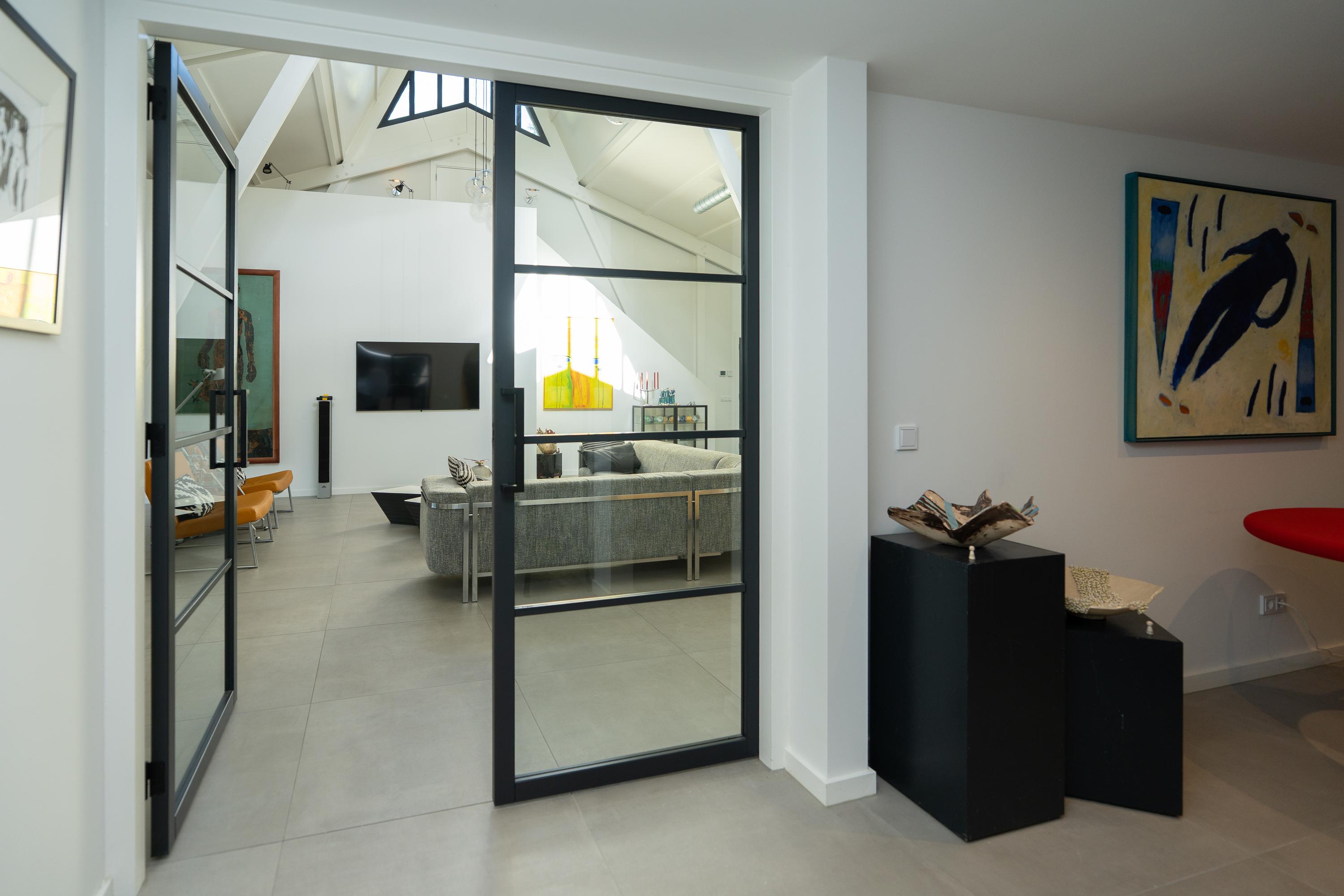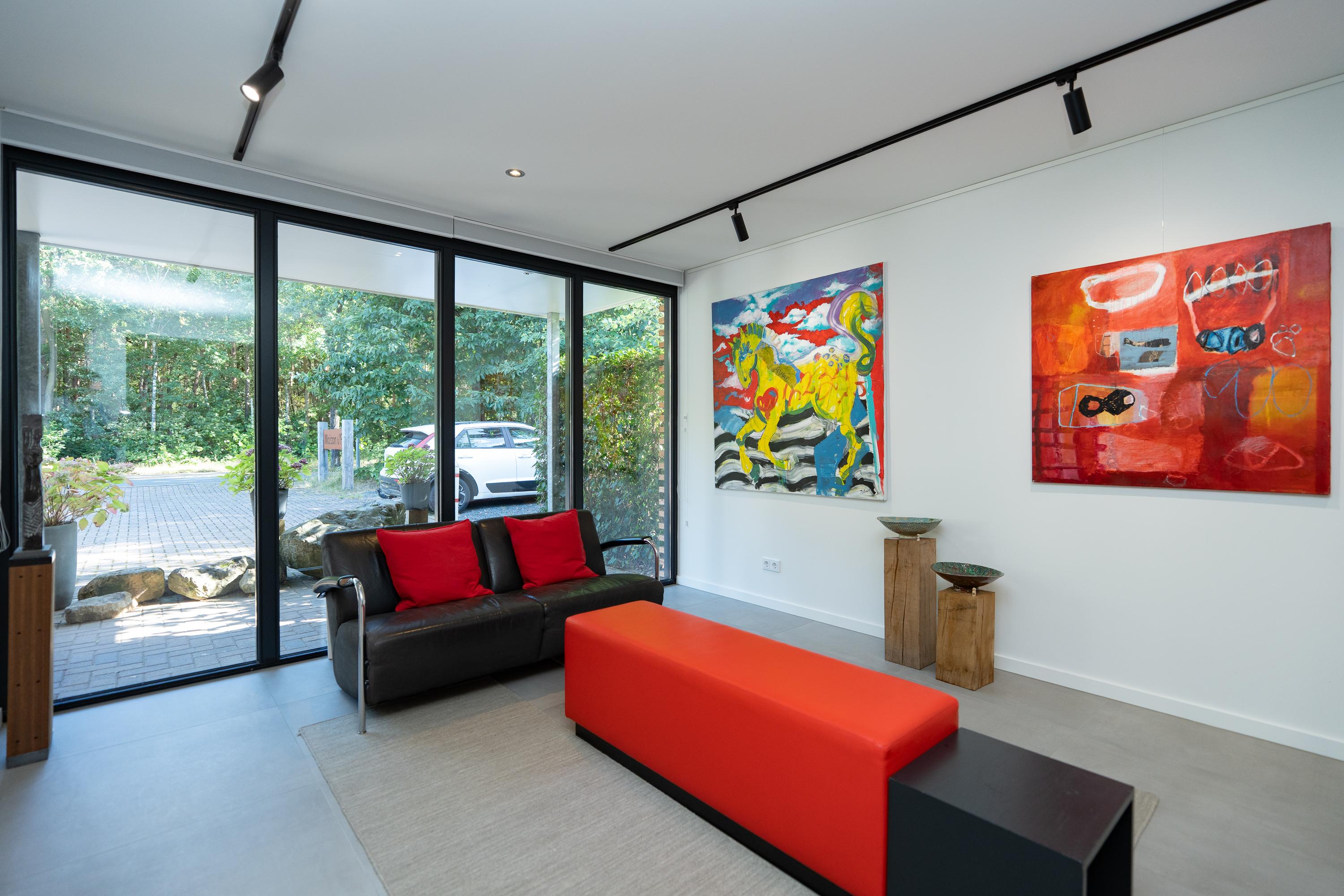 Entrance hall, spacious hall that immediately emphasises the spacious character of the house. The hall contains the meter cupboard, loft and the first toilet with washbasin. A spacious living room with high ceiling, where the many windows on all sides provide beautiful light and an open atmosphere. There are sliding doors to the front and back gardens at both the front and rear. There is also a spacious indoor storage room under the stairs and the staircase itself is beautifully concealed. Modern open kitchen with a large cooking island. The tall cabinets are beautifully concealed in the wall and the kitchen is equipped with various luxury built-in appliances. The utility room is located at the front of the house and has a kitchen unit, heat pump and boiler, and an extra outside door.