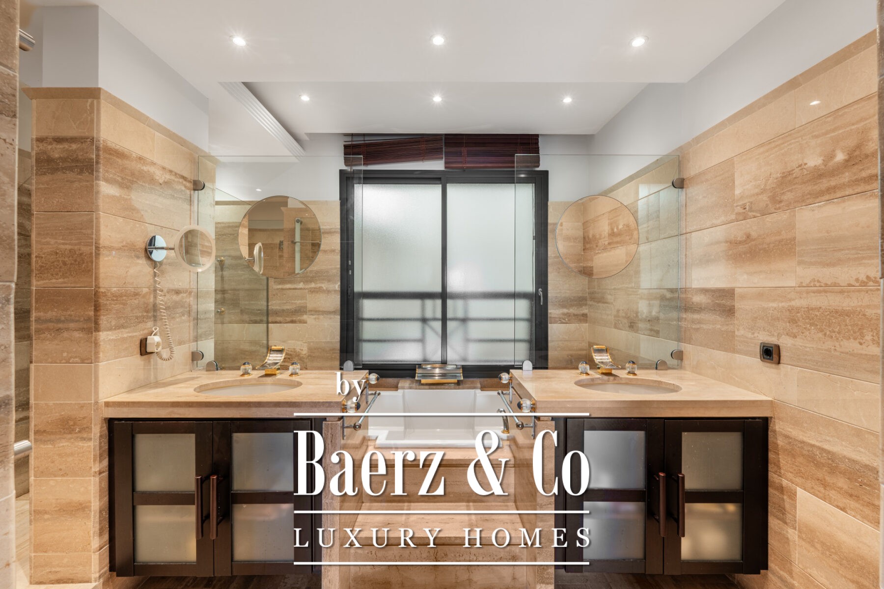 The apartment’s core comprises three bedrooms, each with en-suite bathroom. The primary suite combines a dedicated walk-in closet and a private terrace, offering breathtaking sea views. Two additional guest toilets provide further convenience for both residents and visitors.
